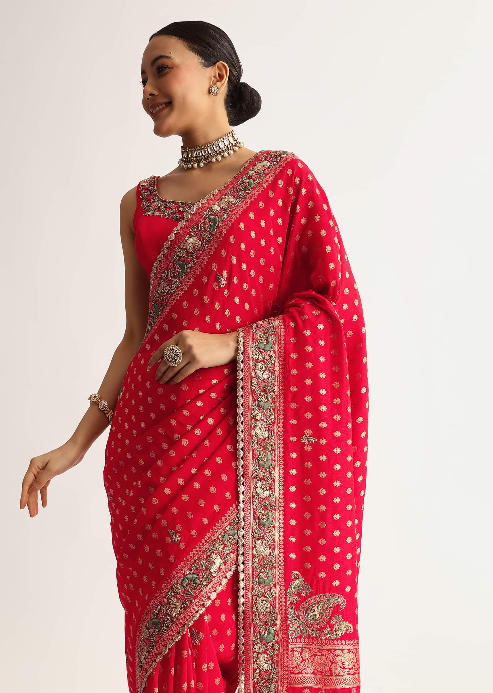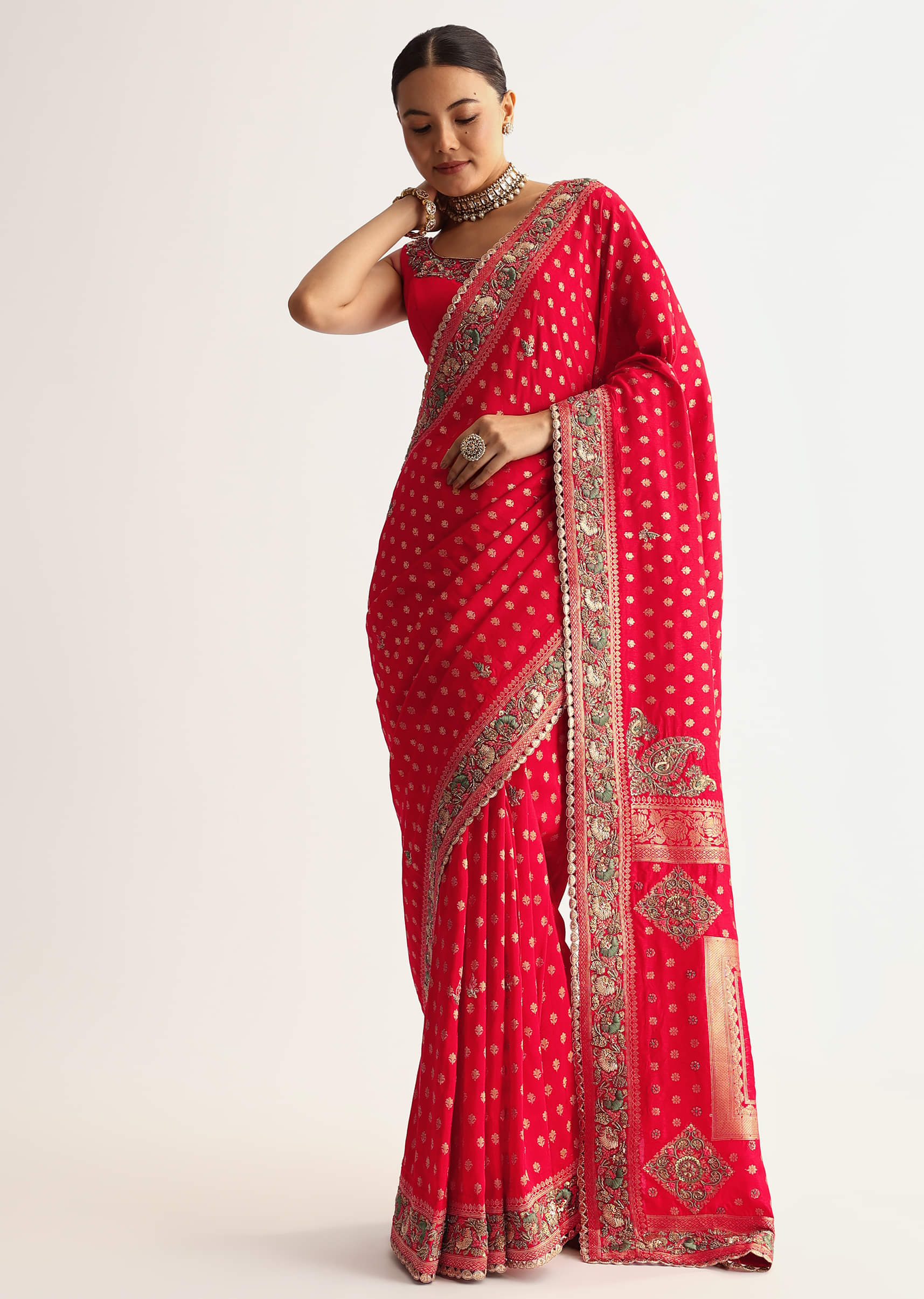 This red silk saree features a heavy embroidered border and pallu with sequins, zardosi, and resham thread work. Zari butti is woven all over the saree for an ornate appeal.... More Product Details