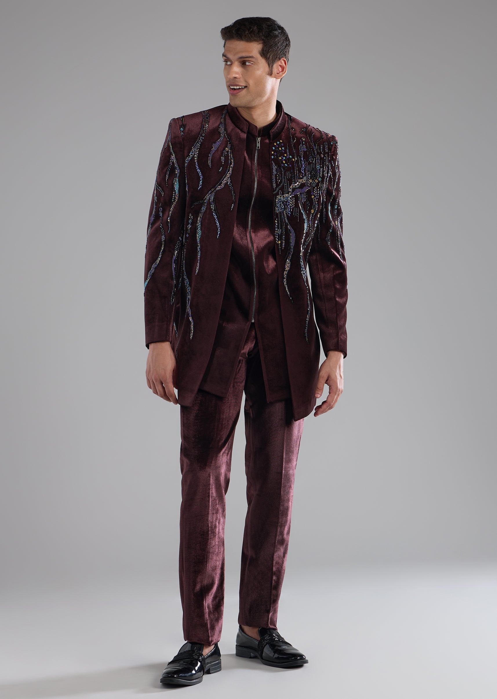 Crafted for grand occasions, this velvet indo western kurta set exudes richness and refined drama. The plush velvet base is intricately embellished with zardosi, cut dana, and bead work, creating a luxurious surface with elegant depth. Full sleeves and a mandarin collar bring a sharp, regal structure, while the front zip and button detailing add a contemporary edge. Paired with coordinated pants, this ensemble is ideal for weddings, receptions, and festive evening celebrations.Awarded as the Most Trusted Brand, we're delivering styles you love, just as promised.
