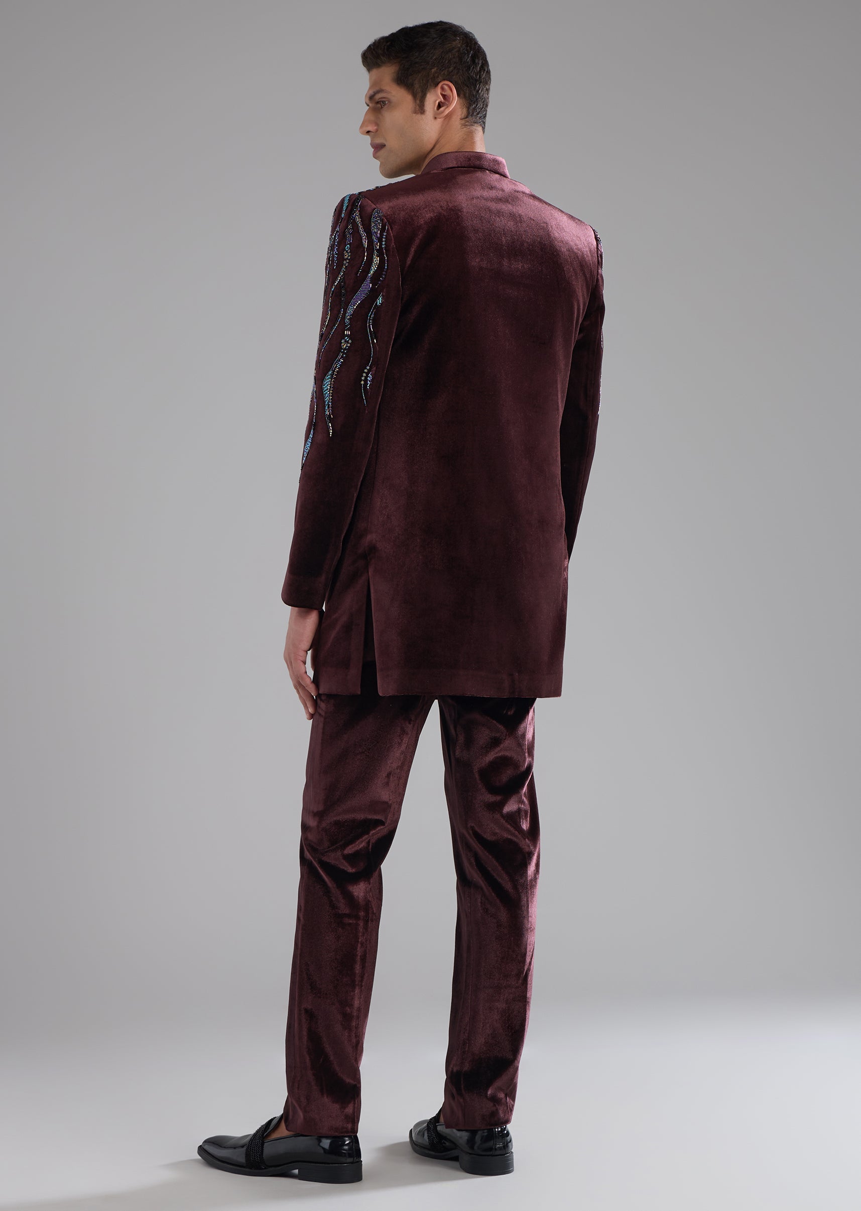 Pair with polished mojaris or formal loafers and keep accessories minimal to let the embroidery and velvet texture take center stage.