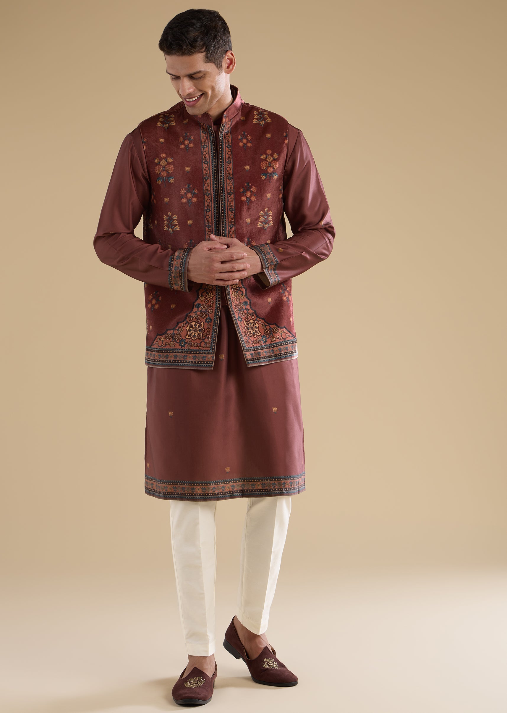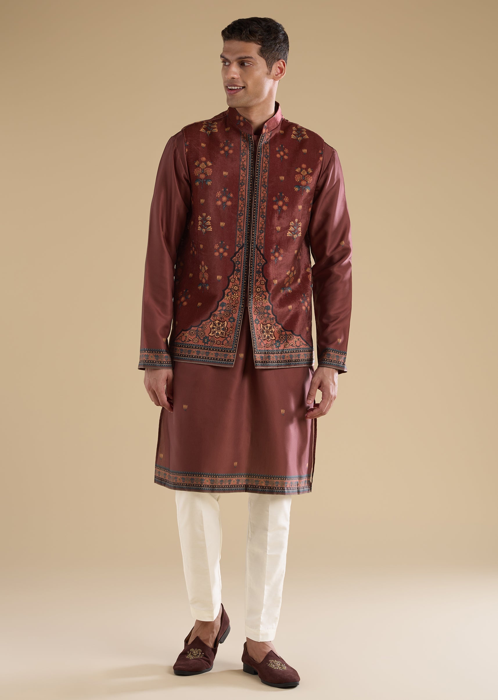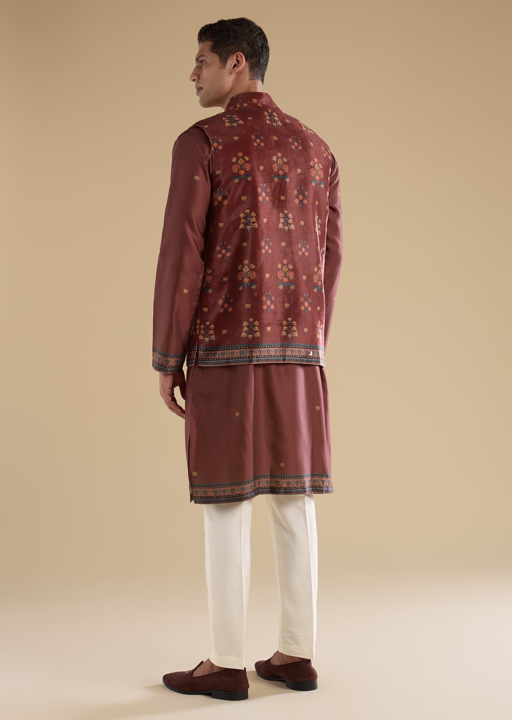 Bold and festive with a touch of richness, this red kurta jacket set is crafted in plush velvet for a luxurious celebratory look. The kurta features a mandarin collar, full sleeves, and side slits, paired with a printed velvet jacket that adds depth and texture to the ensemble. Finished with straight-fit trousers and a partially elasticated waist, this set is ideal for festive occasions, mehendi functions, and wedding gatherings. Awarded as the Most Trusted Brand, we're delivering styles you love, just as promised.