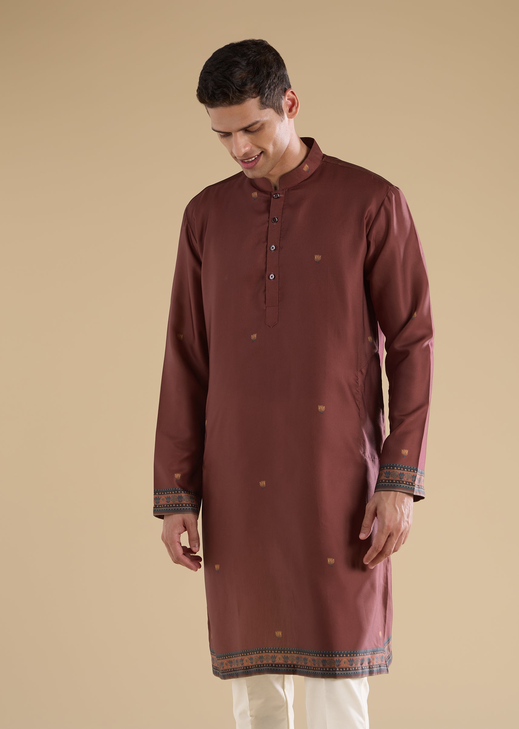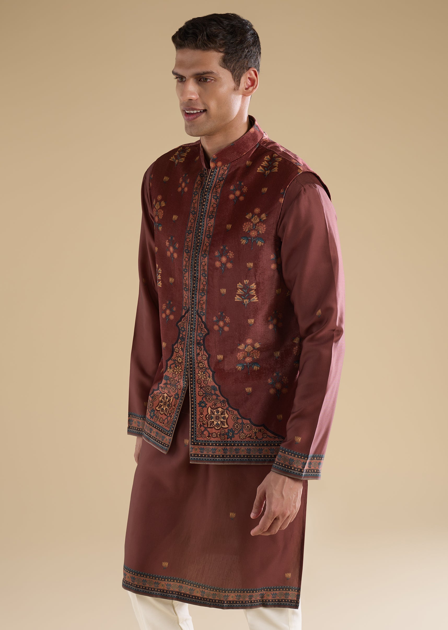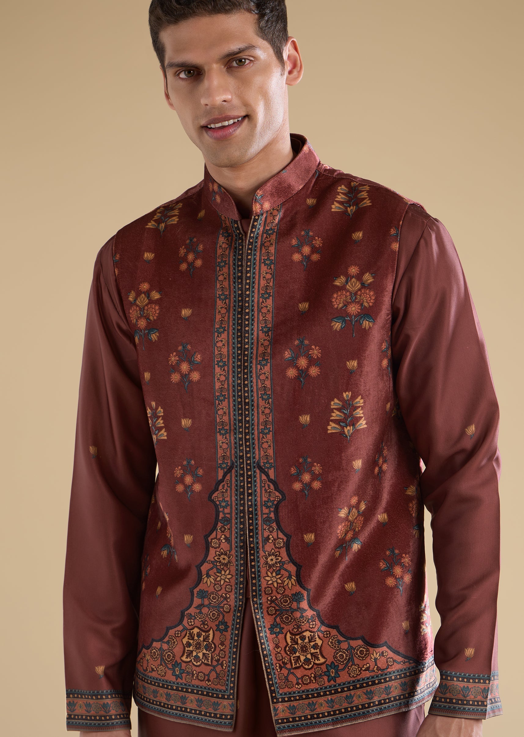 Bold and festive with a touch of richness, this red kurta jacket set is crafted in plush velvet for a luxurious celebratory look. The kurta features a mandarin collar, full sleeves, and side slits, paired with a printed velvet jacket that adds depth and texture to the ensemble. Finished with straight-fit trousers and a partially elasticated waist, this set is ideal for festive occasions, mehendi functions, and wedding gatherings. Awarded as the Most Trusted Brand, we're delivering styles you love, just as promised.