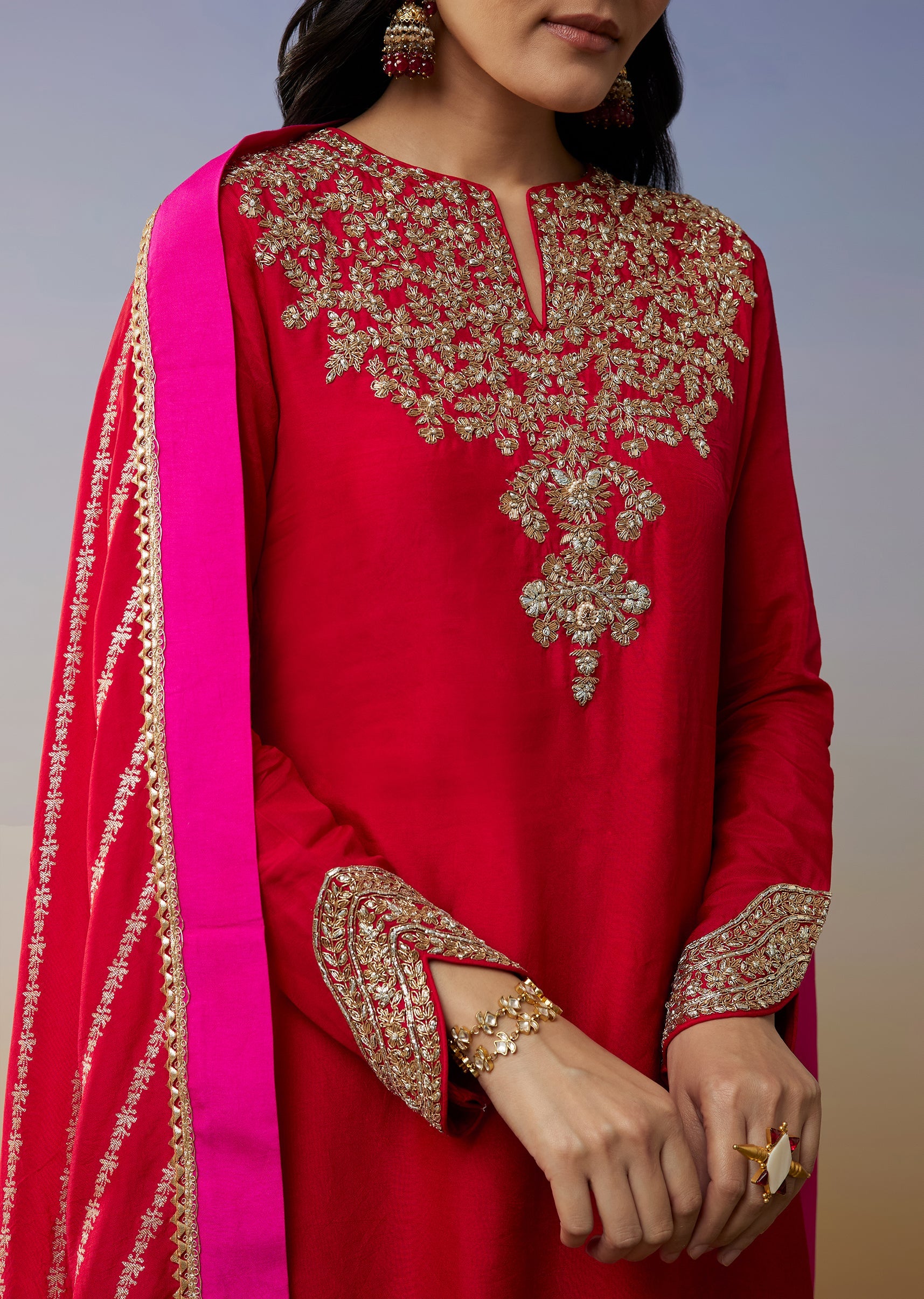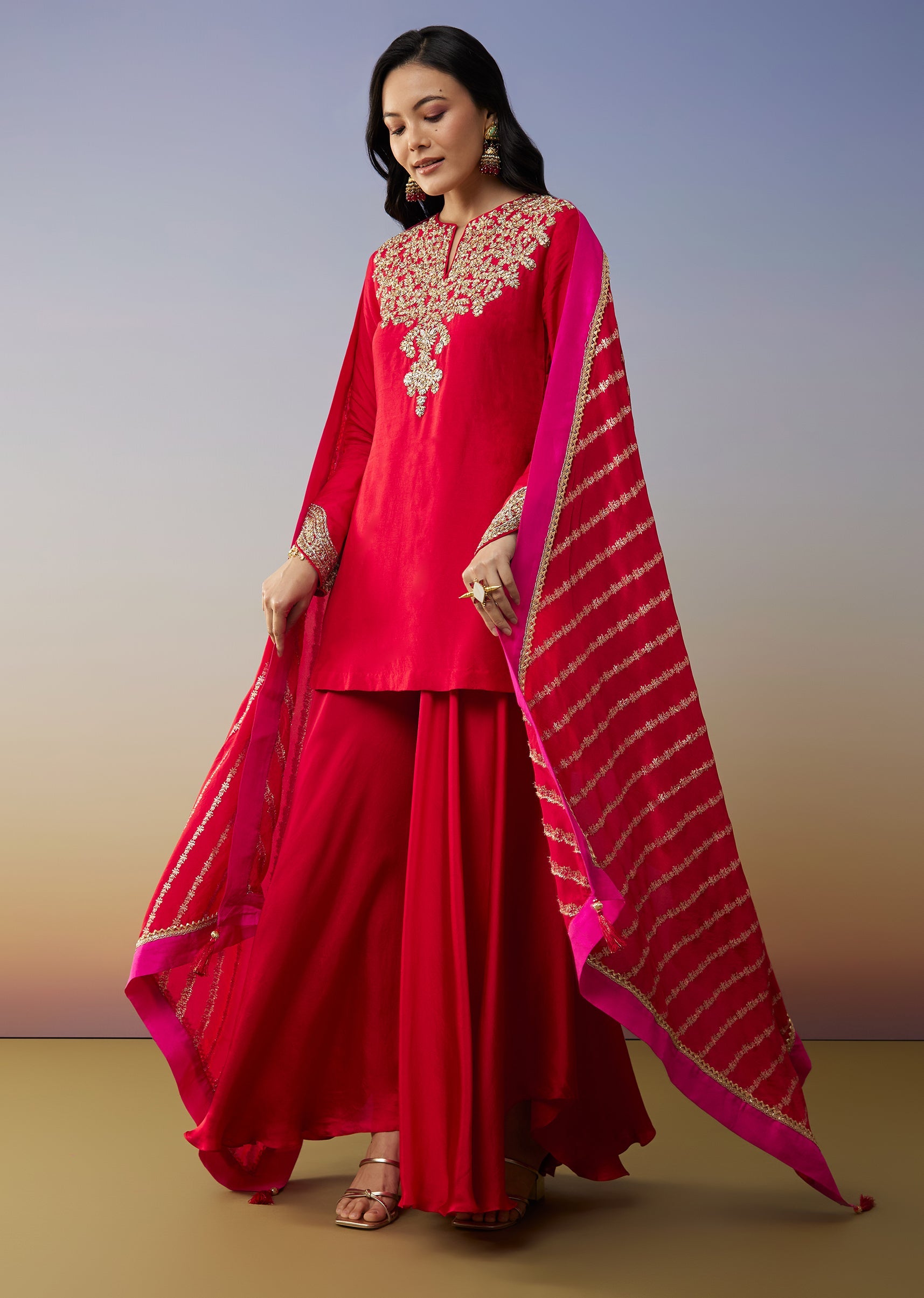 Red Viscose Satin Palazzo Suit with Zardosi Work