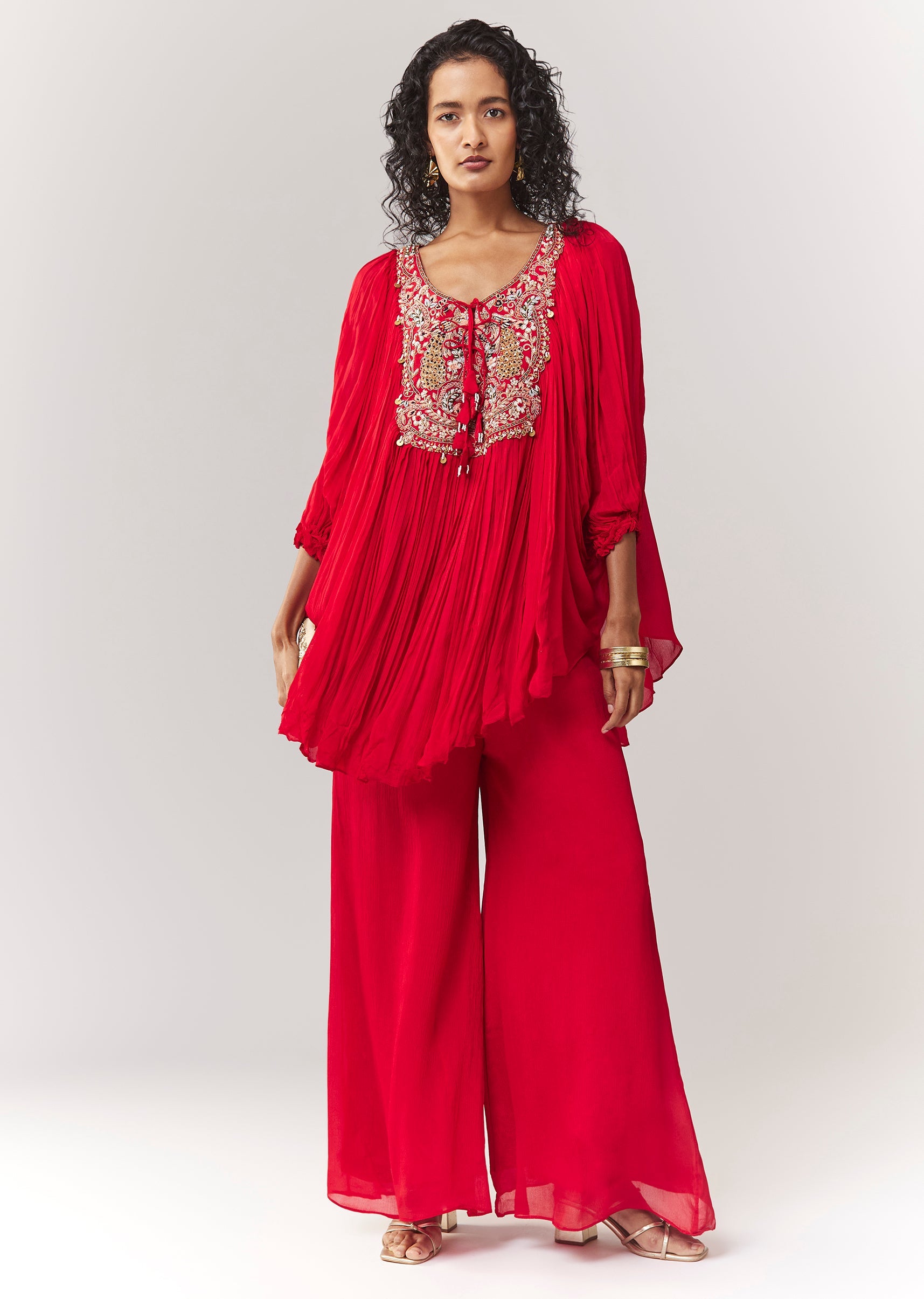 Red Zardosi And Thread Work Cape Set With Palazzo