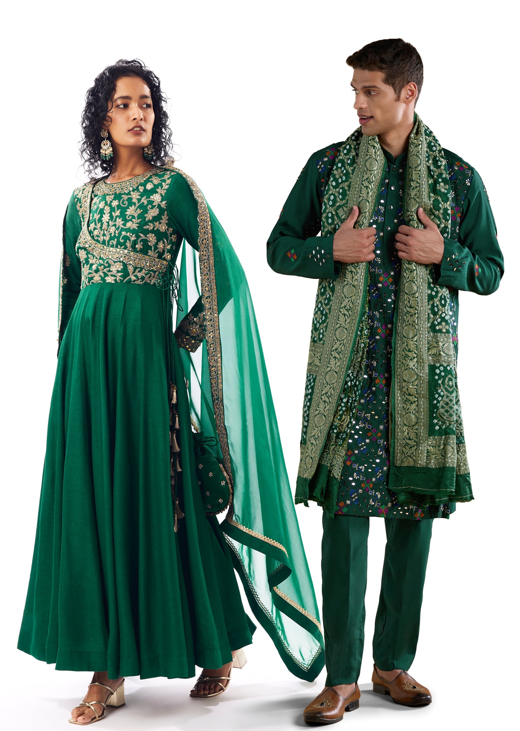 Regal Wedding Couple Set – Green Angarkha Anarkali for Her And Green Silk Thread Work Kurta Set with Dupatta for Him