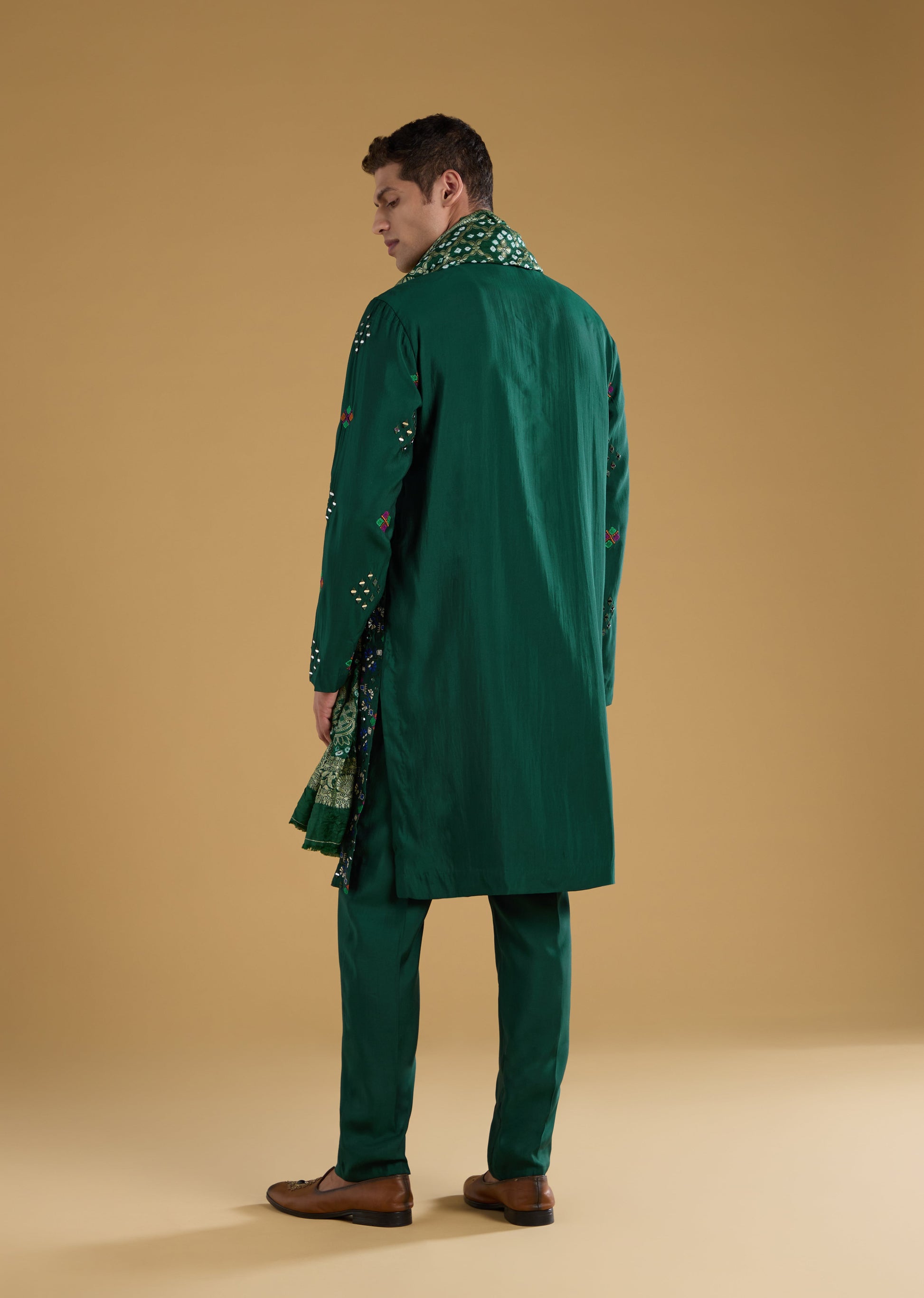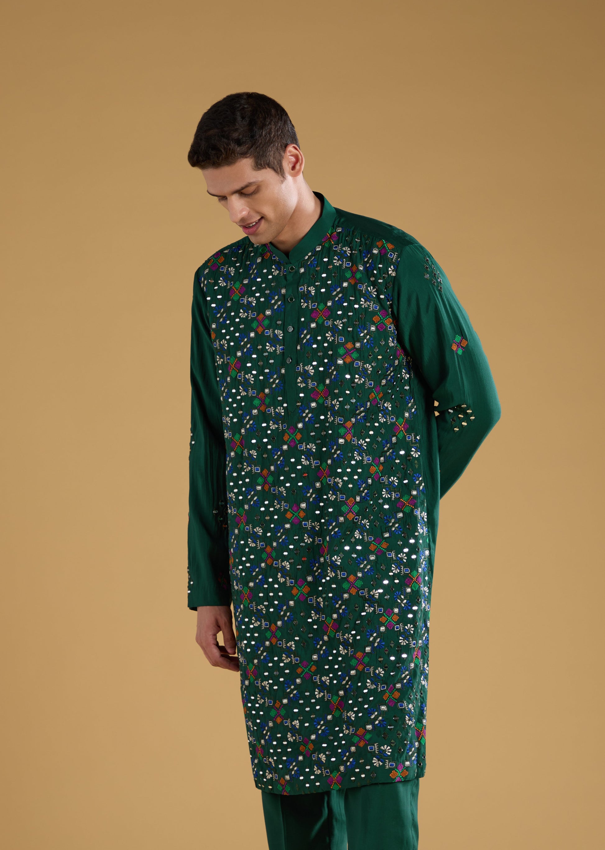 Elegant and festive, this green silk kurta set with intricate thread work and a matching dupatta creates a polished look suited for wedding functions and coordinated couple styling.