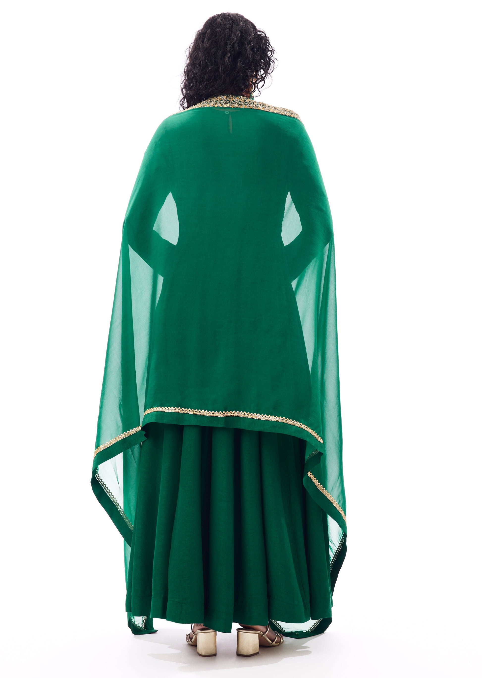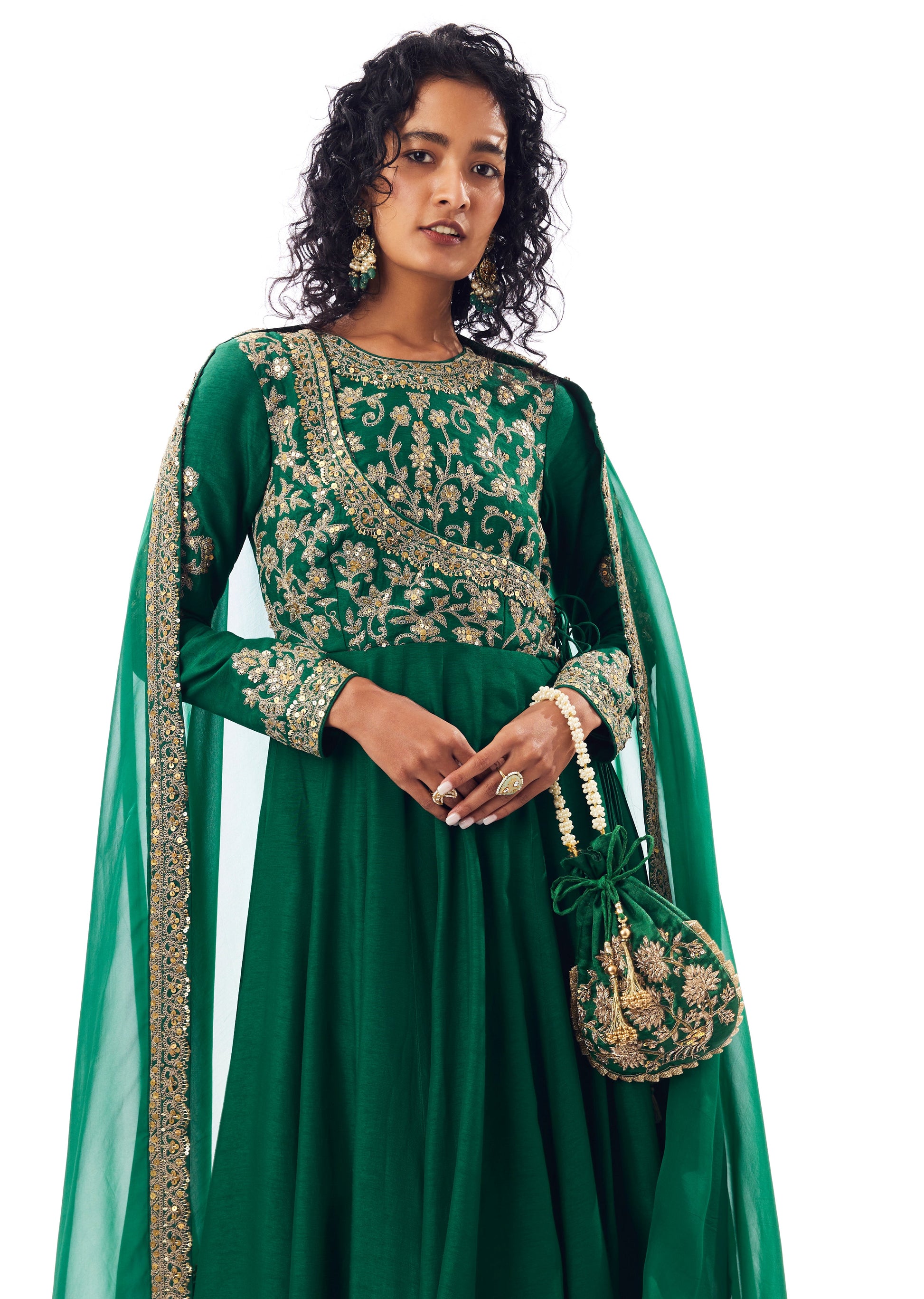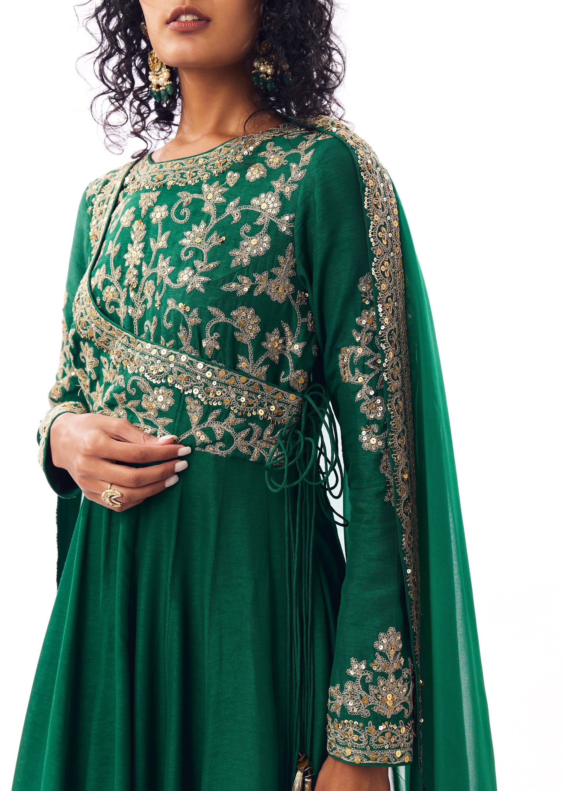 Flowing and timeless, this green angarkha anarkali offers graceful movement and classic charm, making it a perfect choice for mehendi, sangeet, and festive celebrations.