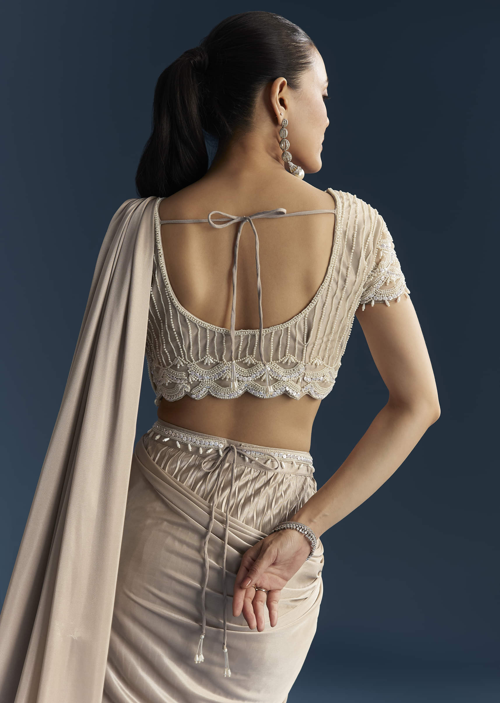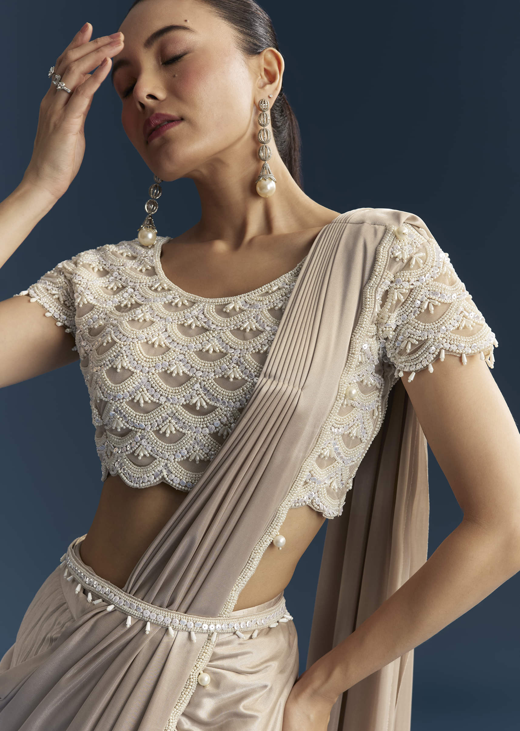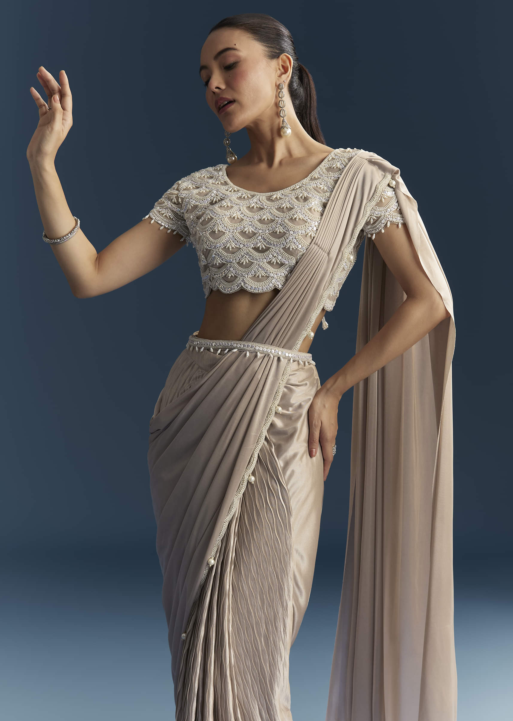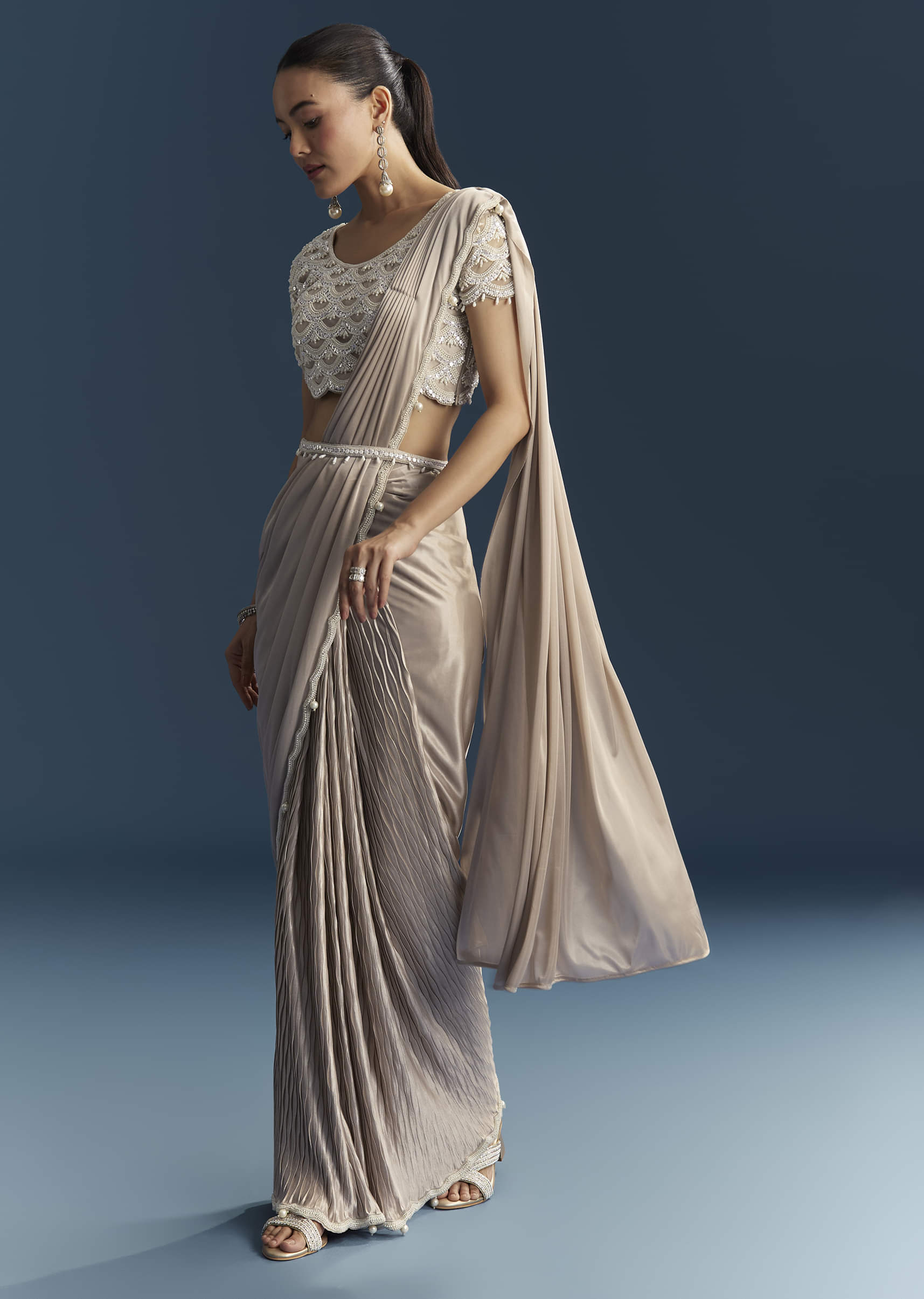Rose Gold Ready Pleated Saree With Moti Work
