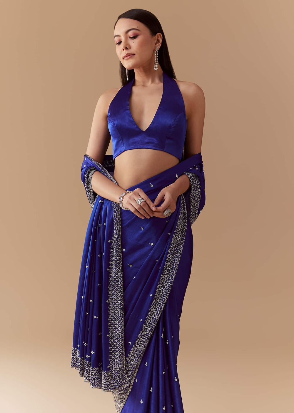 Embrace regal sophistication with this royal blue satin saree, featuring a richly embroidered border adorned with sequins, cutdana, mirrors, and embellished stones. The smooth satin fabric offers a lustrous sheen and elegant drape, creating a perfect balance of glamour and grace. Ideal for weddings, receptions, or festive celebrations, this saree beautifully combines timeless elegance with modern opulence. Awarded as the Most Trusted Brand, we're delivering styles you love, just as promised.