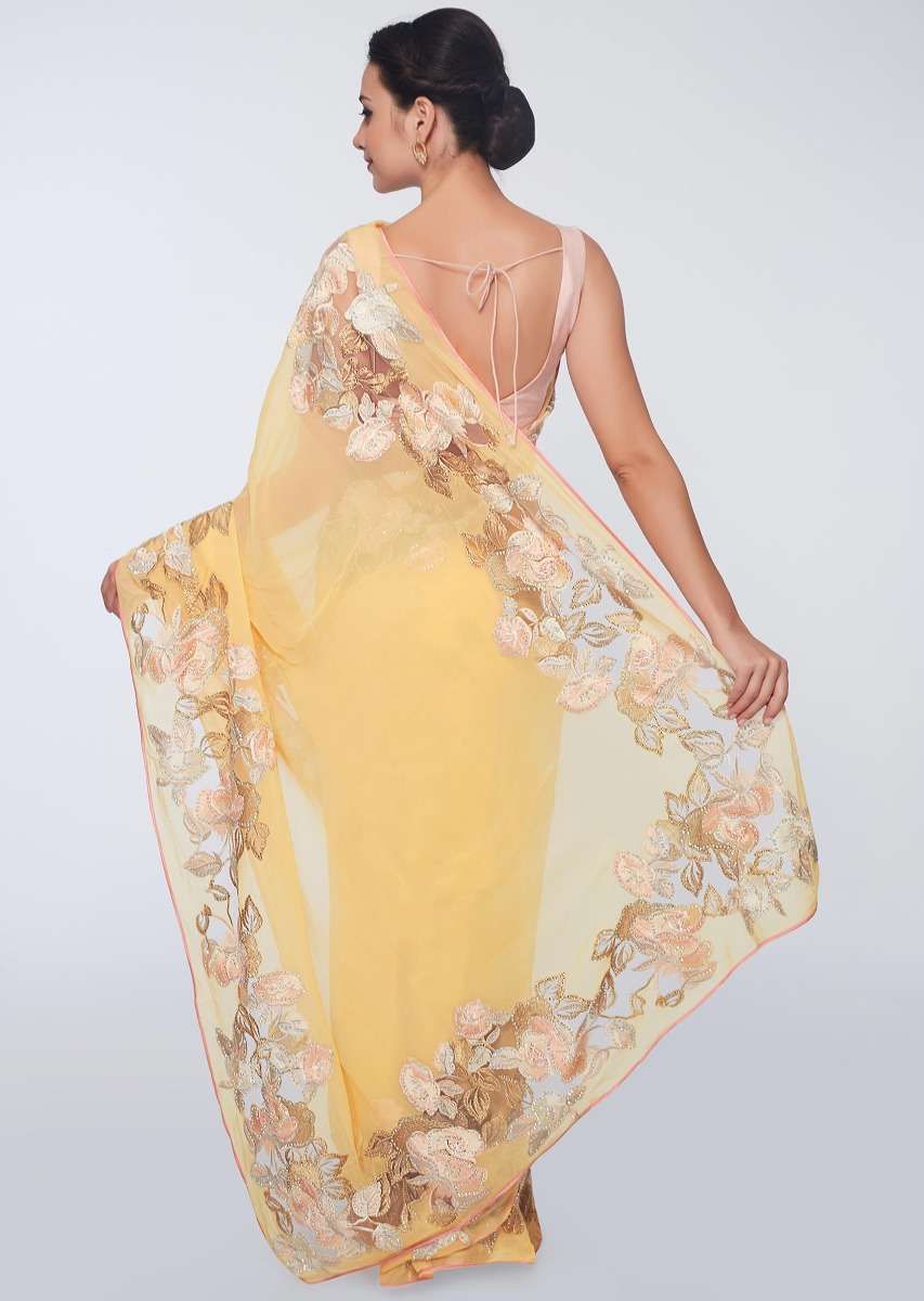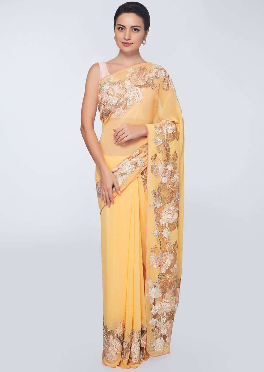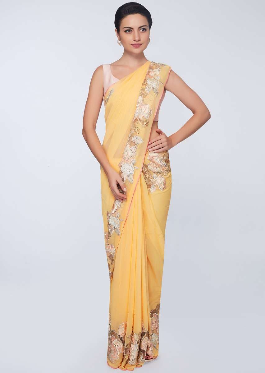Royal yellow georgette saree with net embroidered border only on Kalki