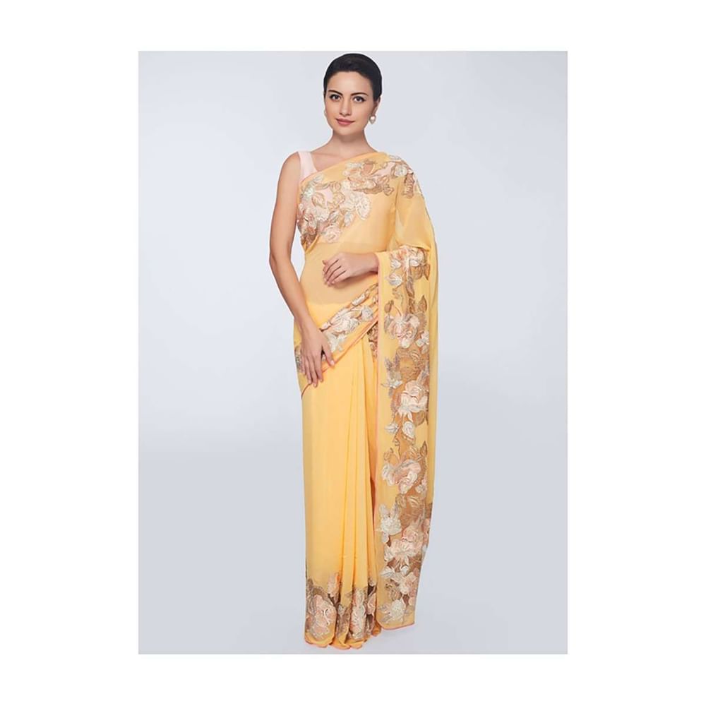 Royal yellow georgette sareewith net embroidered border Intricated in floral resham and zari embroidery along with kundan highlight It Comes with a matching unstitched blouse Slight variation in color is... More Product Details