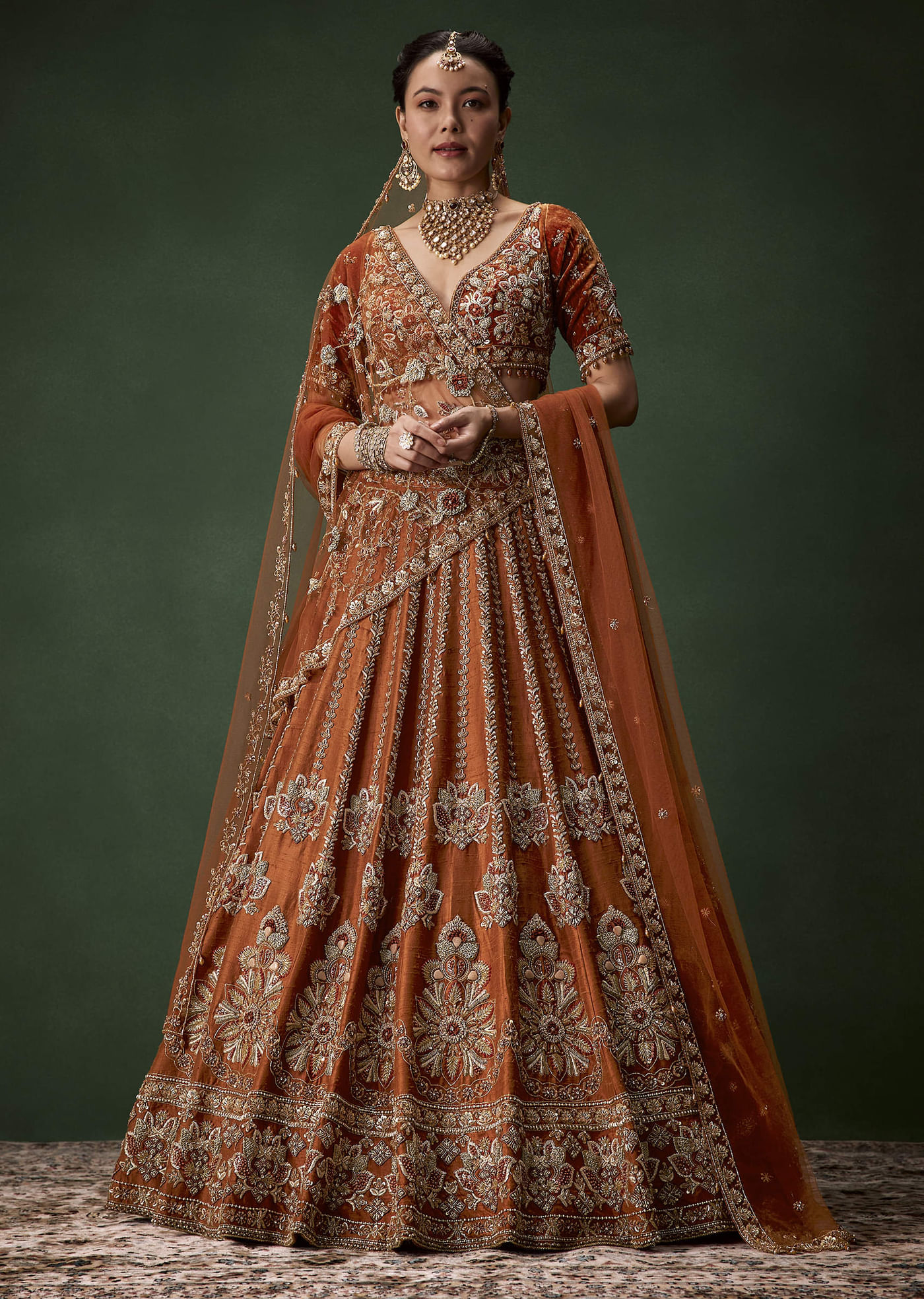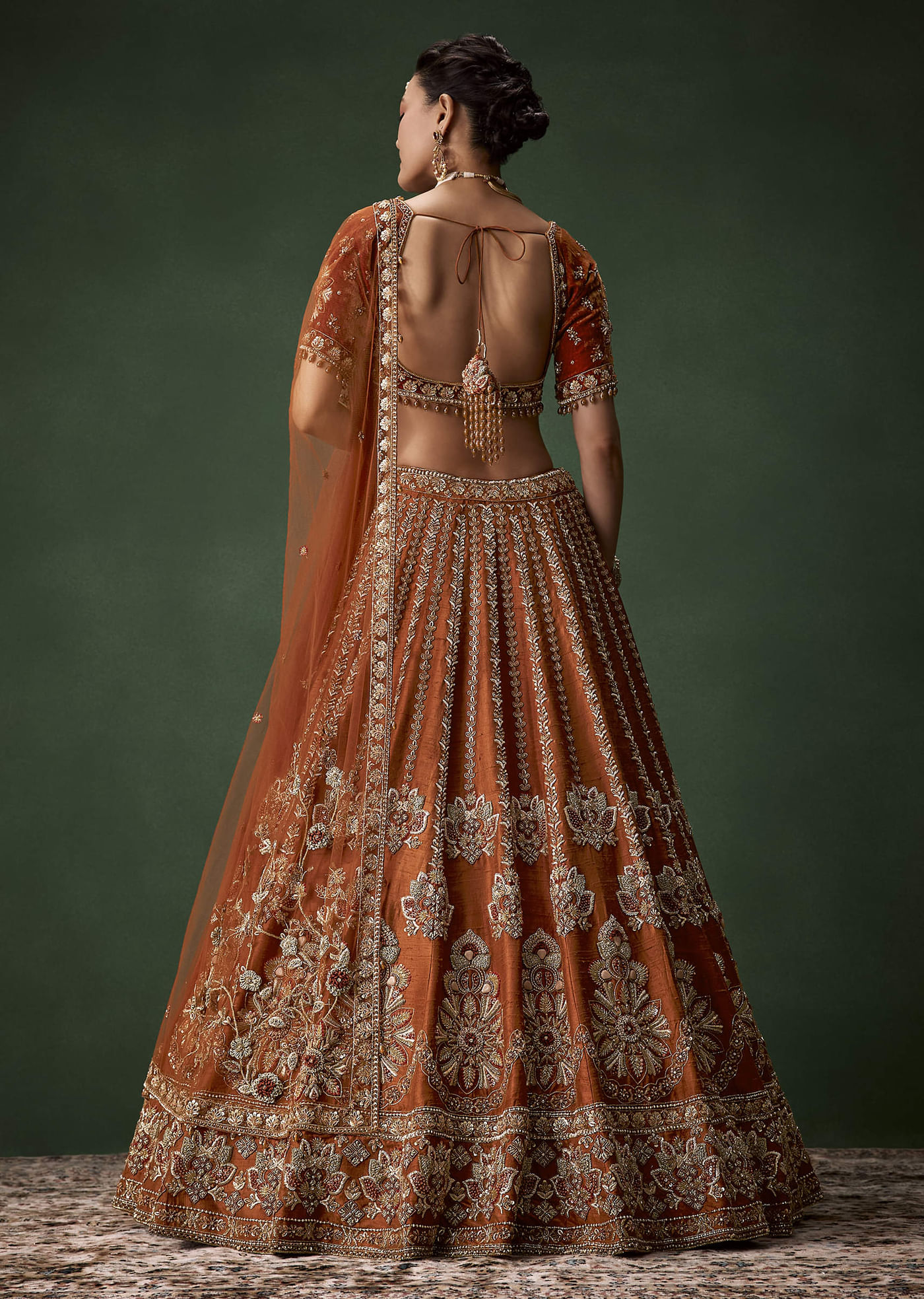 A celebration of regal bridal artistry, this rust raw silk lehenga set brings richness to your wedding look. Meticulously embellished with zardozi and stone detailing, the ensemble showcases intricate craftsmanship... More Product Details