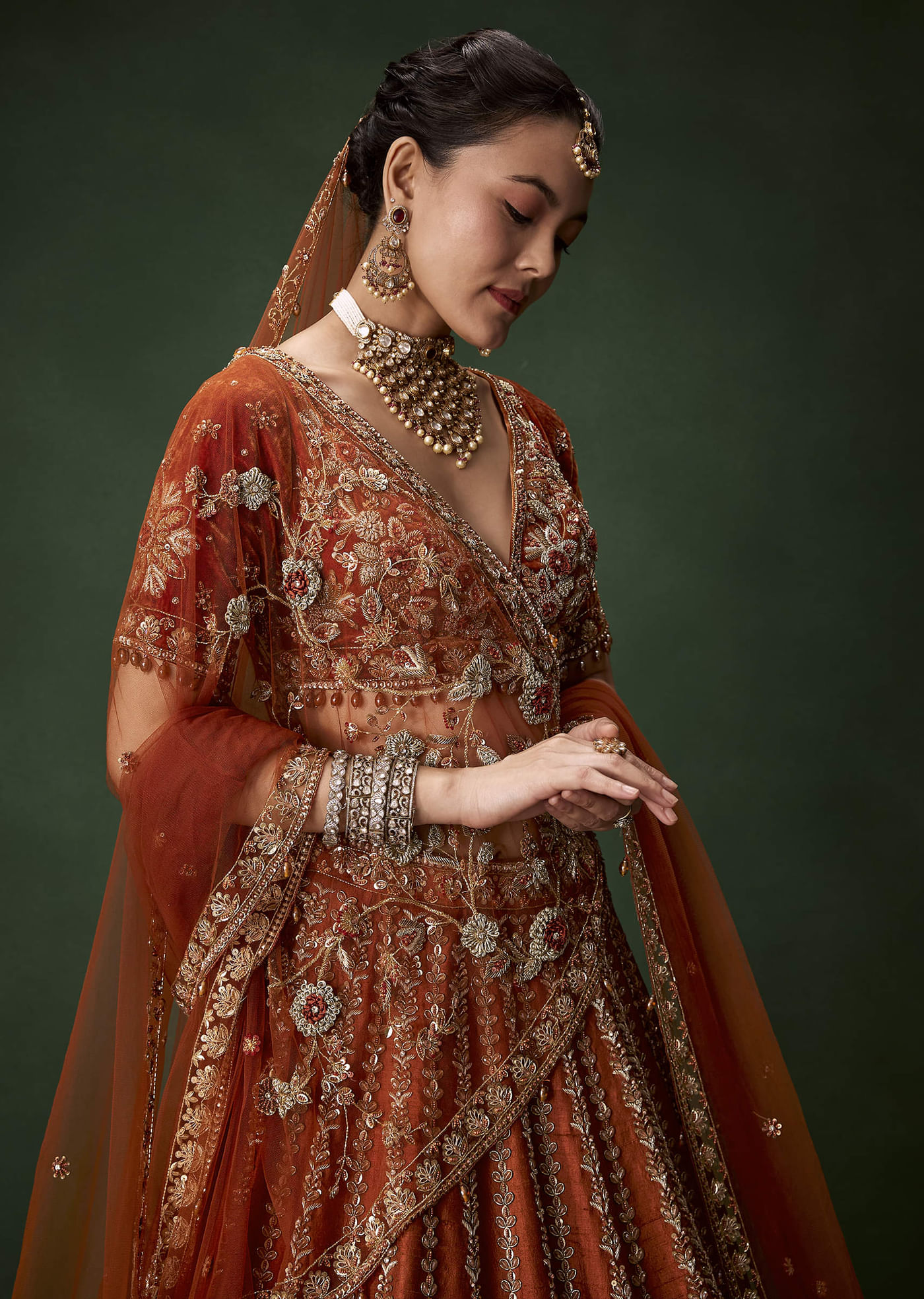 Balance the rich rust tones with kundan drop earrings and subtle makeup for a refined bridal glow.
