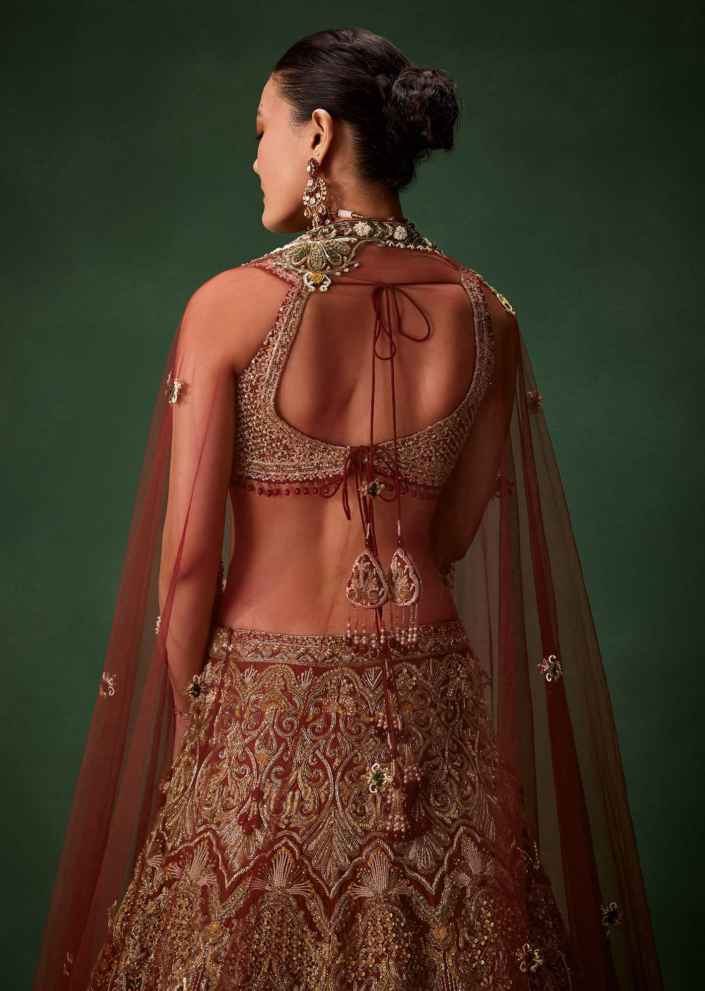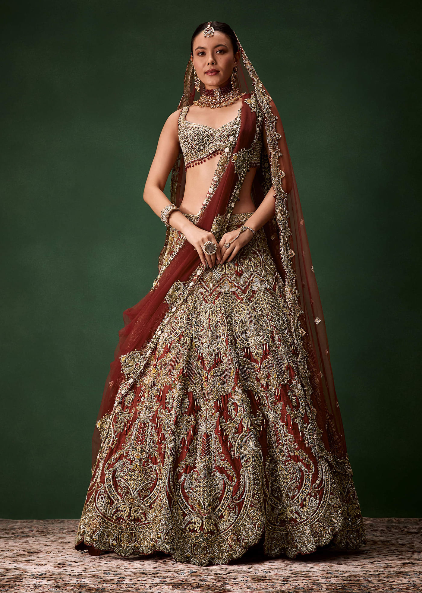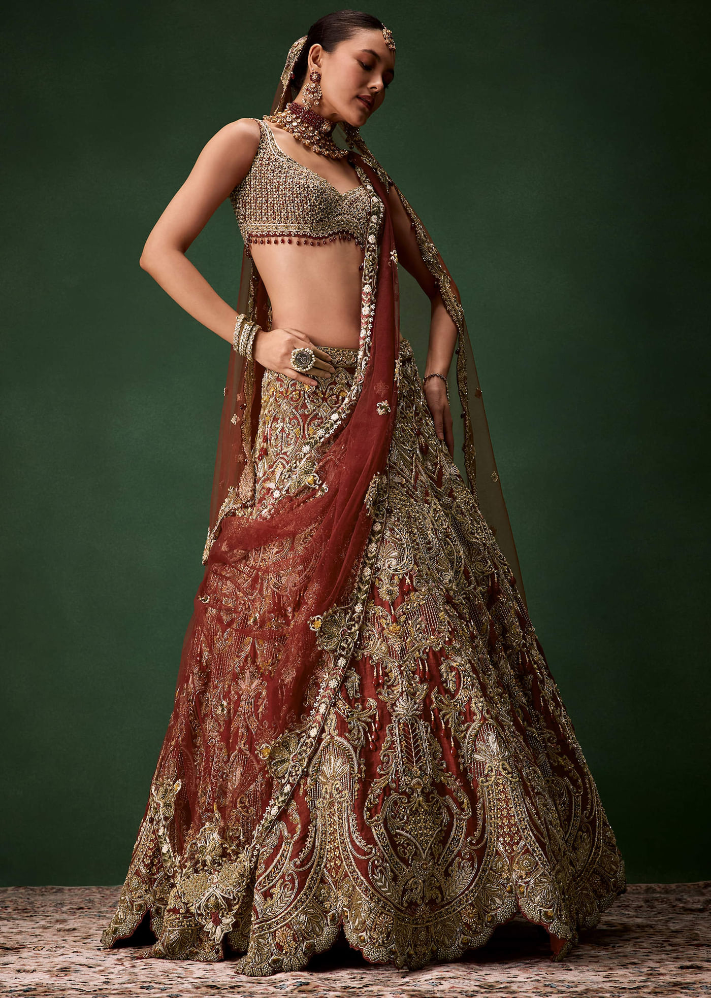 Crafted for the bride who embraces tradition with a bold spirit, this rust silk lehenga set radiates refined celebration glamour. The intricate zardozi, cut dana, sequins, and embroidery work create... More Product Details