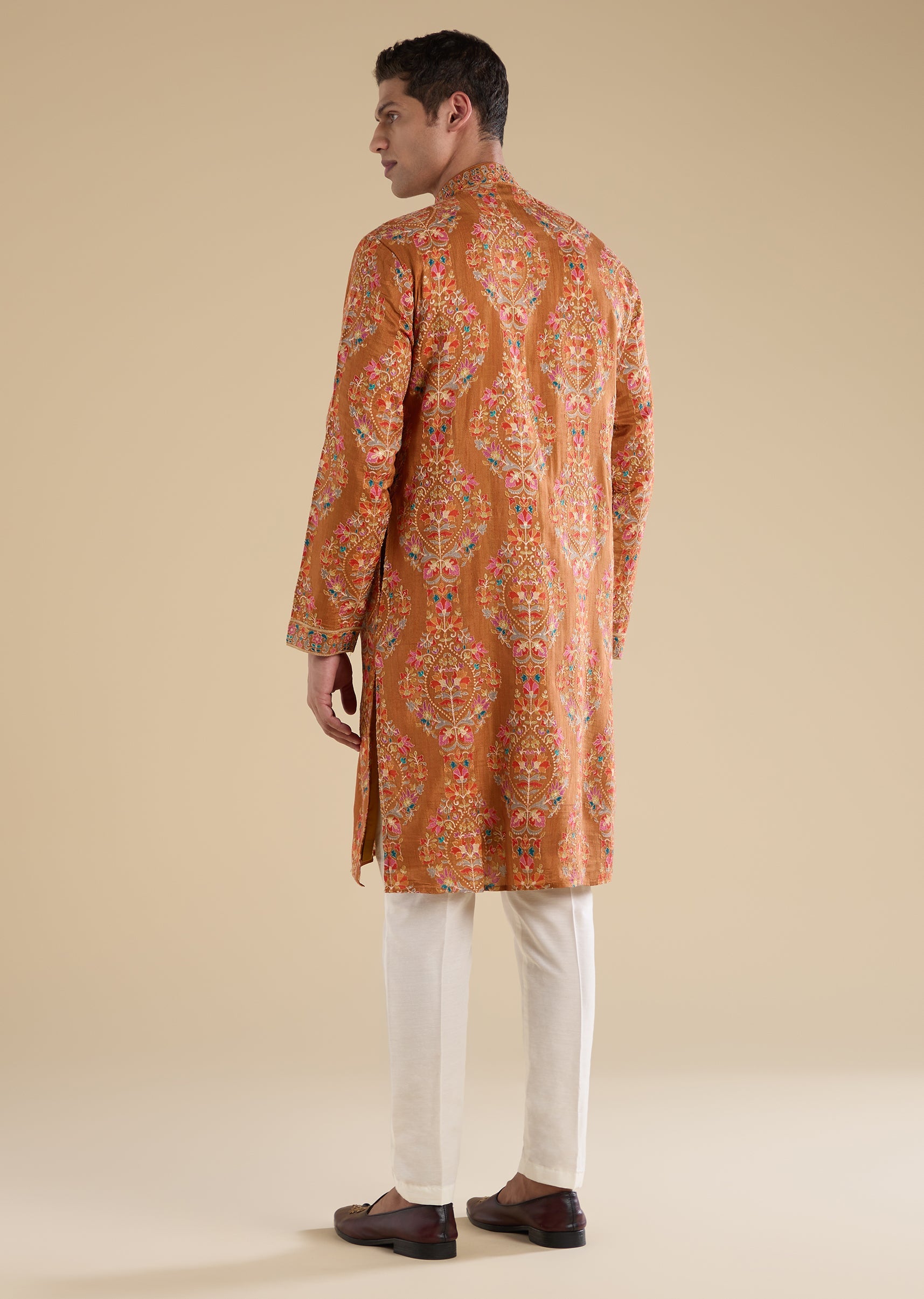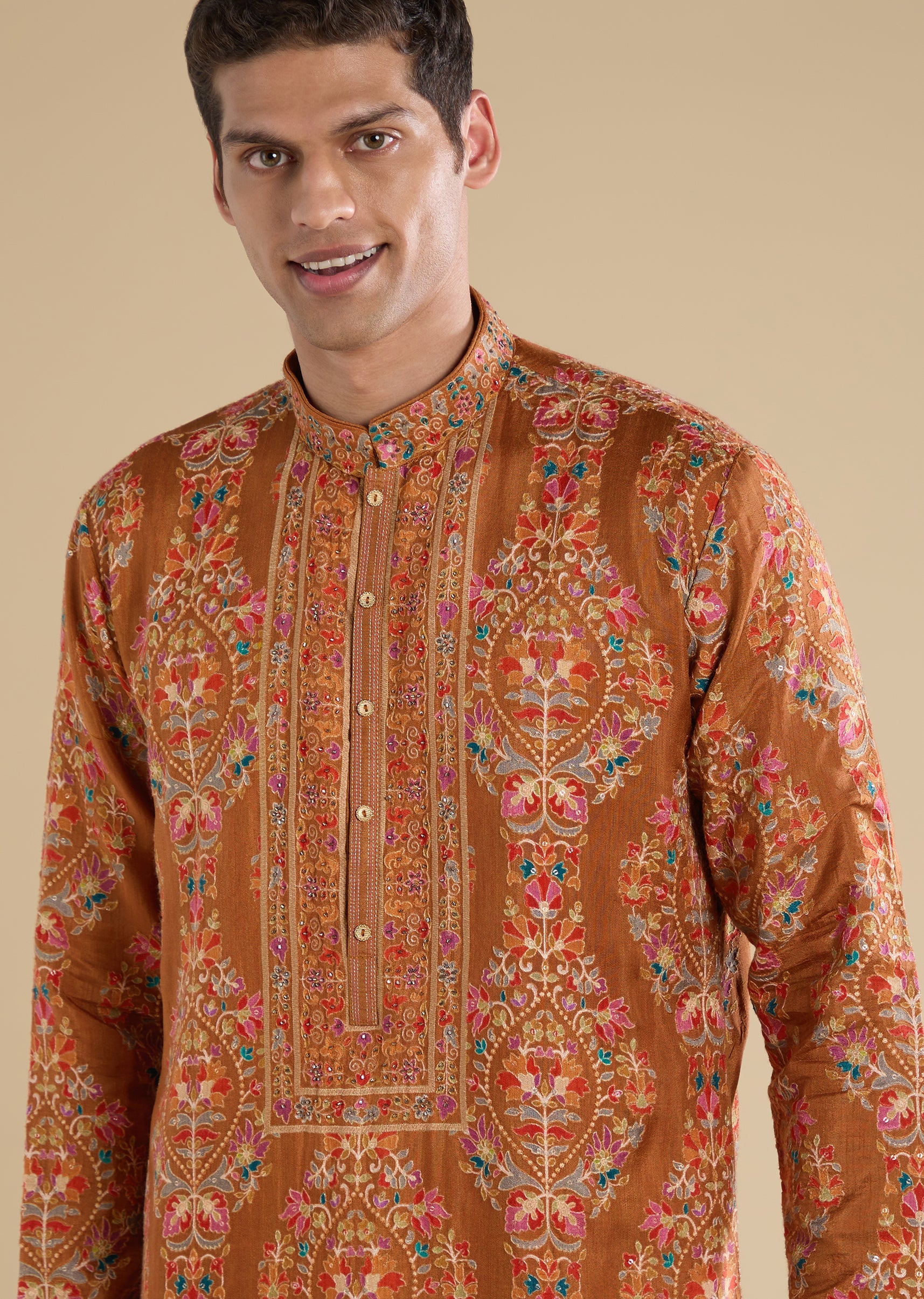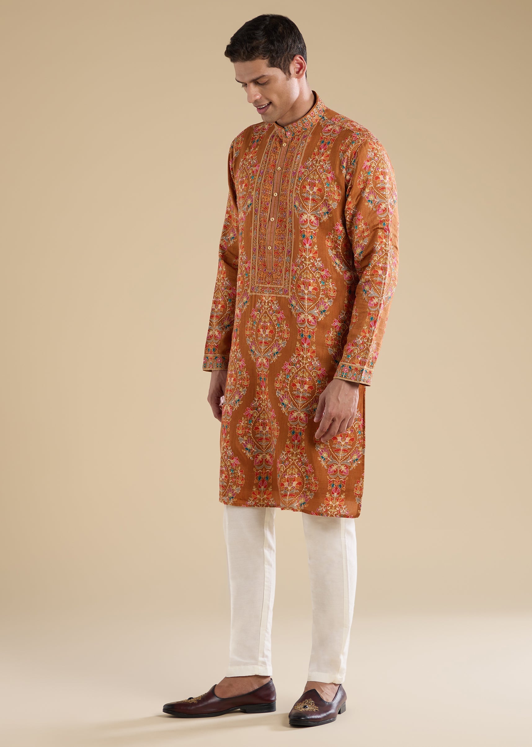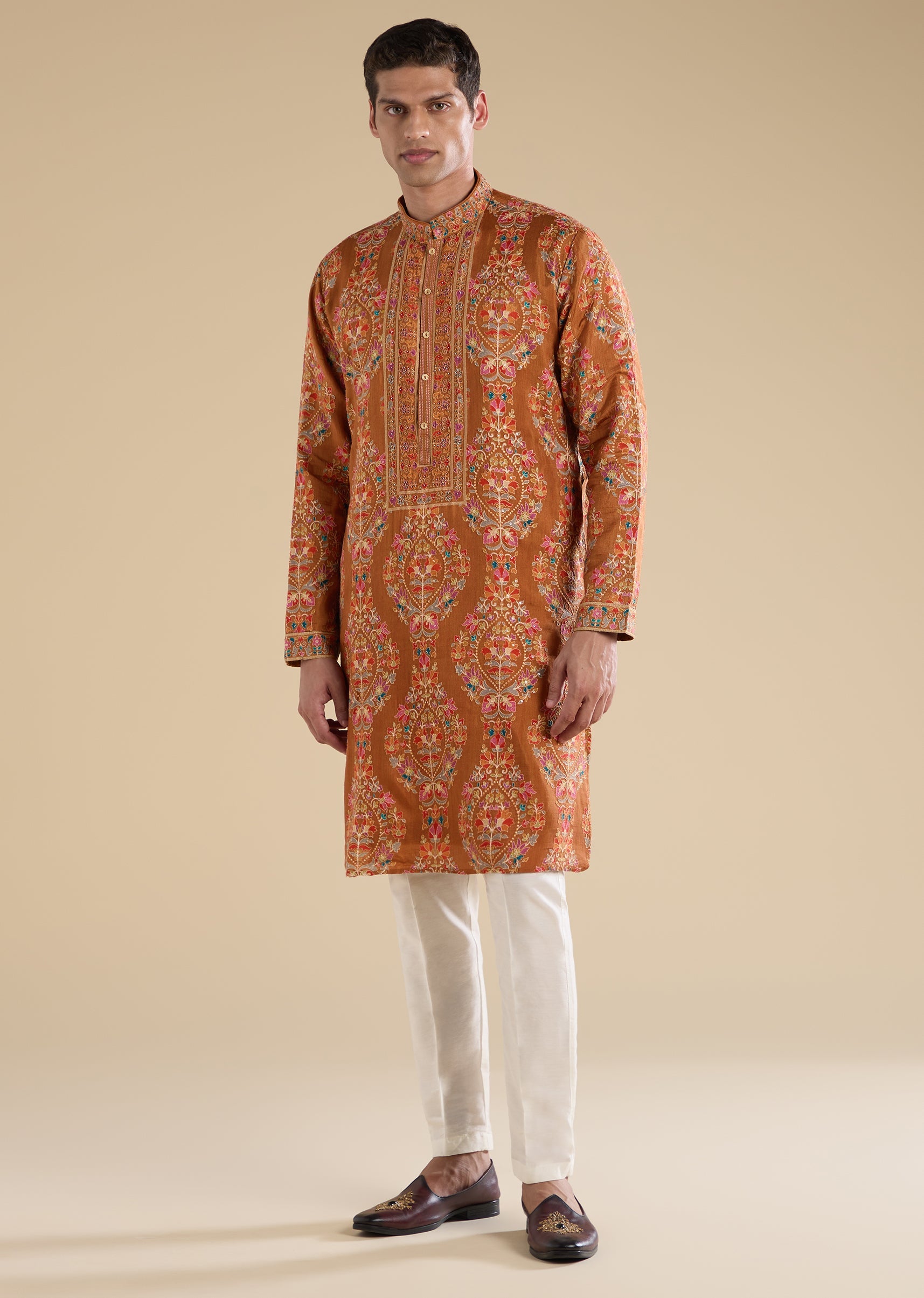 Crafted in art silk, this rust kurta set features a mandarin collar, full sleeves, and side slits, enhanced with a refined mix of sequins, beads, and stone detailing for a... More Product Details