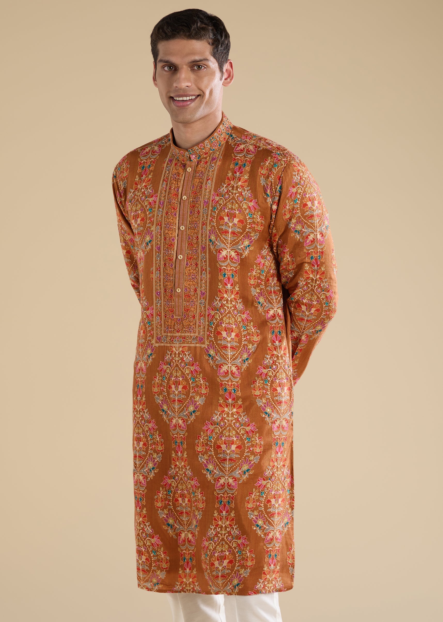 Crafted in art silk, this rust kurta set features a mandarin collar, full sleeves, and side slits, enhanced with a refined mix of sequins, beads, and stone detailing for a rich festive finish. Paired with straight-fit trousers and a partially elasticated waist for comfort. Awarded as the Most Trusted Brand, we're delivering styles you love, just as promised.
