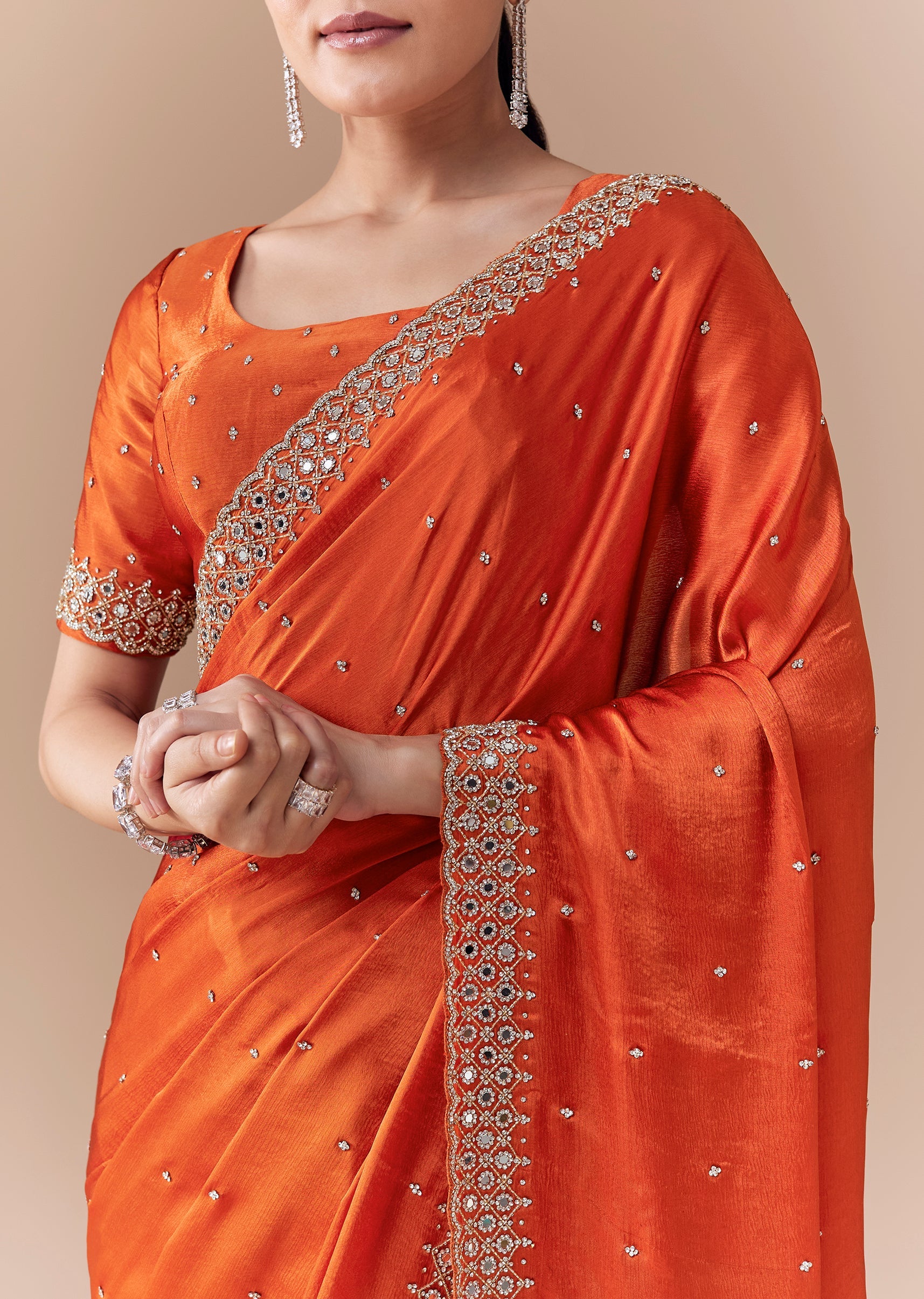 Add a touch of opulence to your wardrobe with this rust orange satin saree, featuring a beautifully heavy embroidered border adorned with sequins, cutdana, mirrors, and embellished stones. The rich... More Product Details