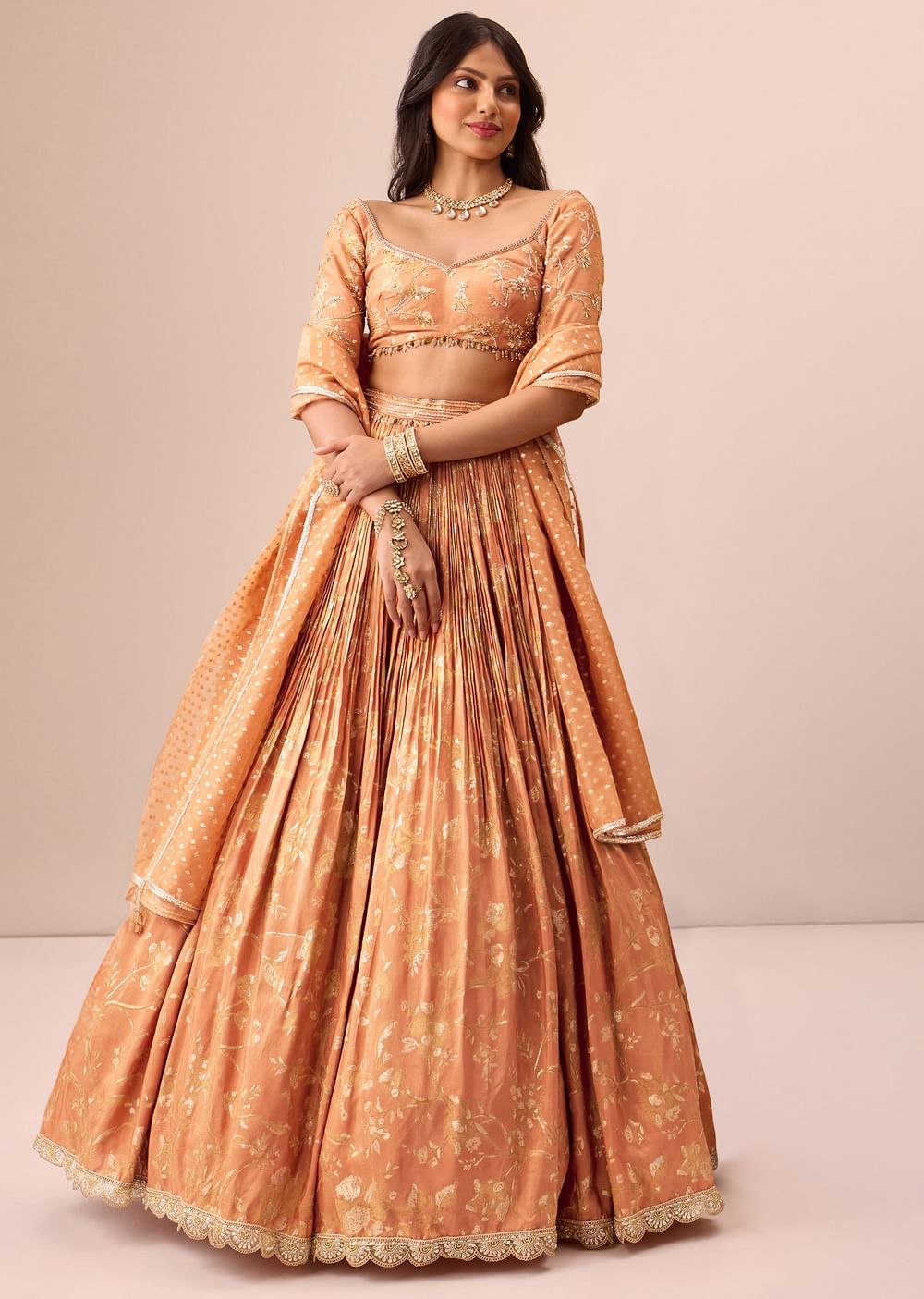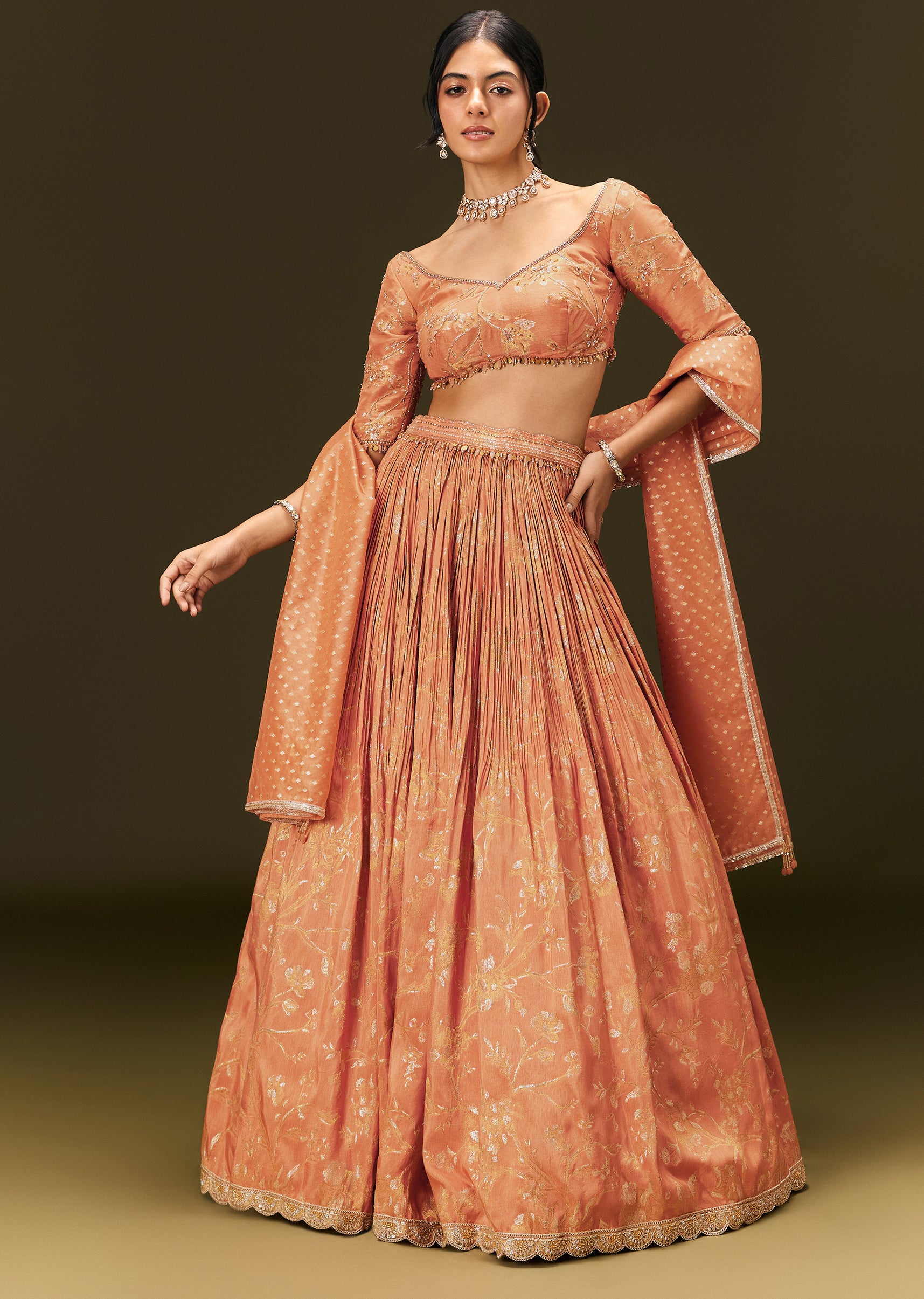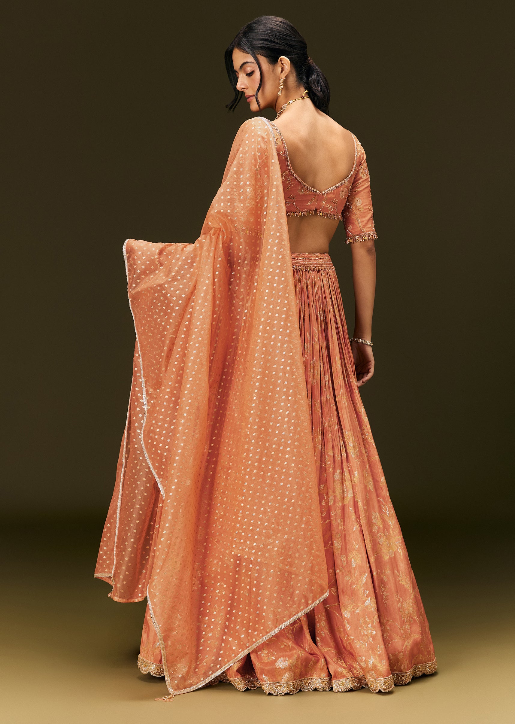Step Into A World Where Tradition Meets Celestial Elegance With This Rustorange Lehenga Set Shimmering With Goldthreaded Dreams. The Organza Satin Jaal Fabric Weaves An Enchanting Tale Of Craftsmanship Adorned... More Product Details