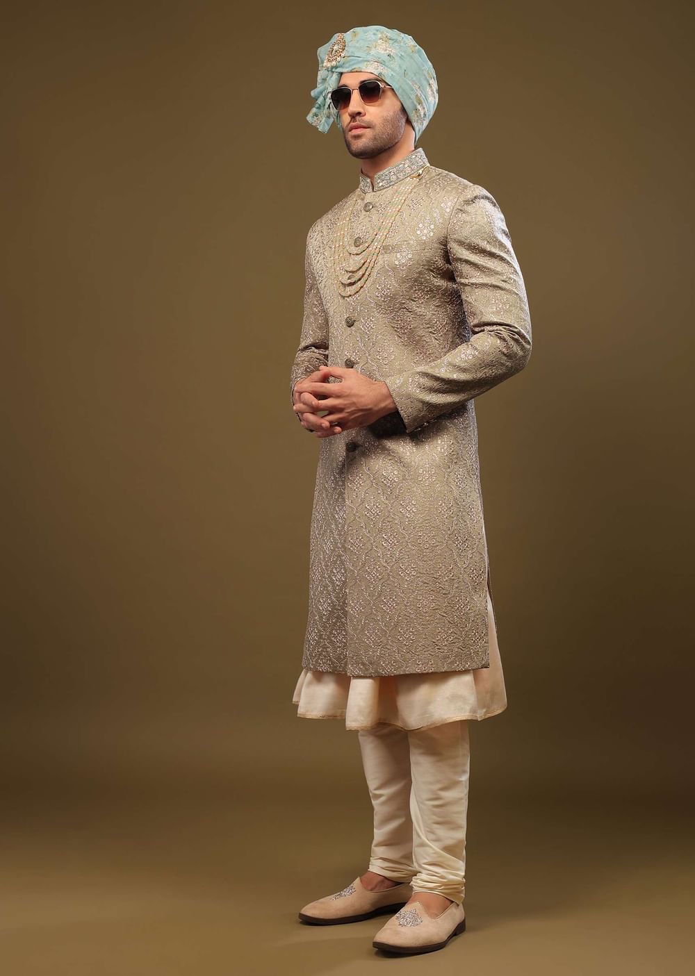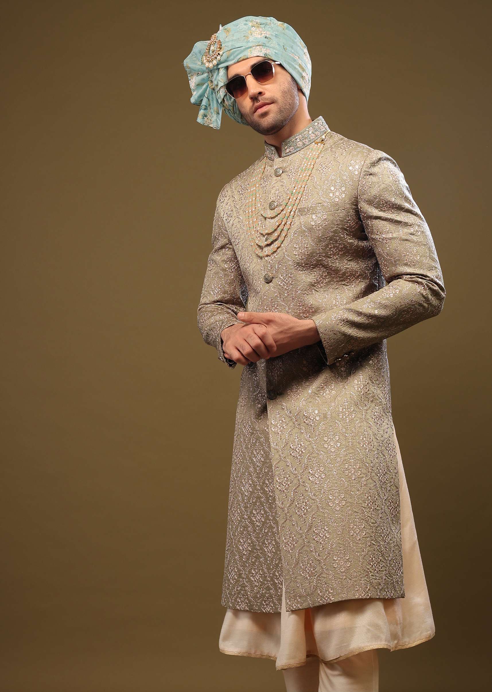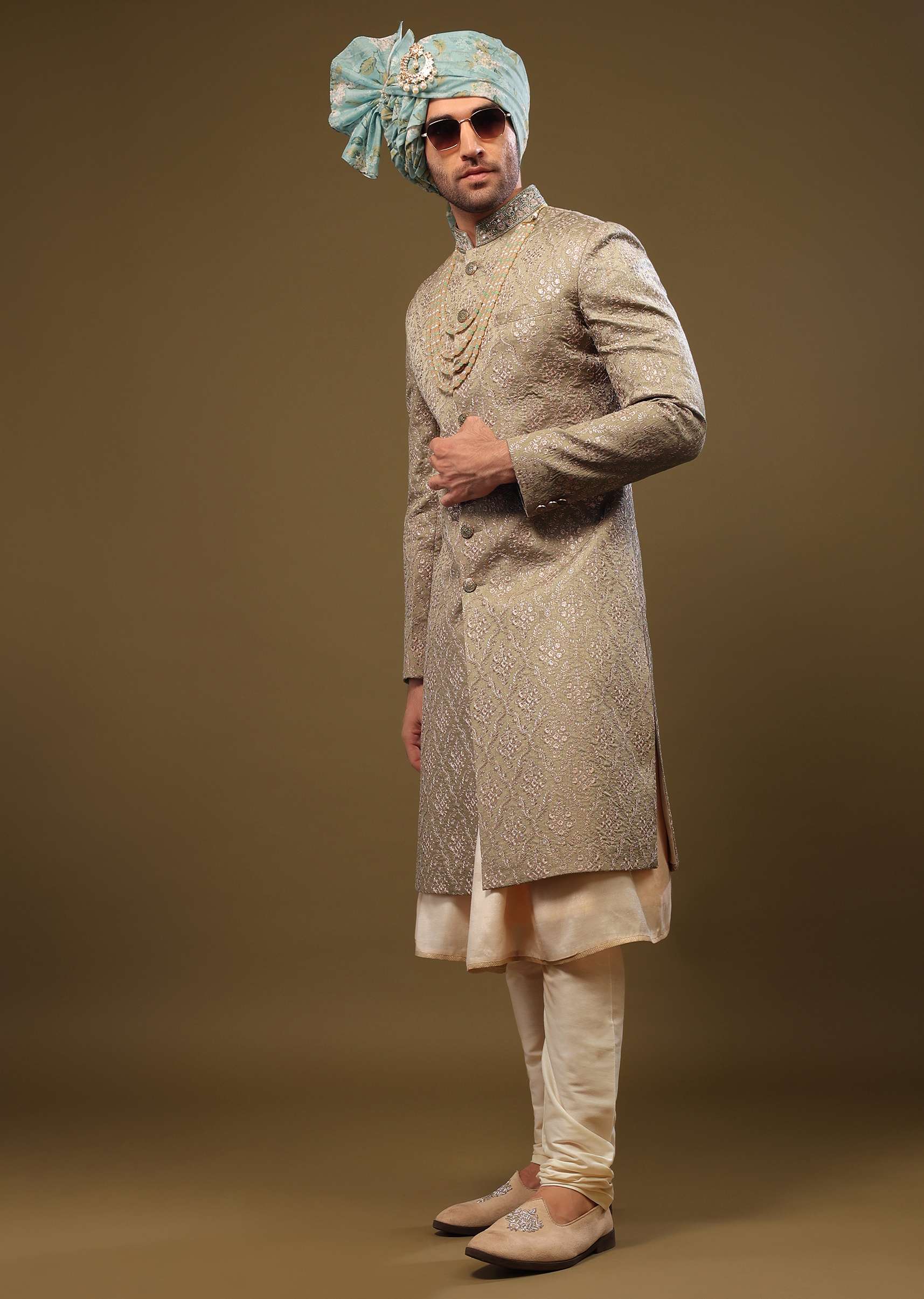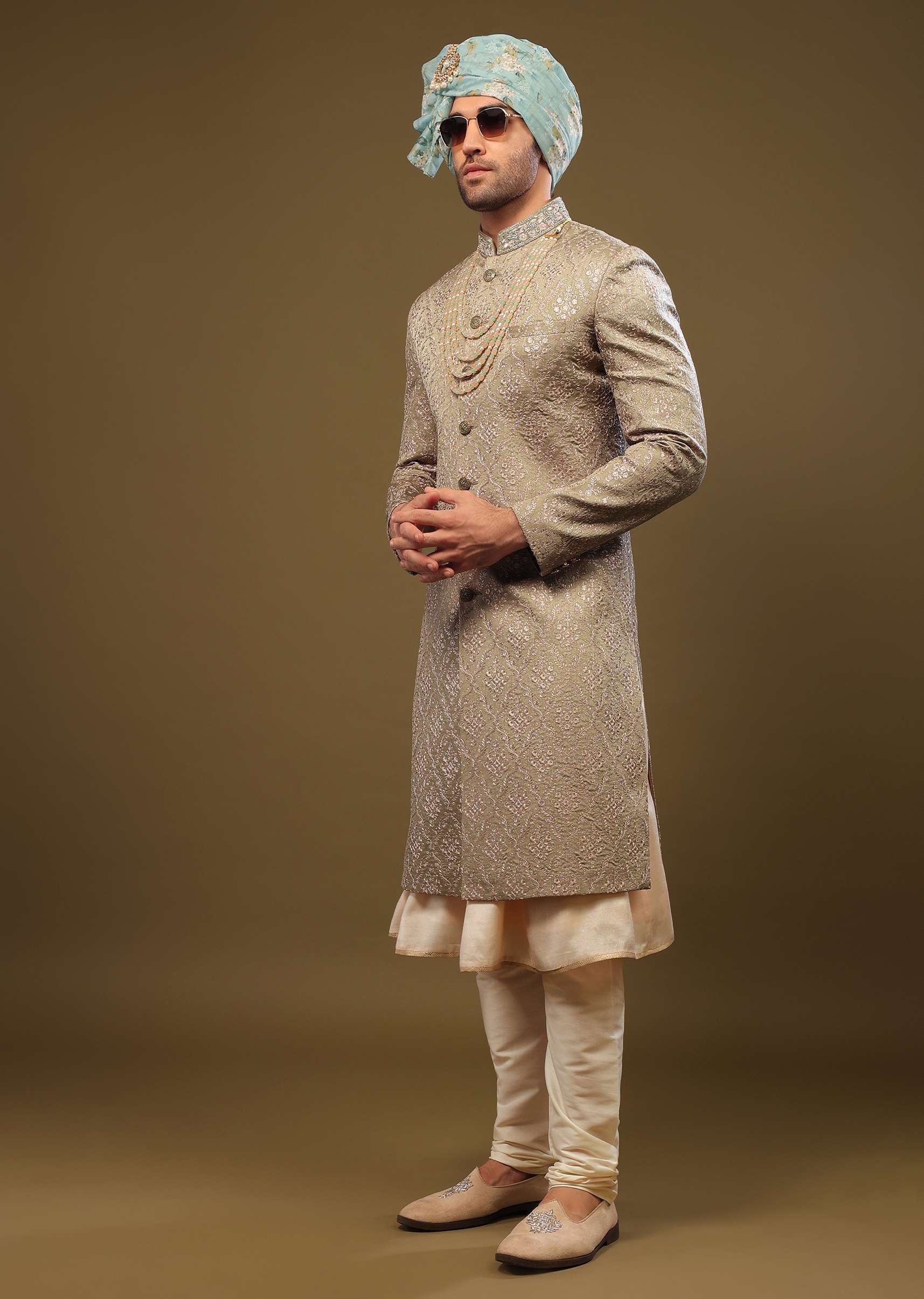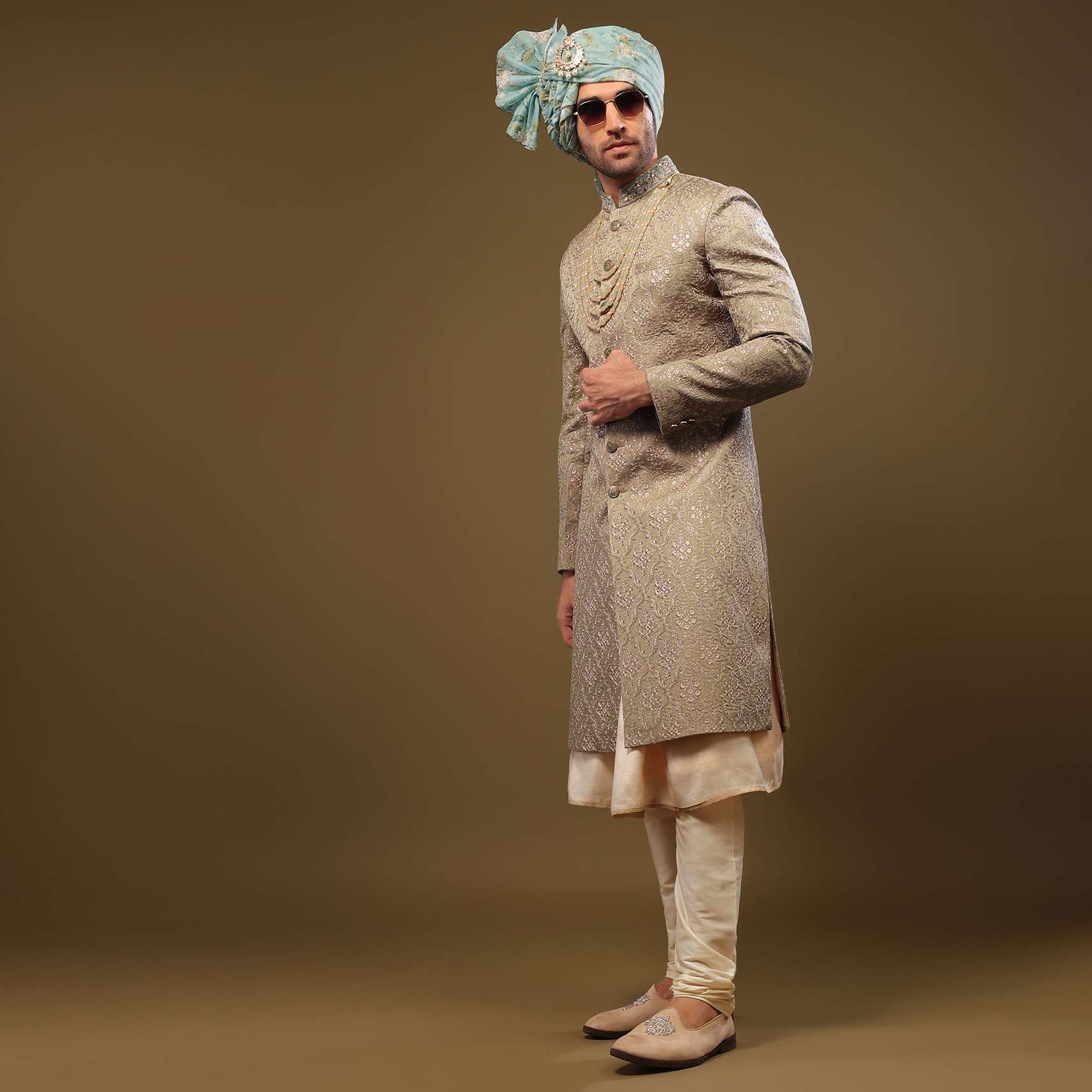 A mesmerizing safari beige sherwani set fabricated in silk, crafted in sequins and threadwork embroidery.It has an embroidered belt with full sleeves, a mandarin collar with a front button closure,... More Product Details