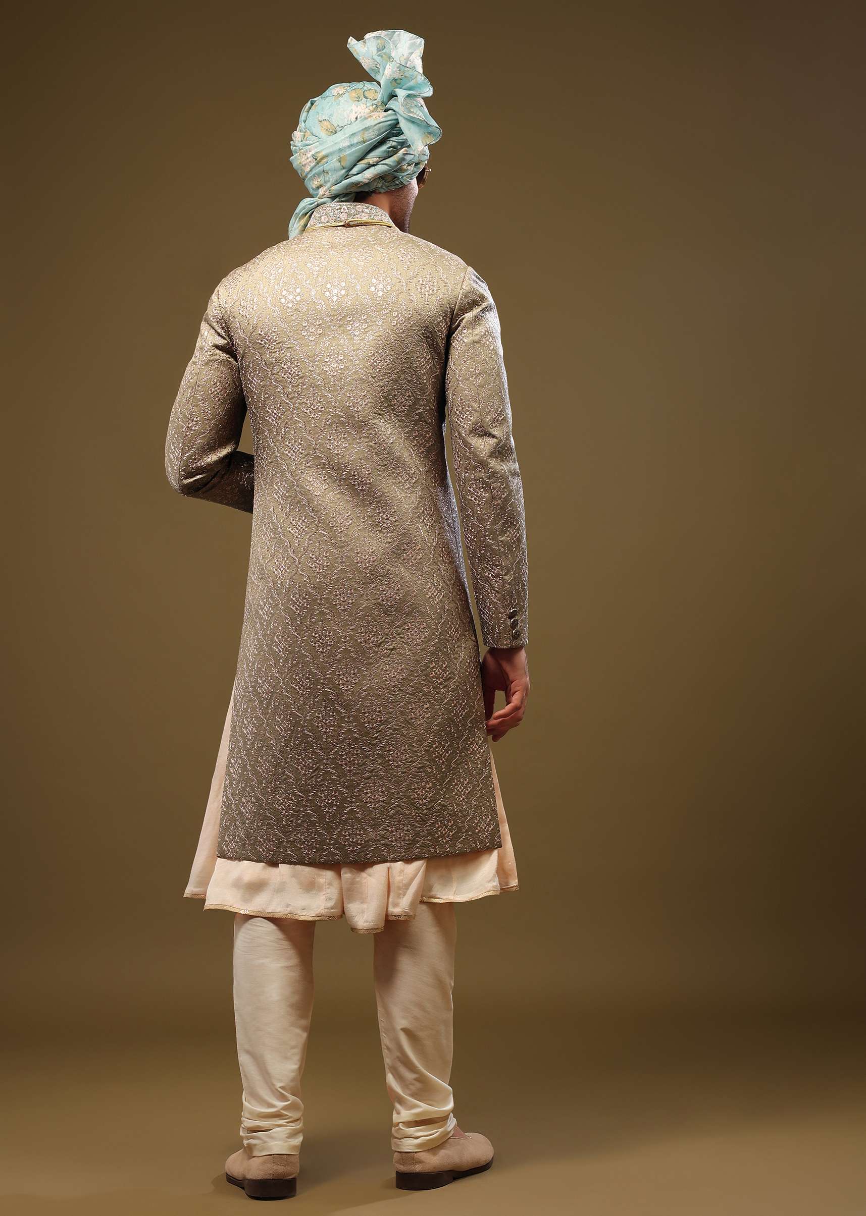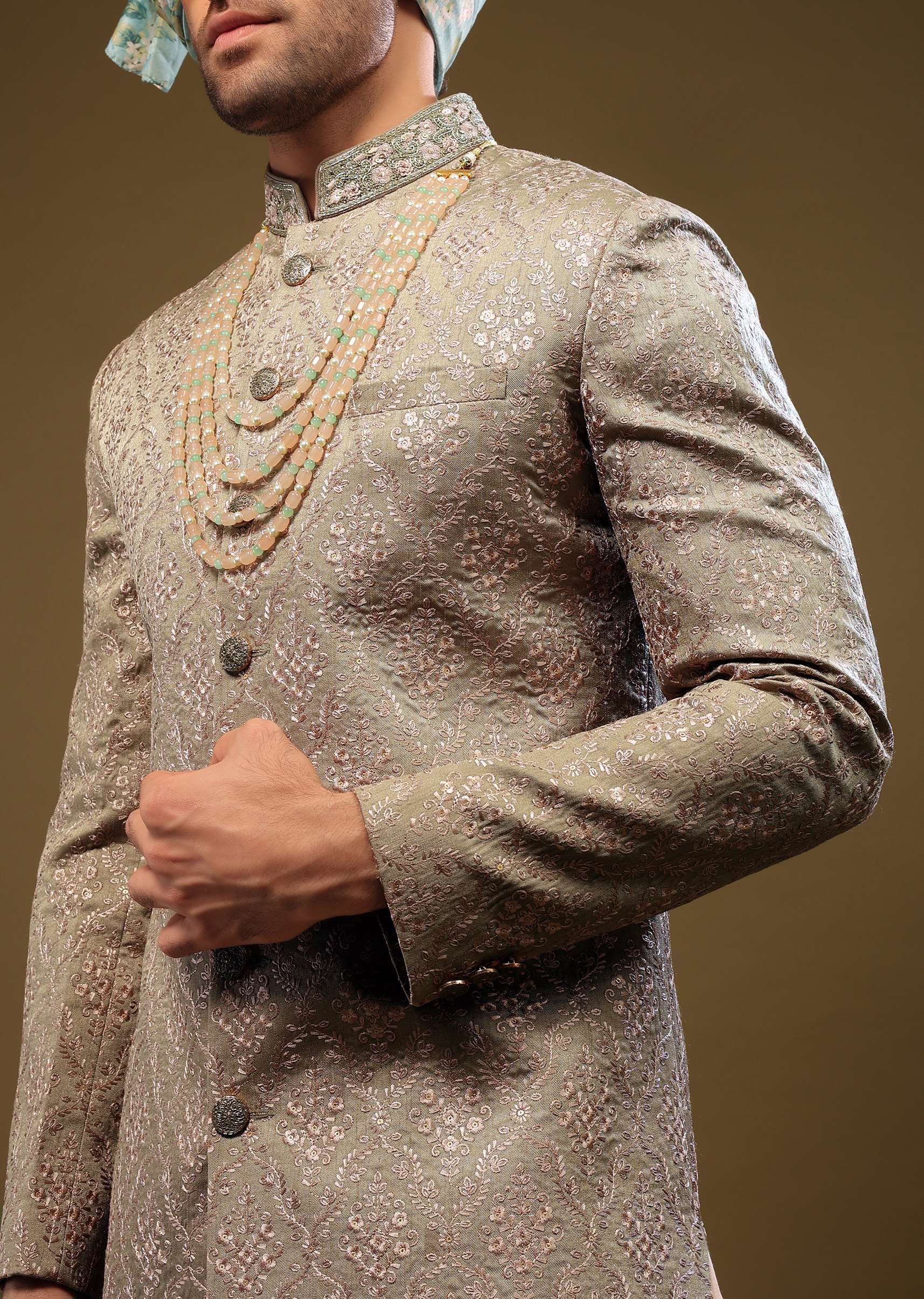 Mocha Brown Silk Sherwani Set With Threadwork And Sequins
