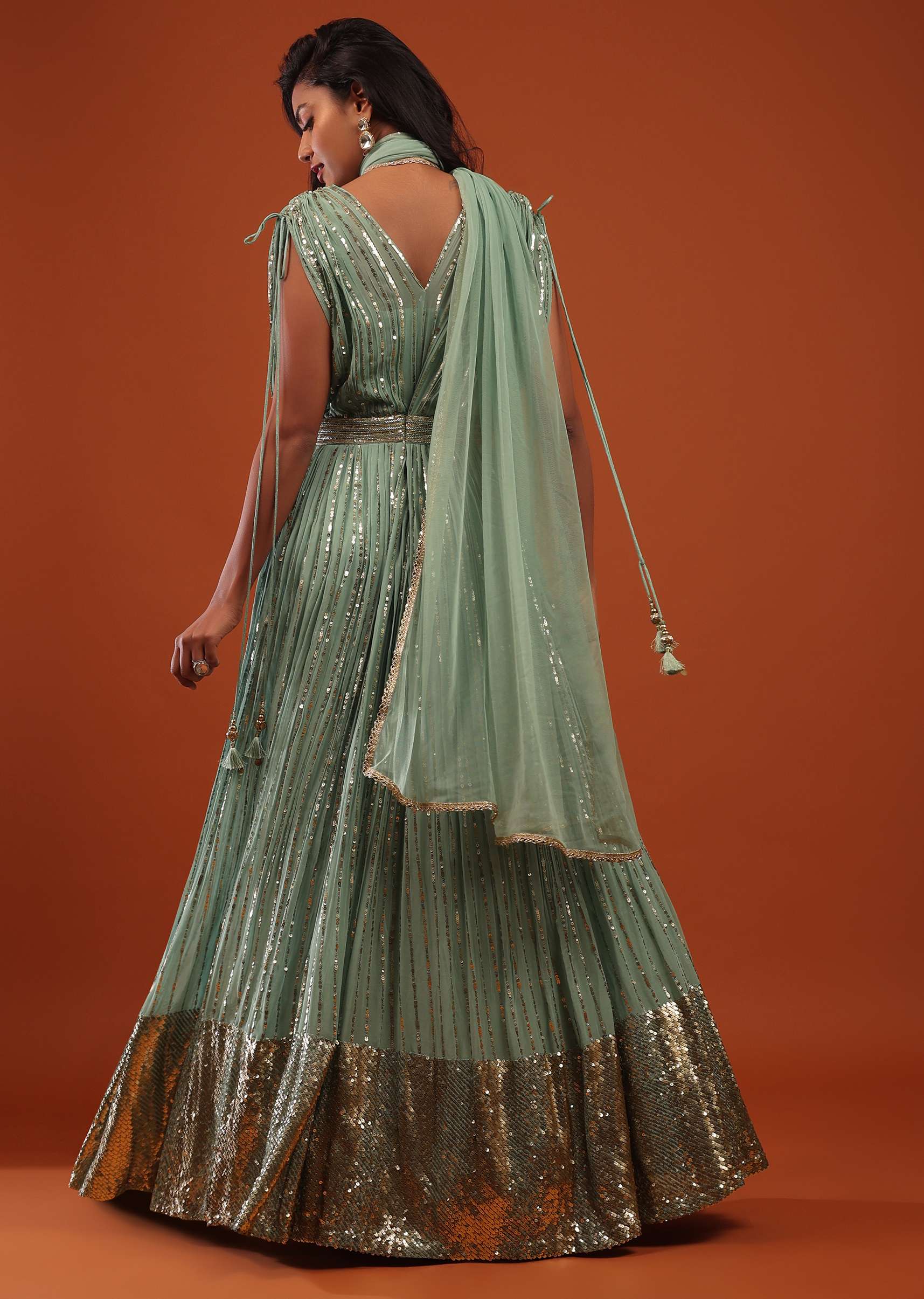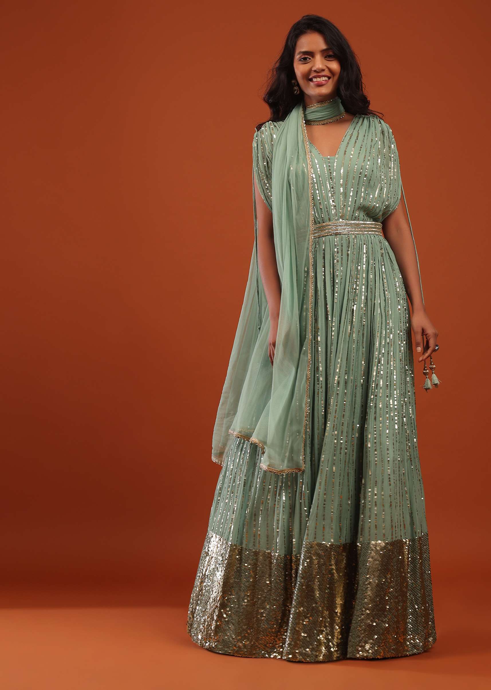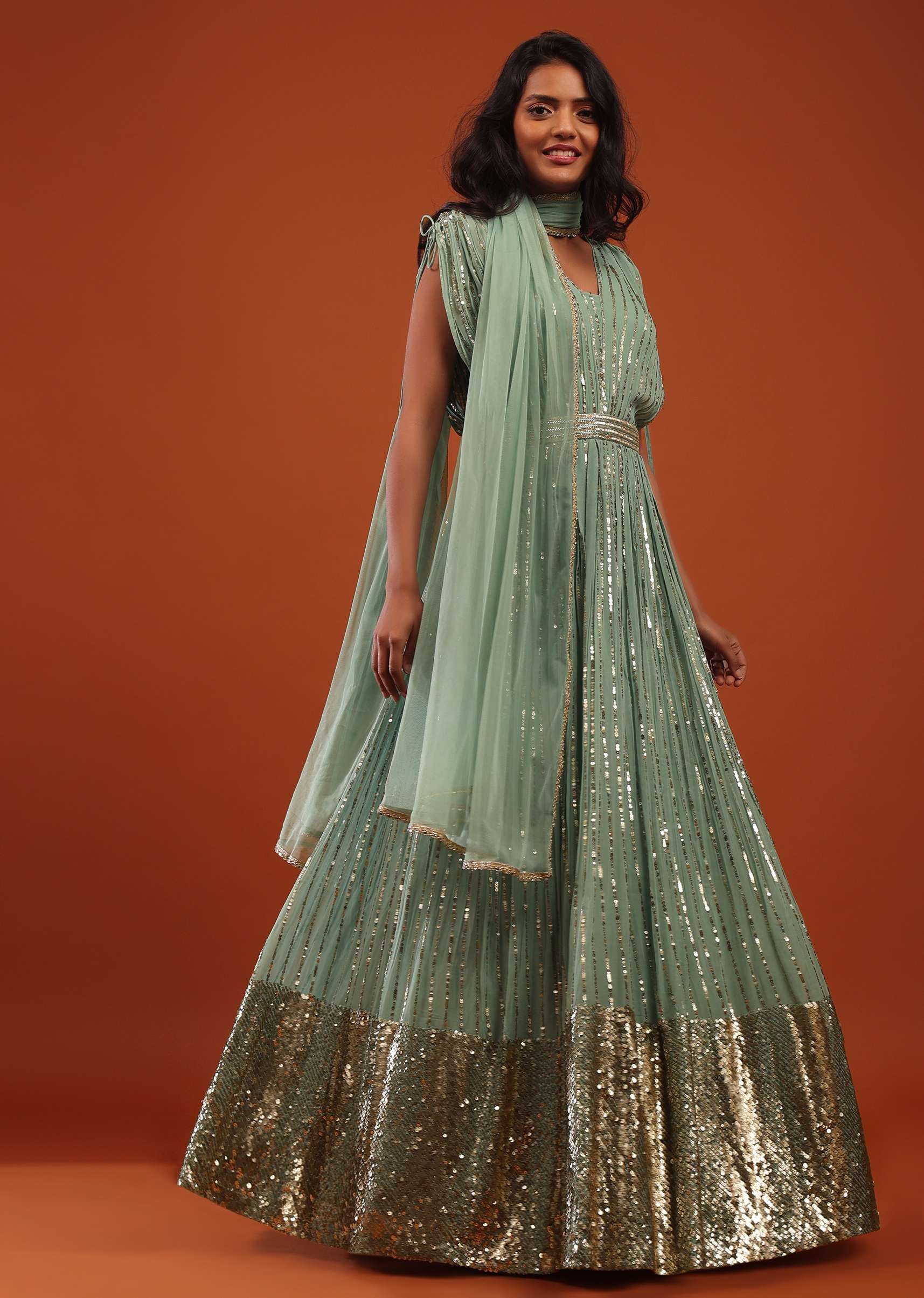 Sage Green Georgette Anarkali Suit In Sequins And Sali Work