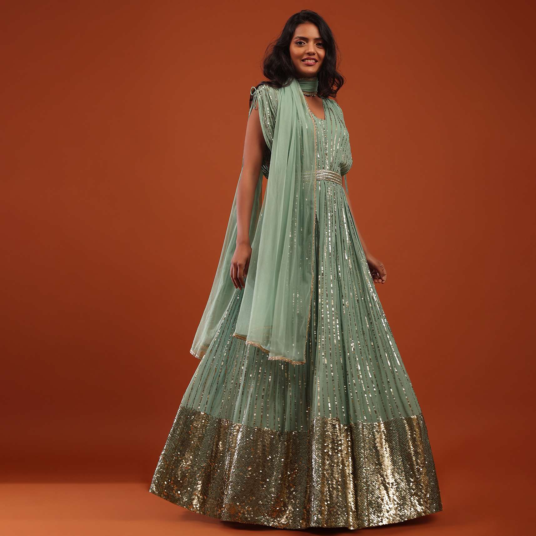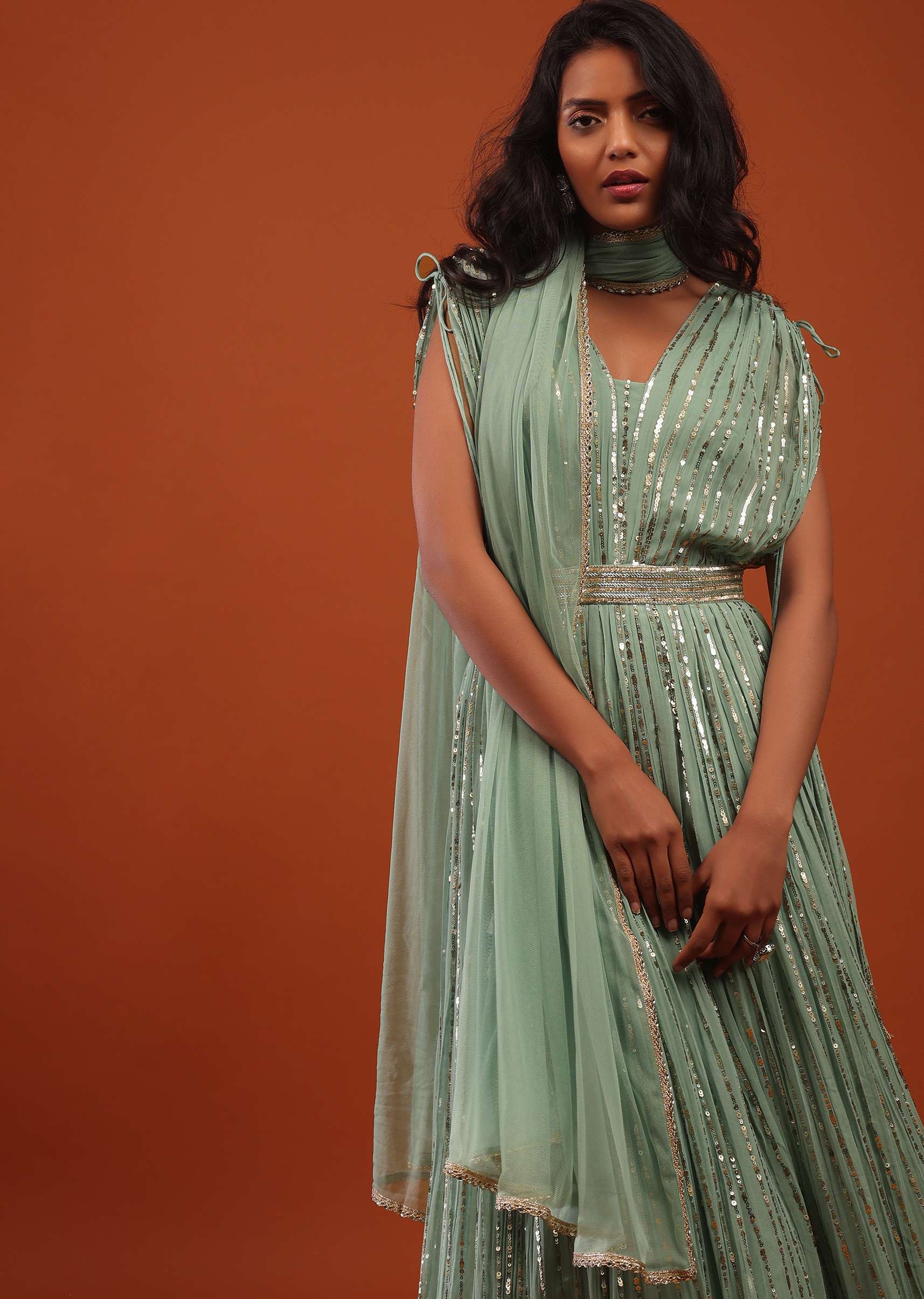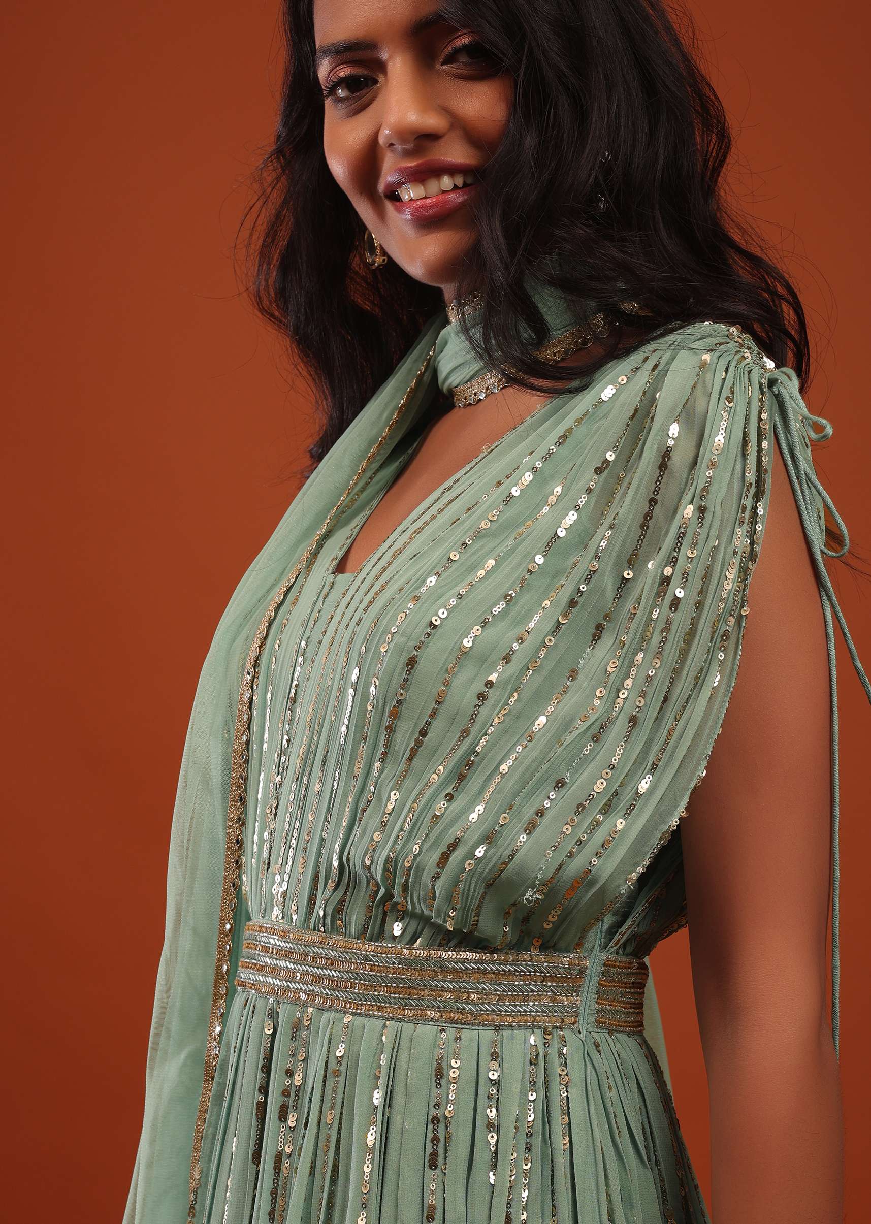 Sage Green Georgette Anarkali Suit In Sequins And Sali Work