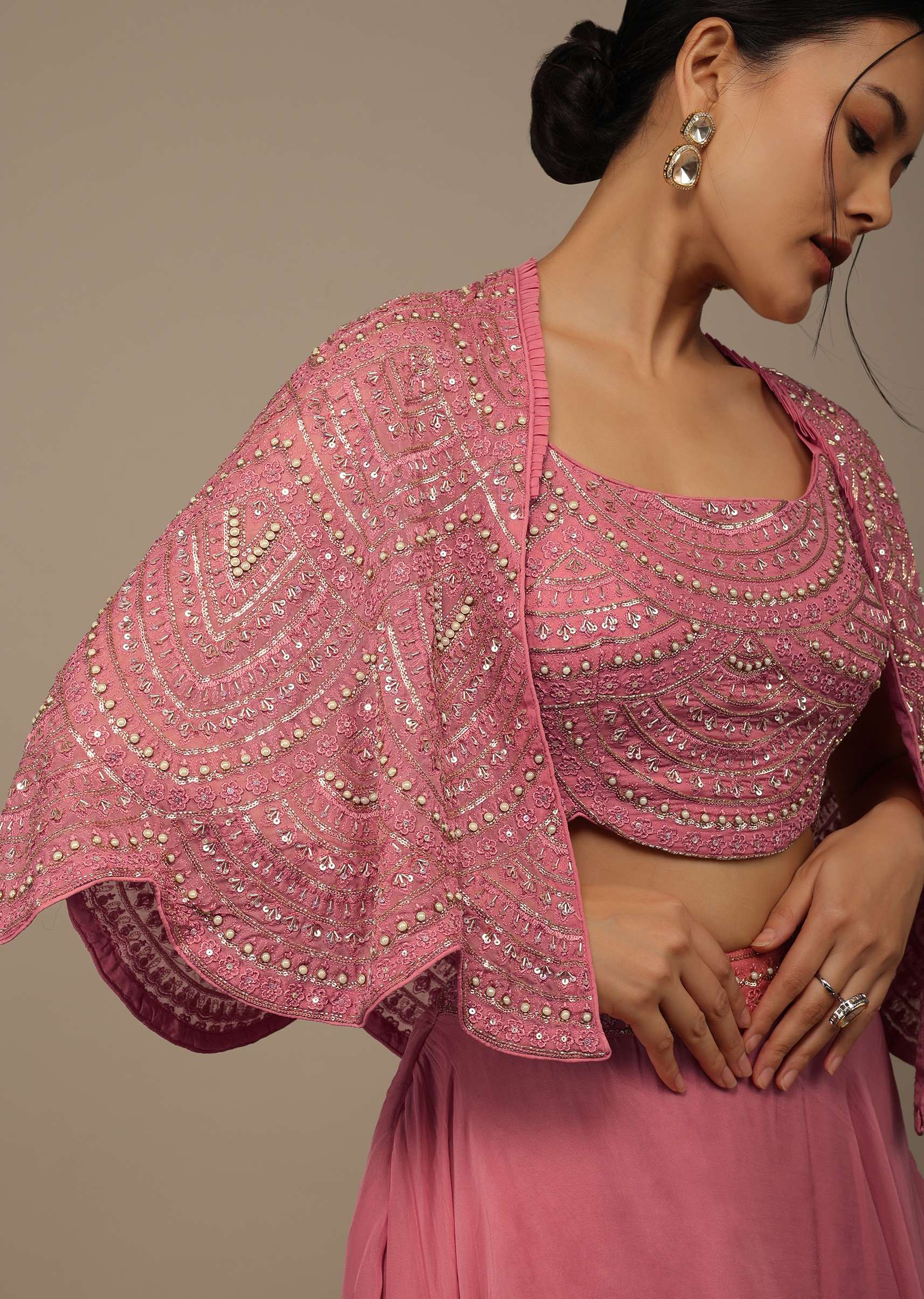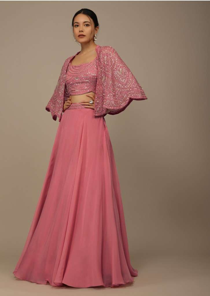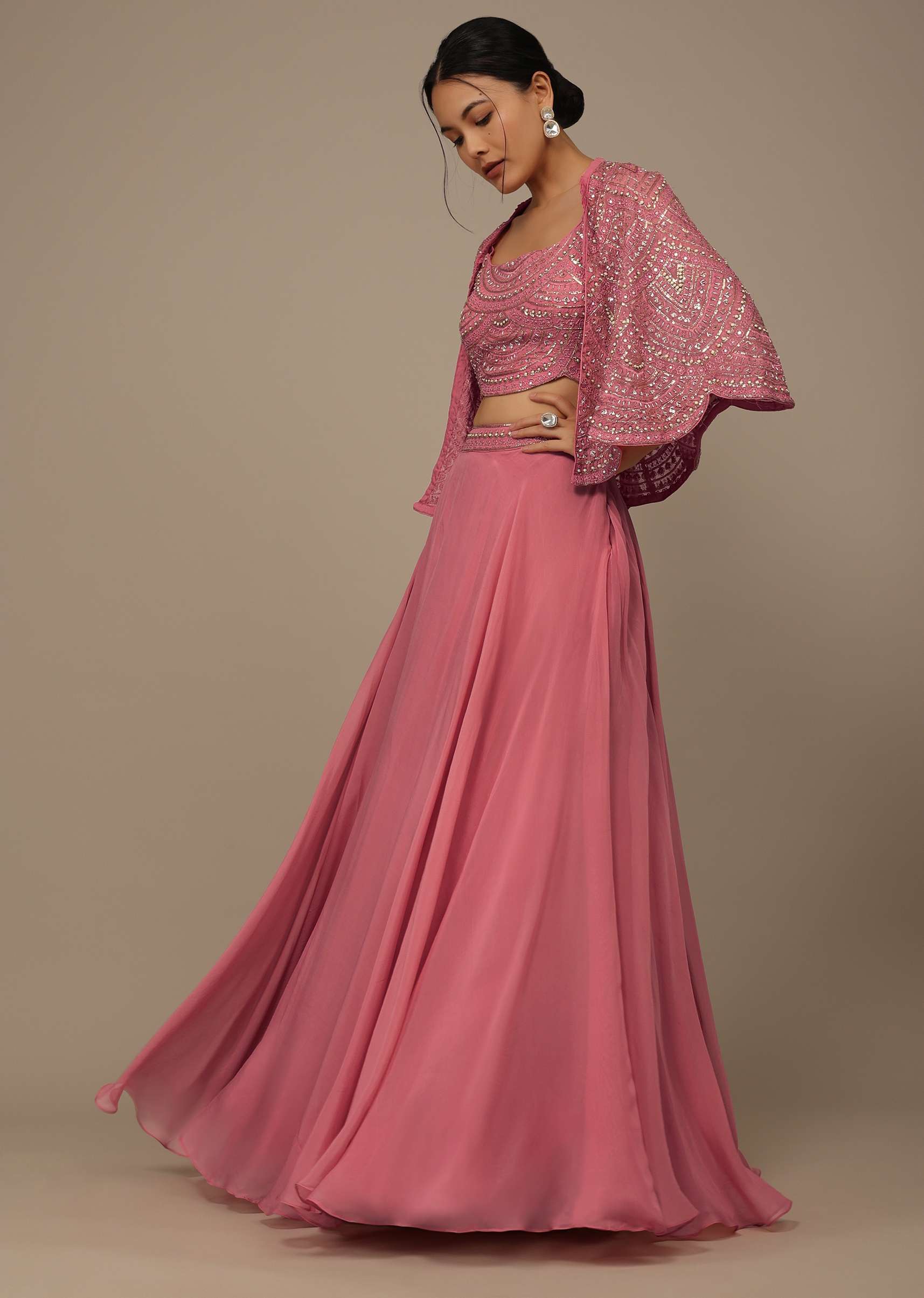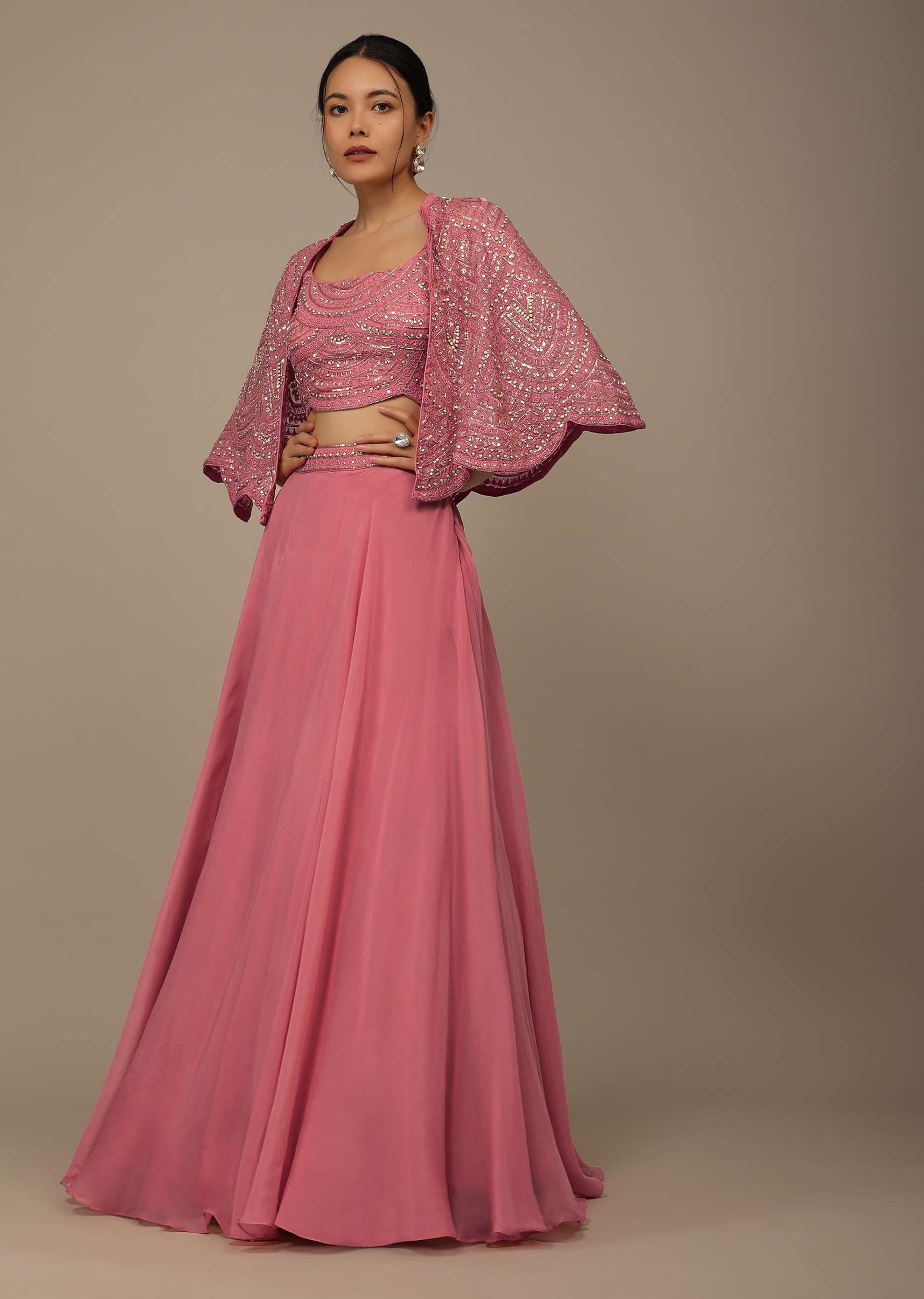 Salmon Pink Festive Embroidered Lehenga Set With Cape In Organza