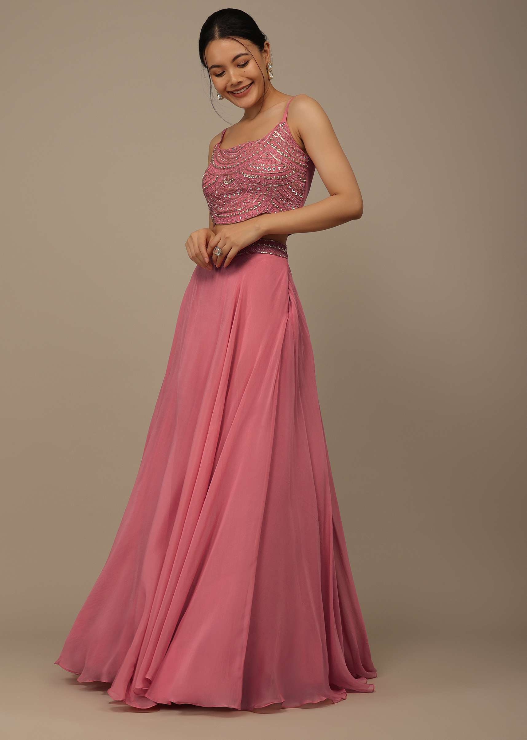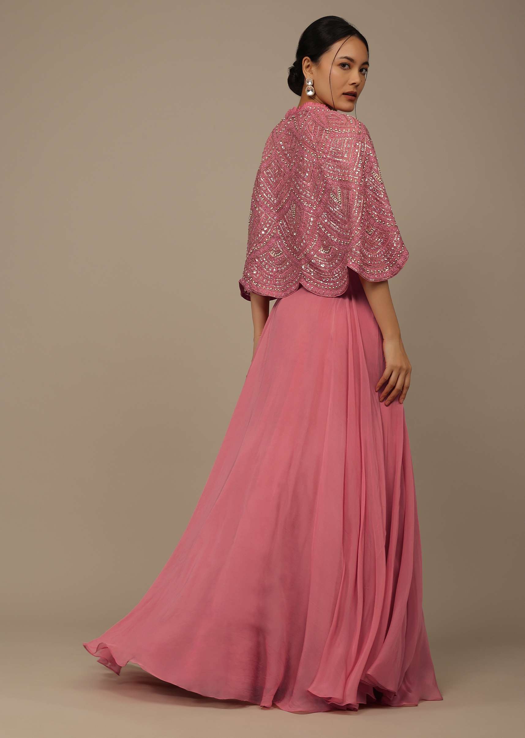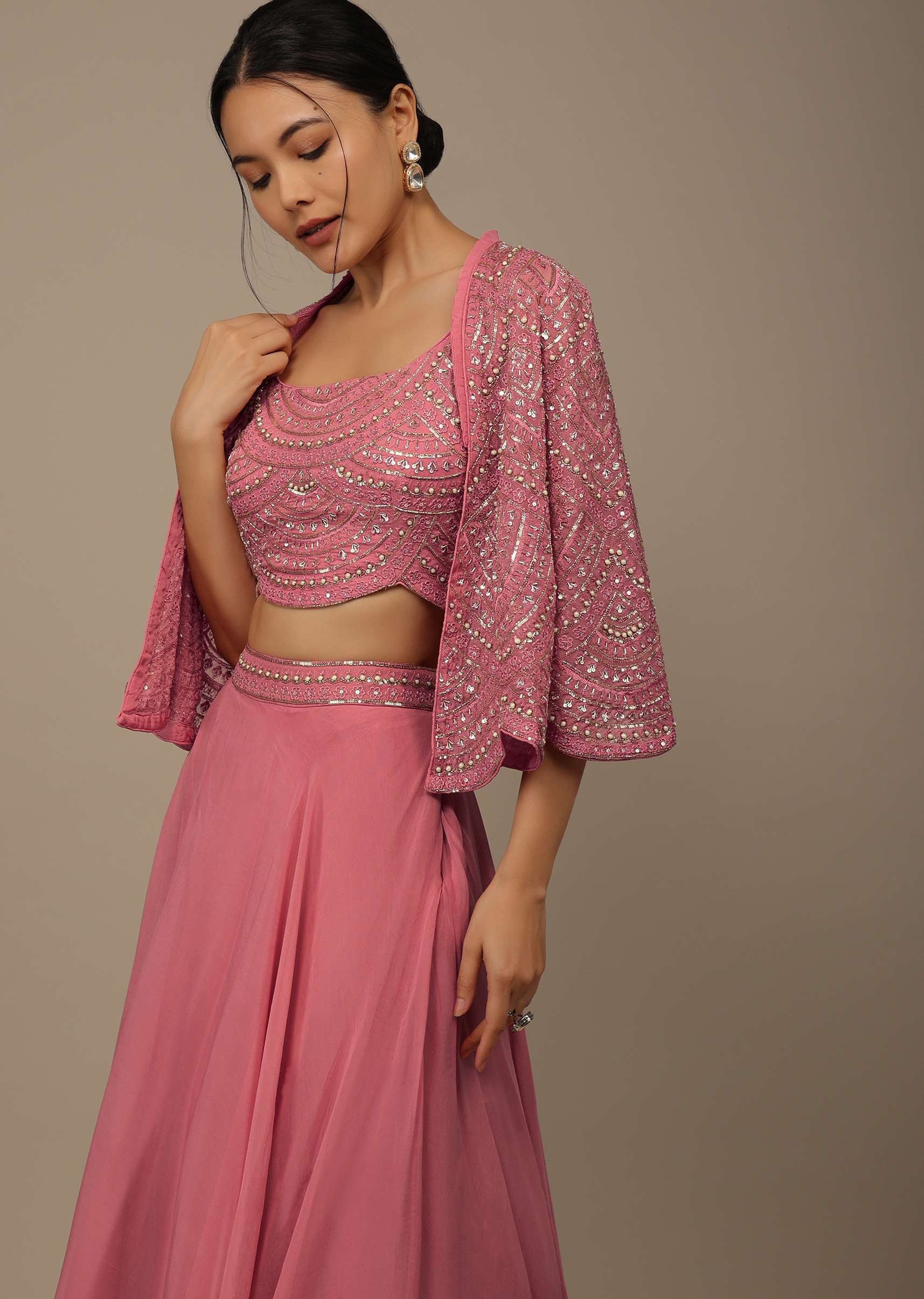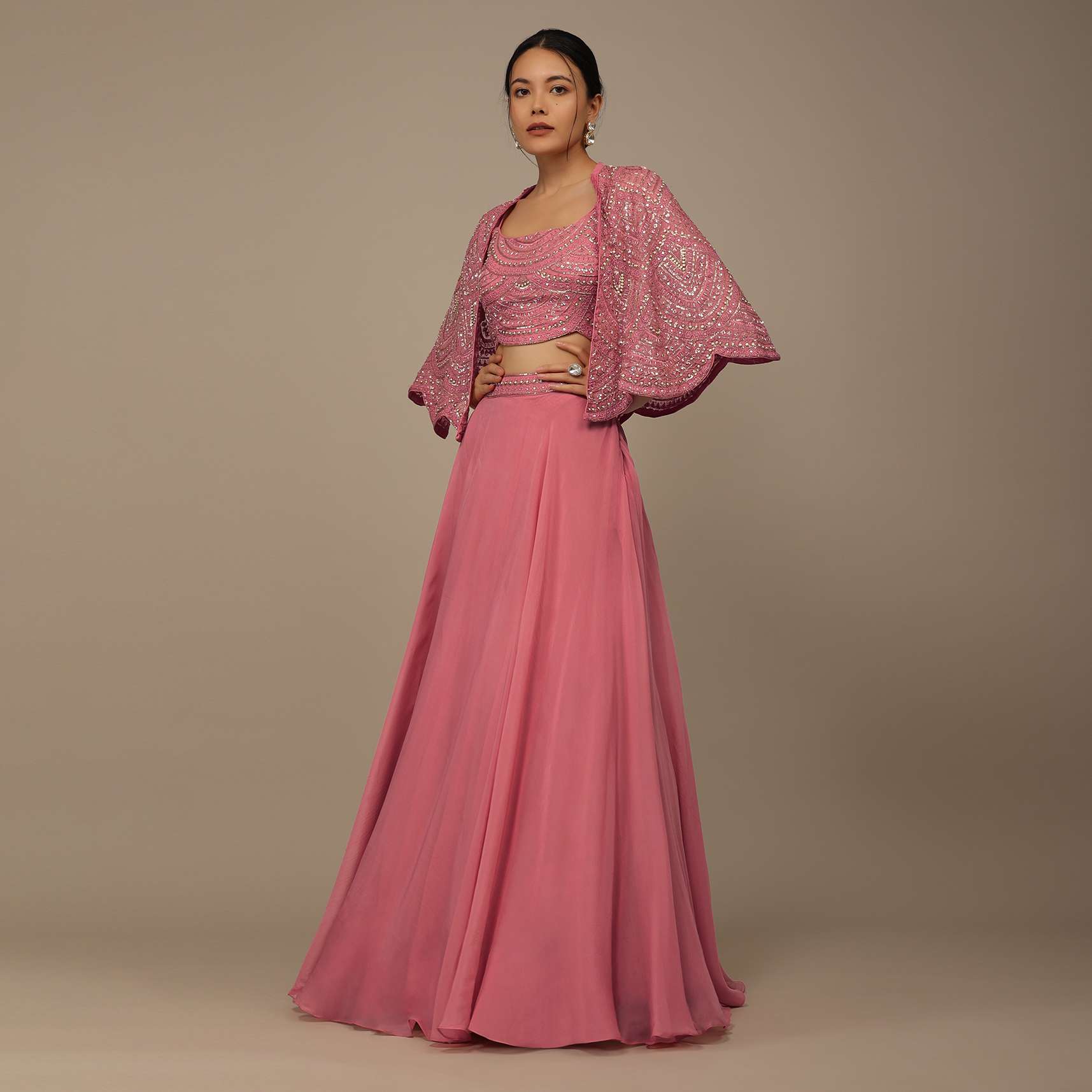 Salmon Pink Festive Embroidered Lehenga Set With Cape In Organza
