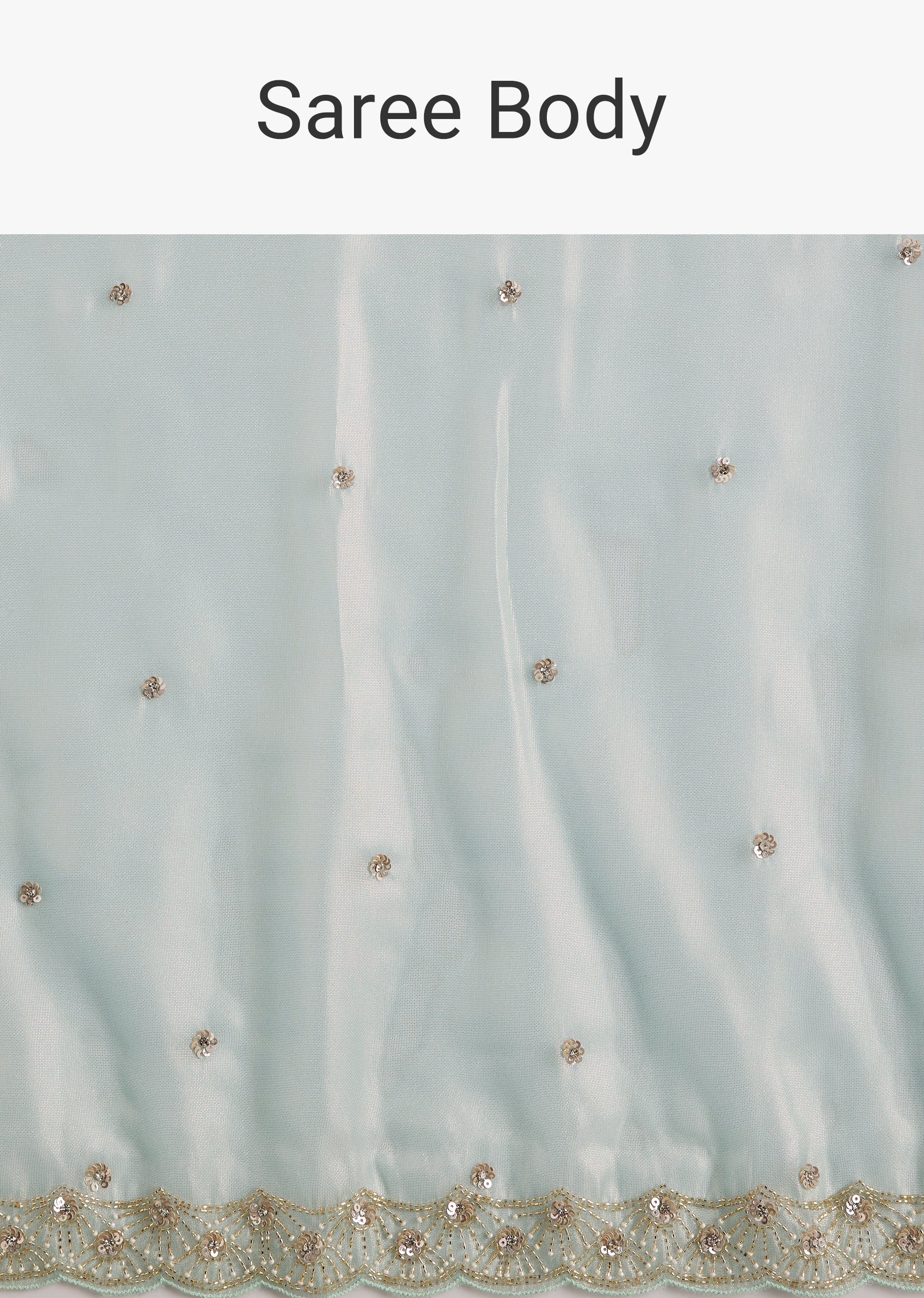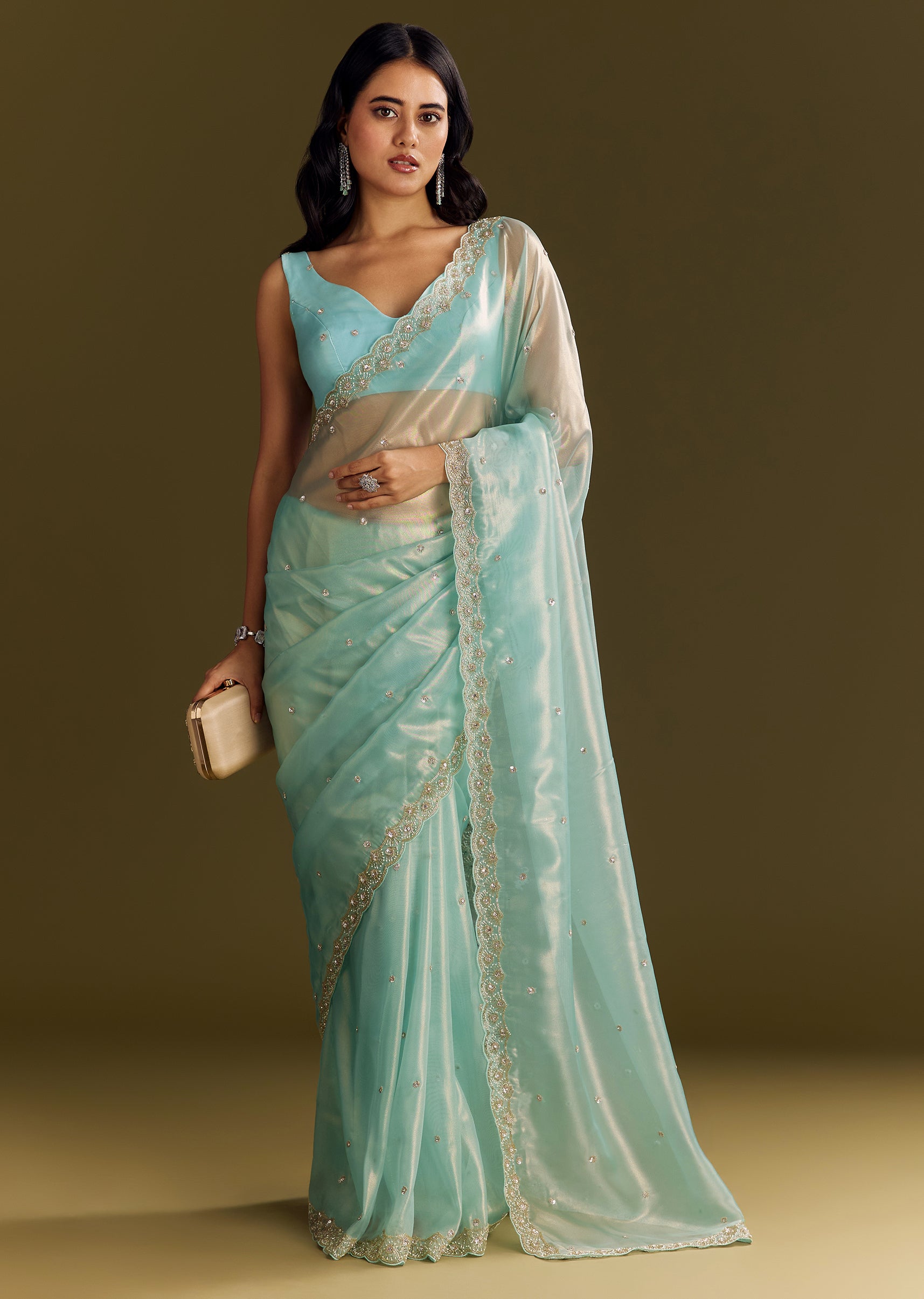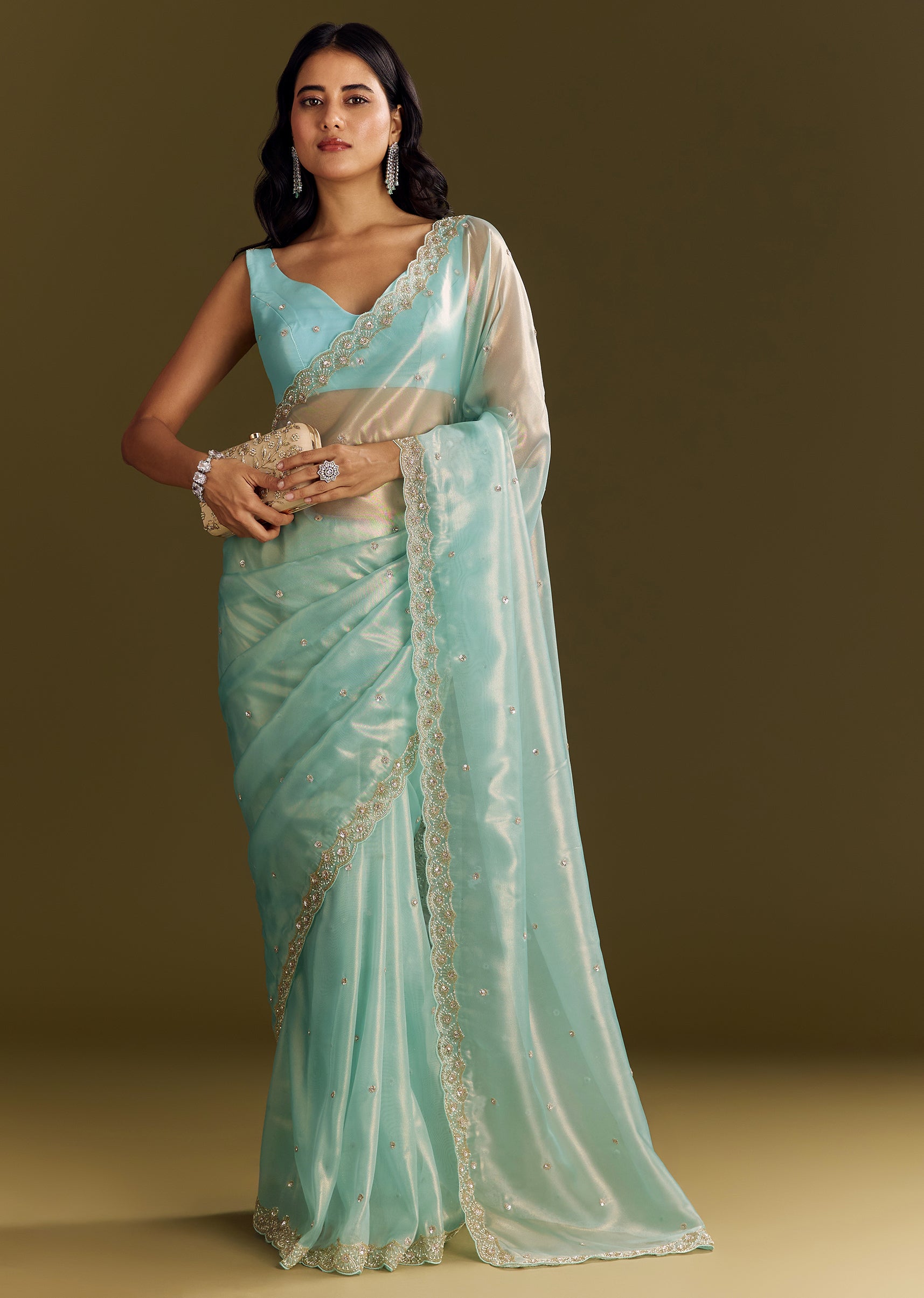 Sea Blue Glass Tissue Saree With Cutdana And Beads Scallop Border