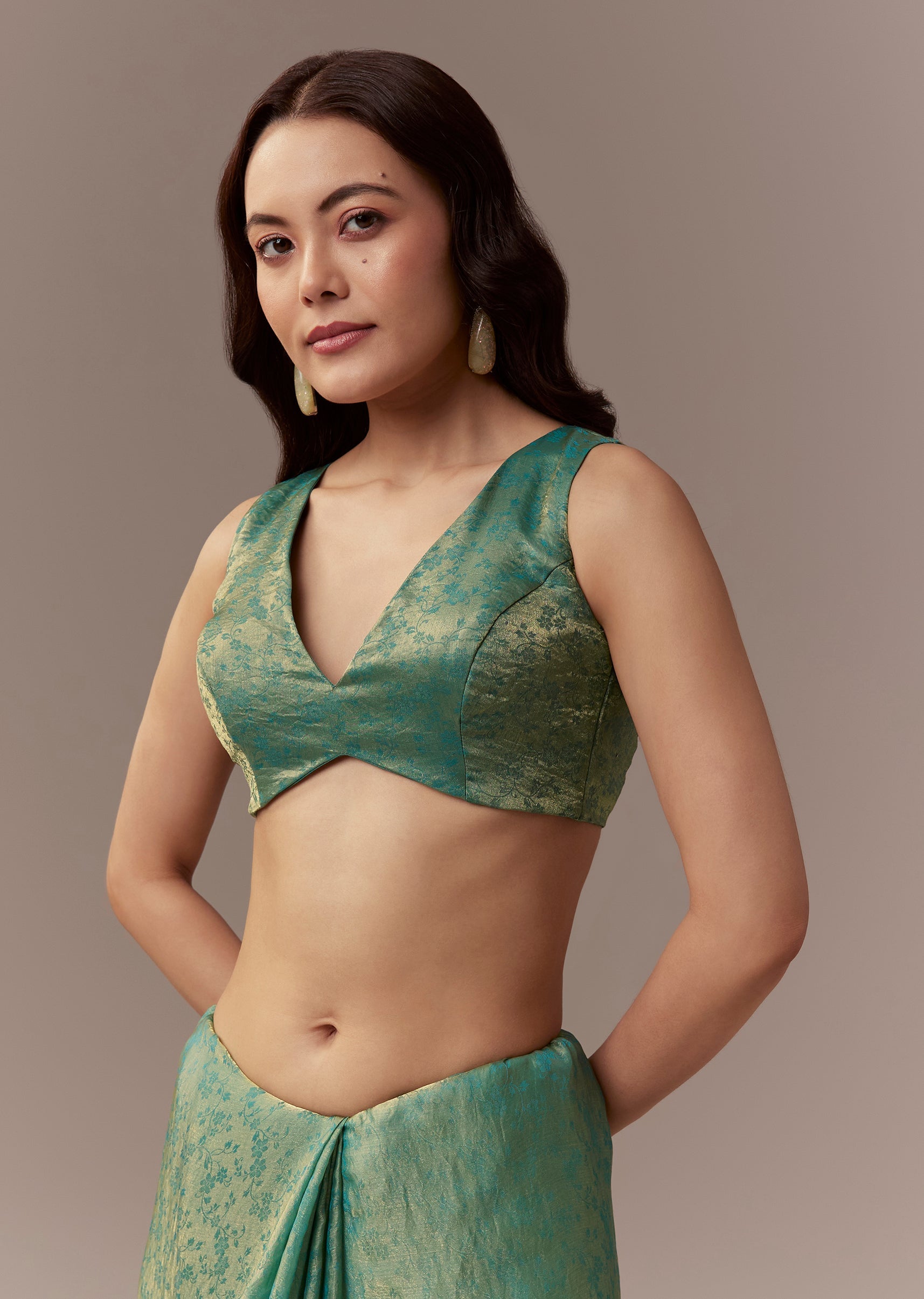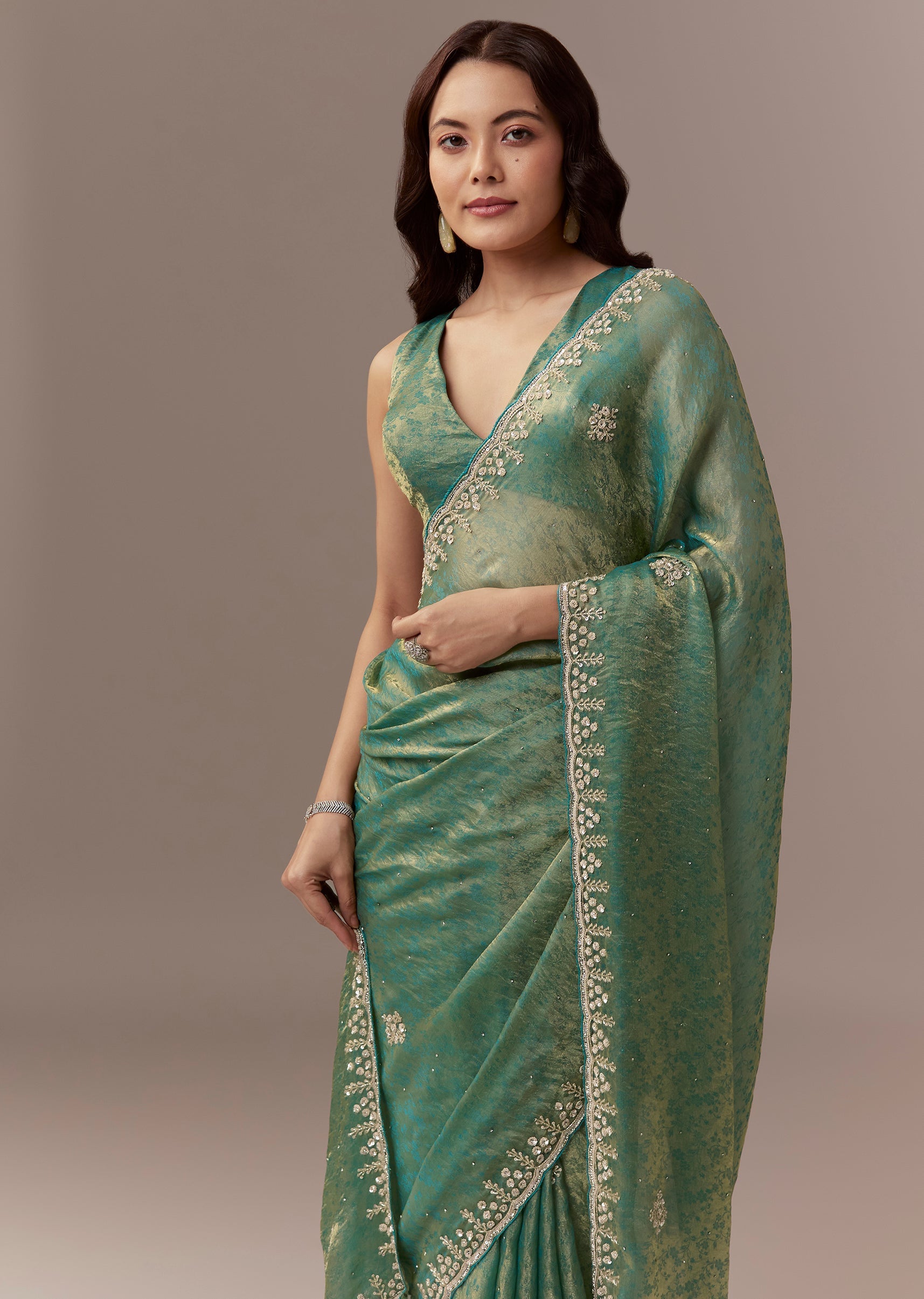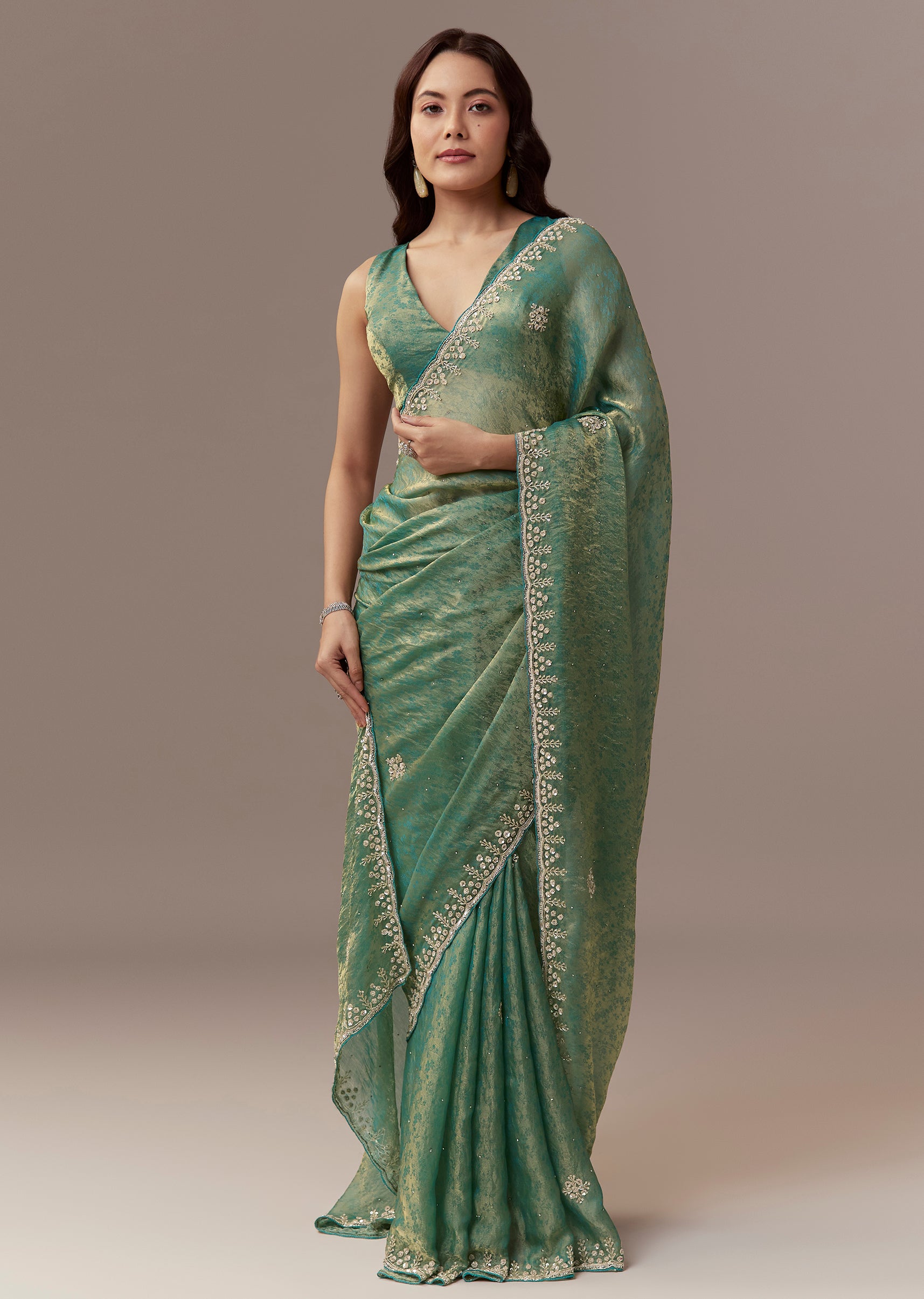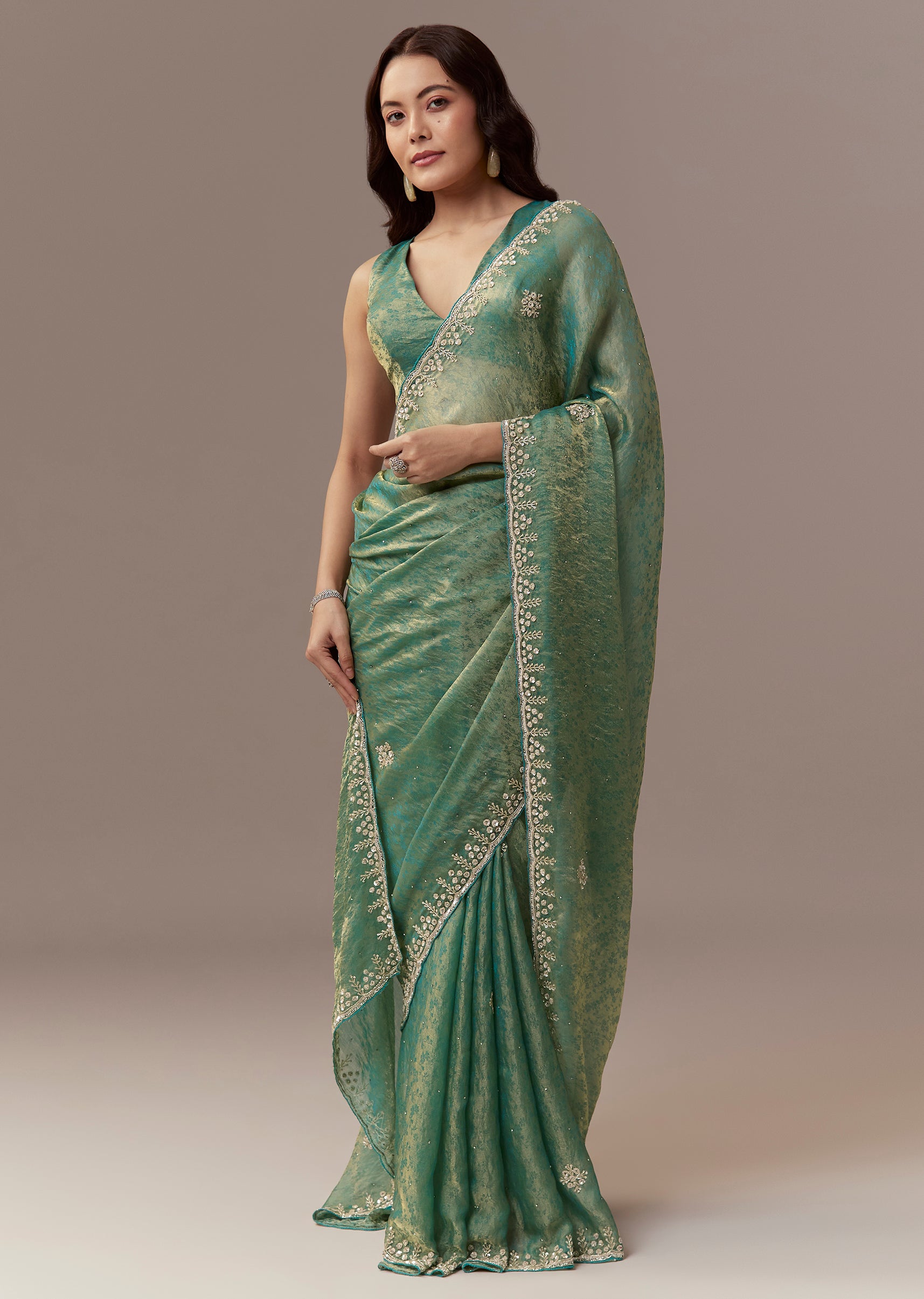 Sea Green Jacquard Tissue Saree With Cutdana Stones And Sequin Embroidery