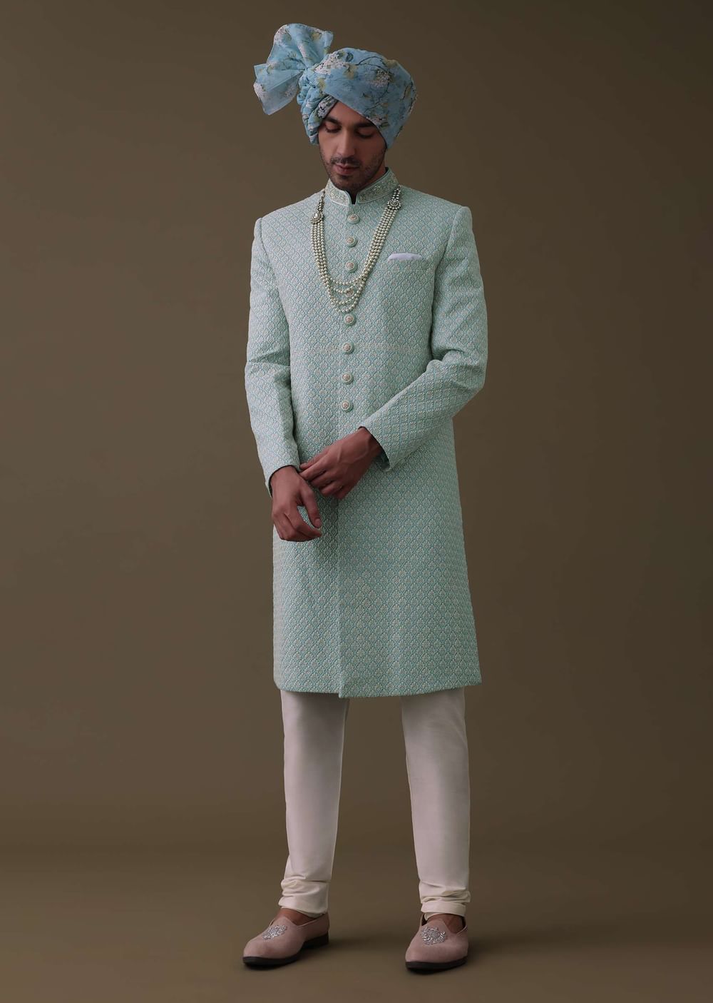 Sea Green Sherwani Set In Silk With Lucknowi Embroidery
