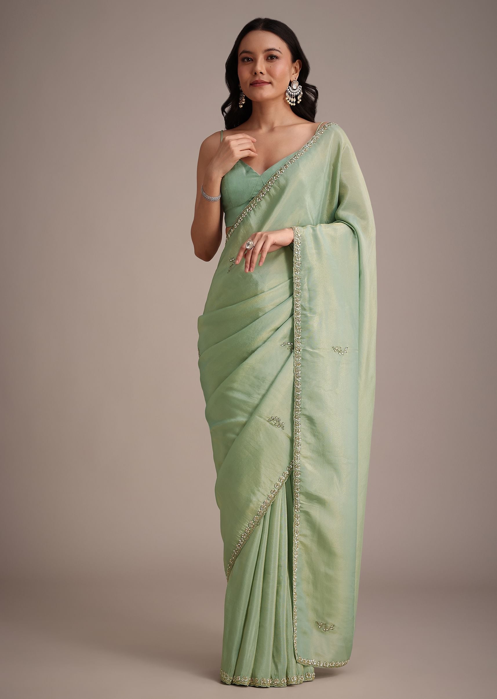 This sea green tissue saree features a beautifully embellished cutdana border adding a refined and modern touch to a classic color. Pair it with minimalist jewelry for a balanced look. Awarded as the Most Trusted Brand, we're delivering styles you love, just as promised.
