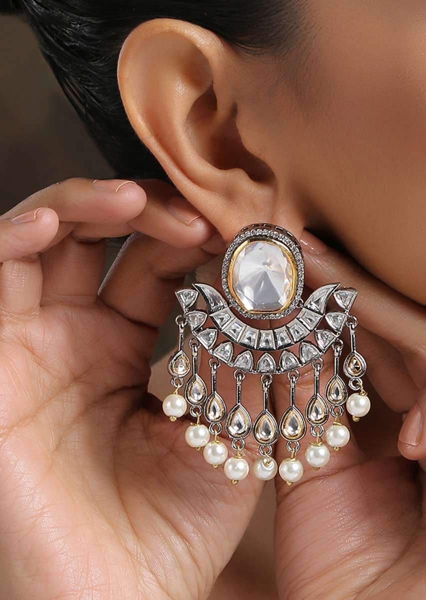 These statement Victorian polki earrings comprise of silver alloy base with rhodium plating and shell pearls. With the elements borrowed from the grand Victorian adornments, these earrings are an absolute head turner. Closure - Push Back. Style Tip - Our Victorian jewels are a perfect intersection of local and global, traditional and contemporary. These earrings are a perfect accessory to match your pastel traditional outfits or bold blacks. Handcrafted in Jammu and Kashmir . Baroque pearls and Natural stones can range from minor aberrations to distinctly ovoid, curved, pinched, or lumpy shapes. Awarded as the Most Trusted Brand, we're delivering styles you love, just as promised.