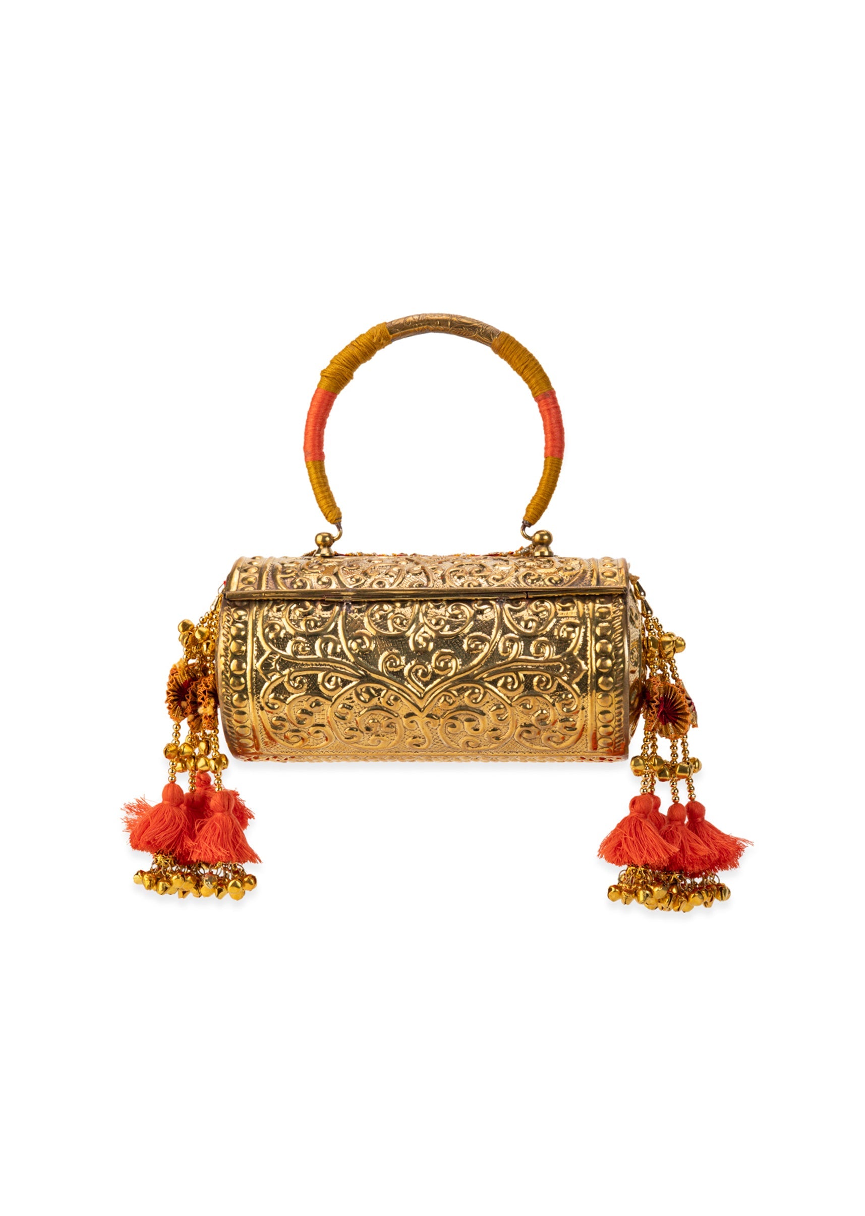 Silver and Gold Embossed Textured Metal Bag with Tassels