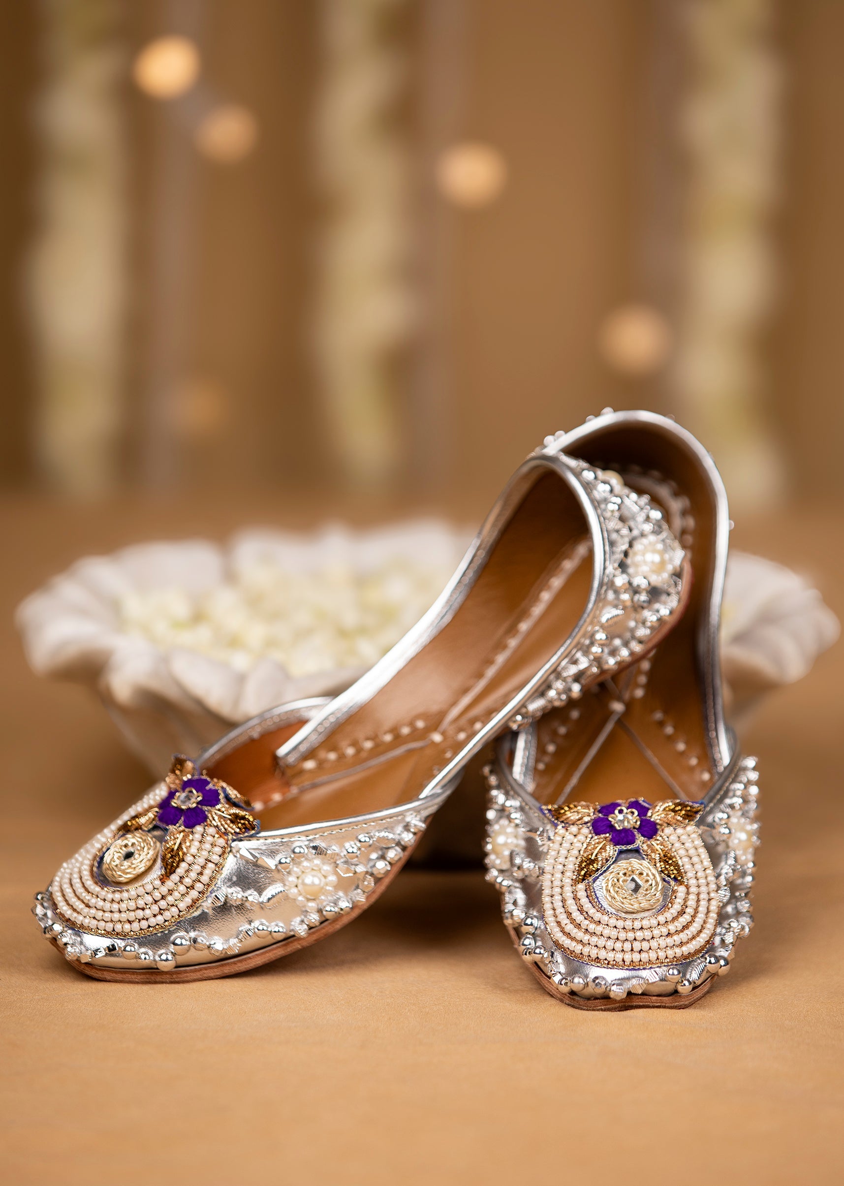 Step into celebration with these silver juttis that sparkle through intricate beadwork, lustrous pearls, and radiant metallic thread embroidery. Crafted from smooth faux leather, they blend traditional artistry with a... More Product Details