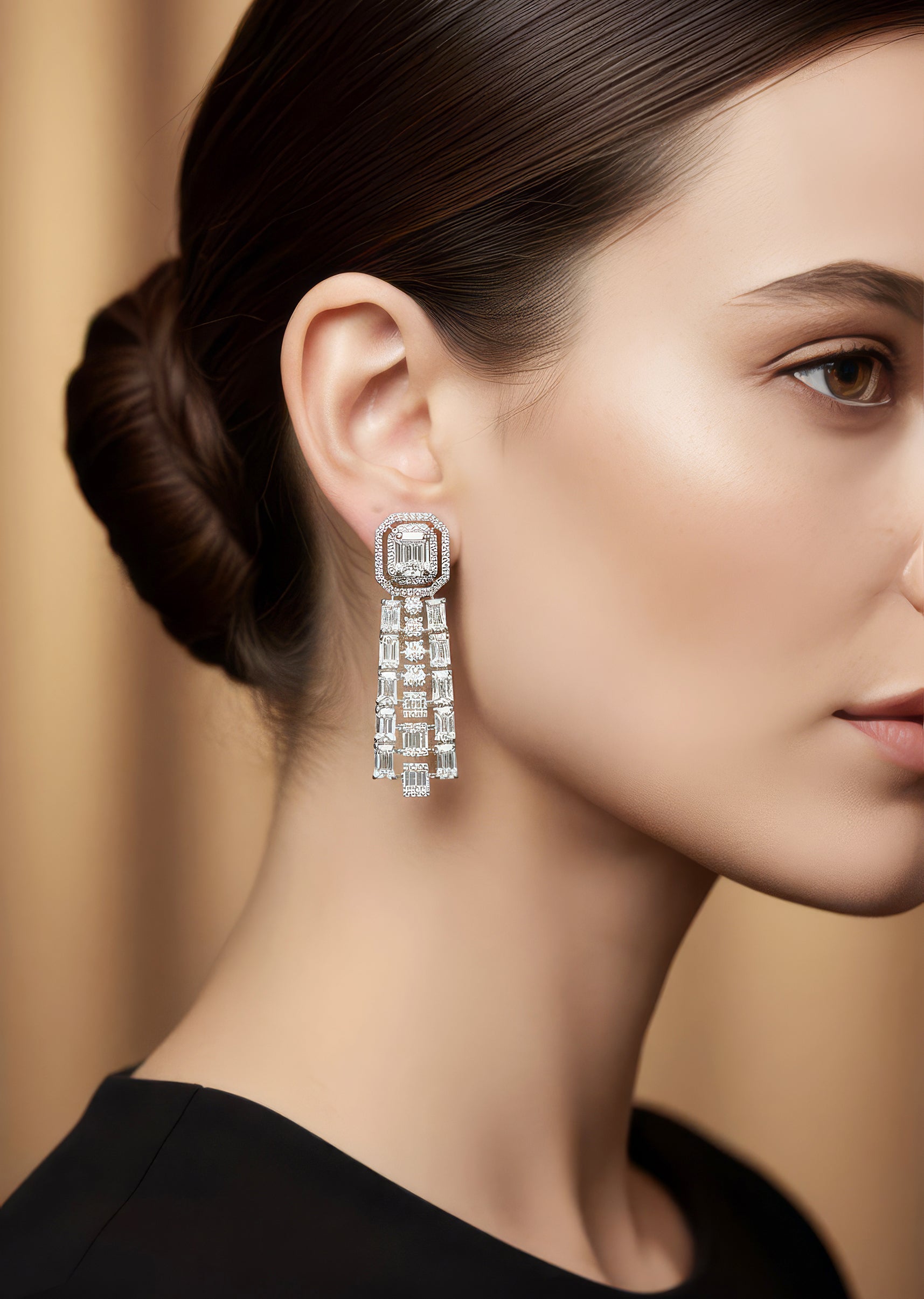 A modern pair of silver finish earrings featuring an Art Deco-inspired design with baguette style simulated accents. The structured geometric pattern adds a contemporary and elegant appeal, making them perfect for reception evenings, cocktail parties, and festive celebrations. Ideal for bridesmaids and wedding guests seeking a stylish statement piece.