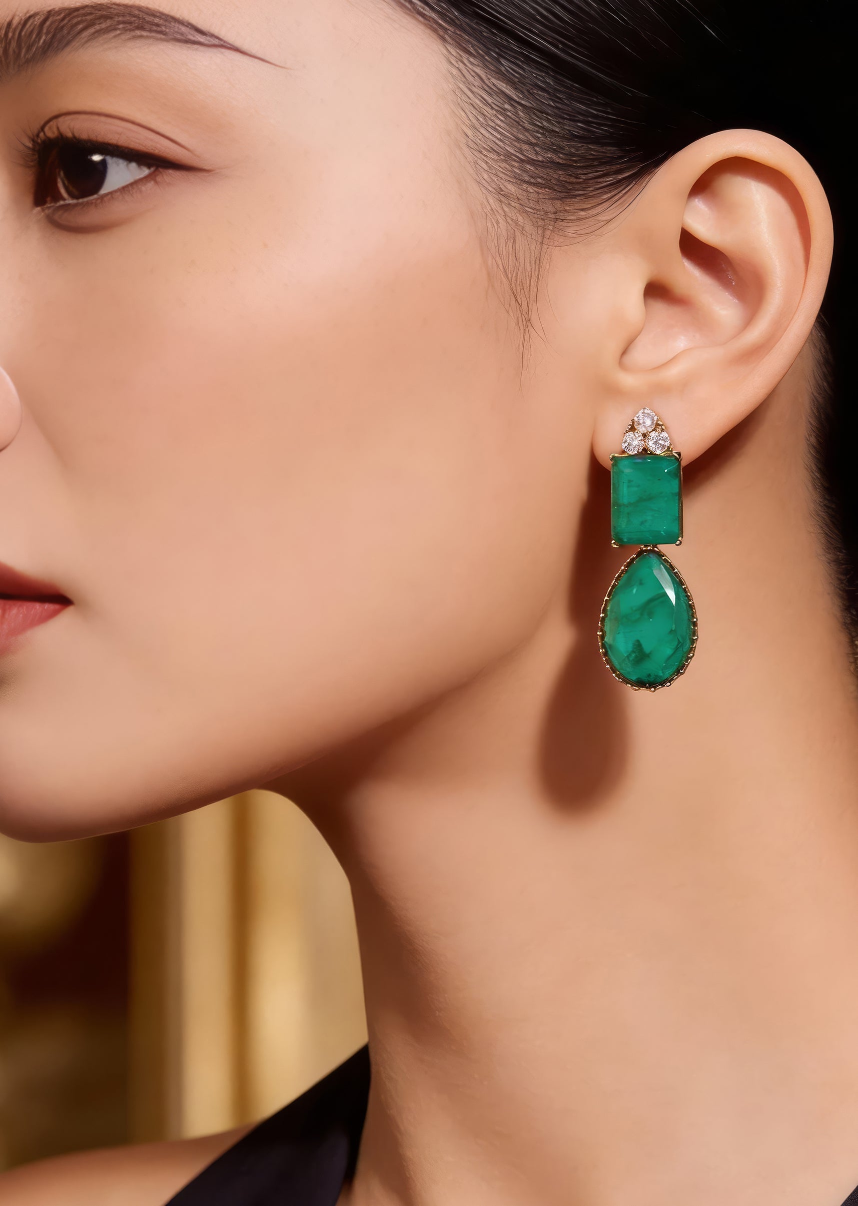 Pair them with a sleek saree, evening gown, or modern lehenga to highlight the green stone and crystal detailing.