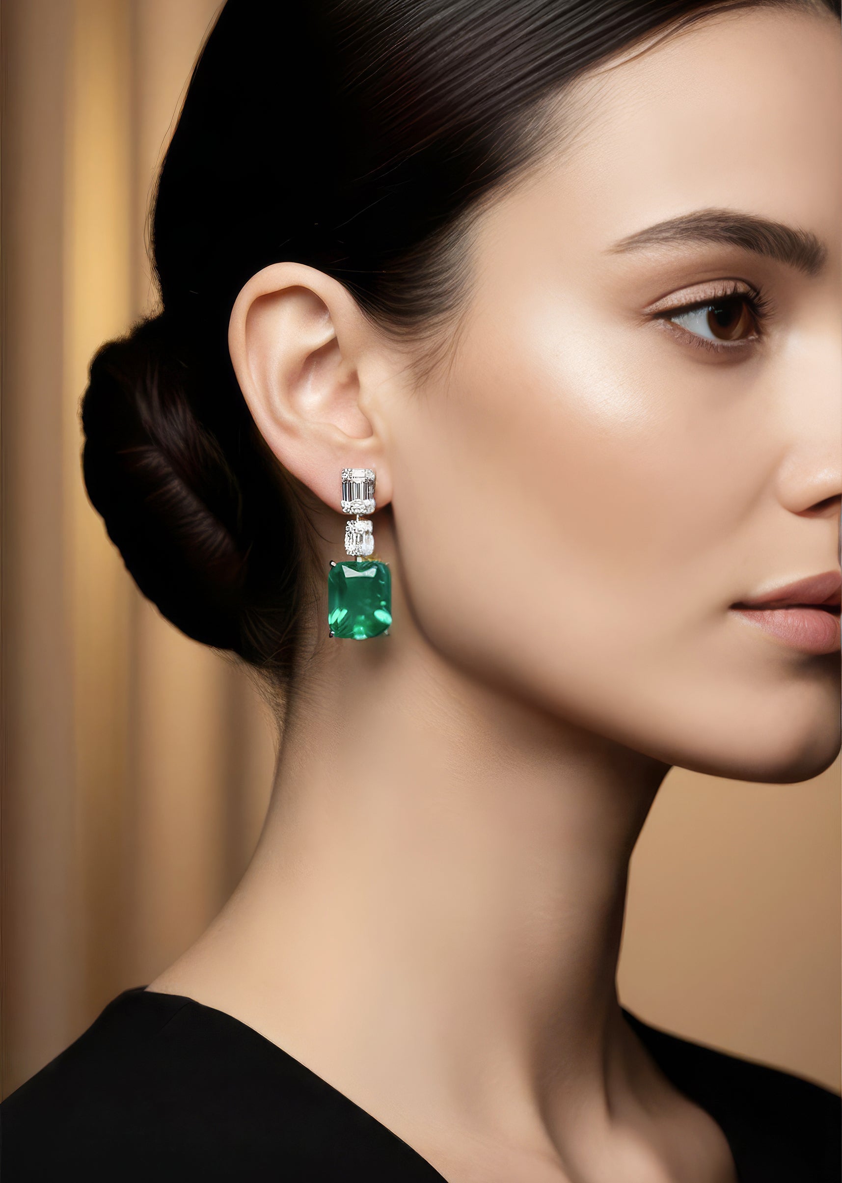 A modern pair of silver finish earrings featuring subtle mix metal detailing and a striking large green emerald style stone. The contemporary design adds a bold and elegant touch, perfect for reception evenings, cocktail parties, and festive celebrations for bridesmaids and wedding guests.