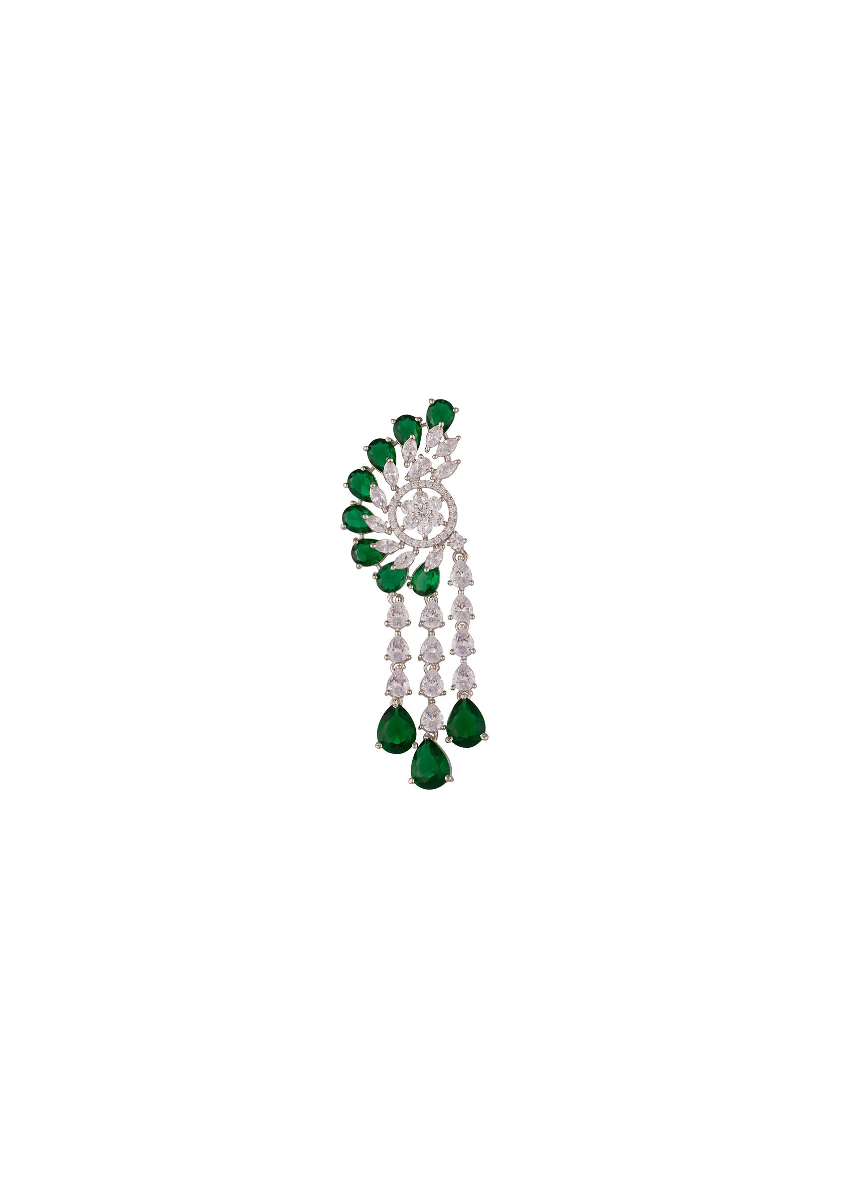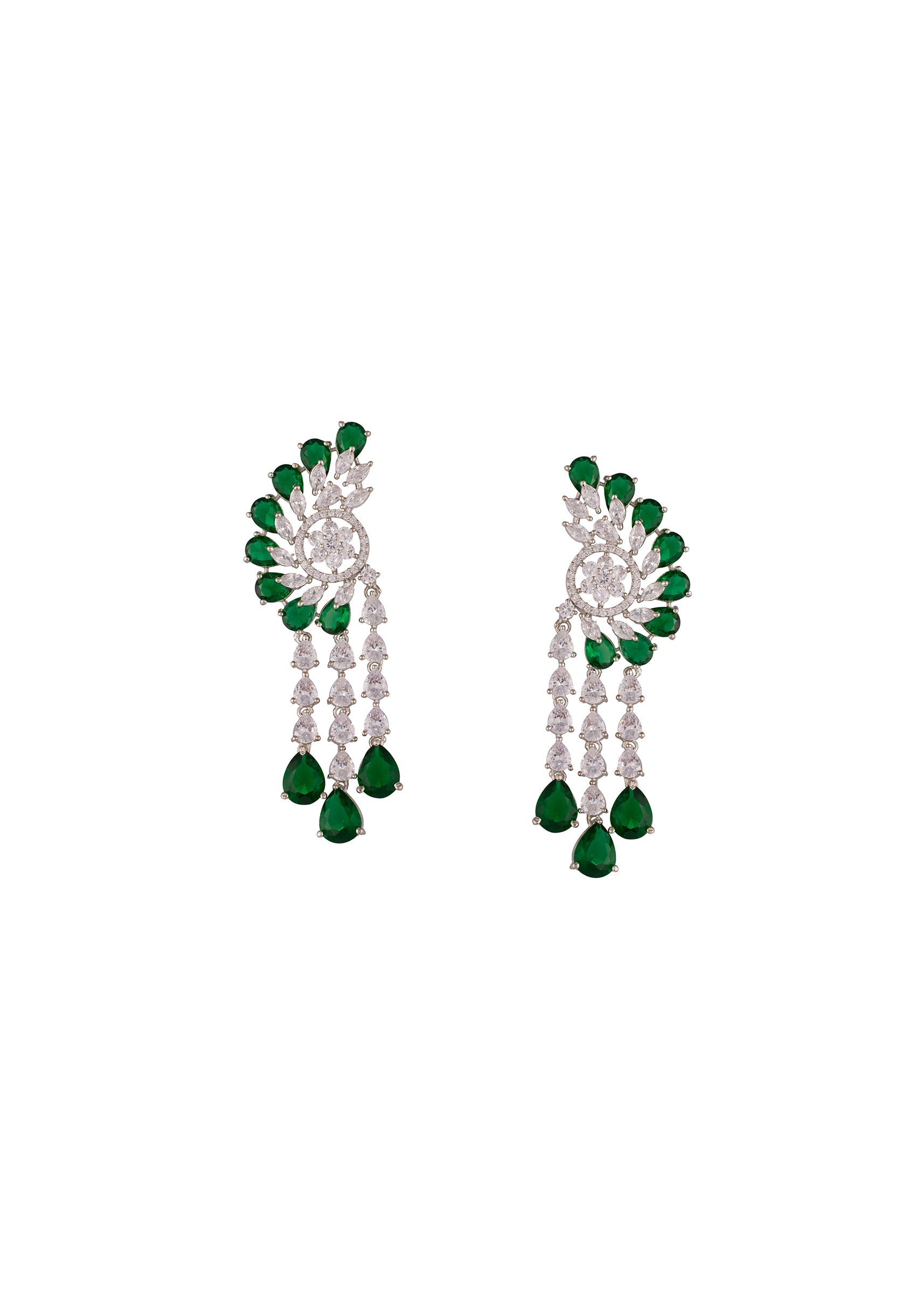 A silver toned modern long earring featuring a radial fan of faceted pear and marquise cut green stones with multiple dangling tiers of brilliant white cubic zirconia stones. Handcrafted with precision, these earrings combine contemporary design with sparkling gemstones for a striking festive and wedding ready look. Perfect for evening events, parties, or celebration wear, they add a refined and elegant touch to any outfit.