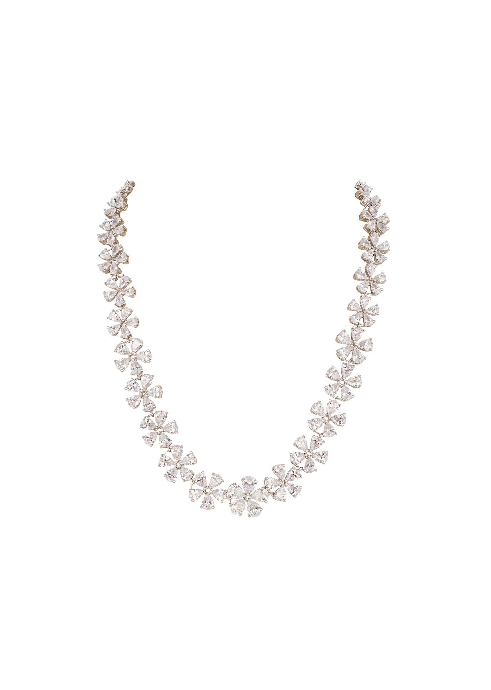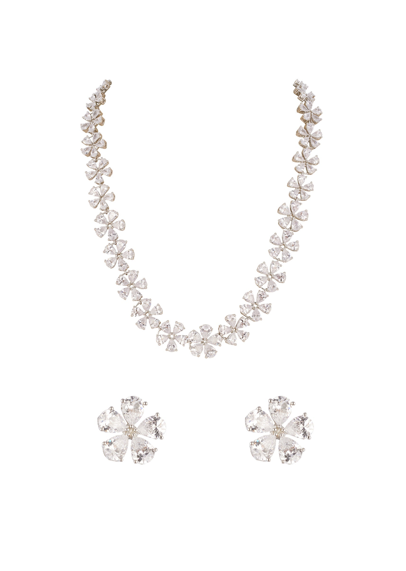 Silver Finish Necklace Set In Mix Metal With Contemporary Floral Style And White Cubic Zirconia Accents