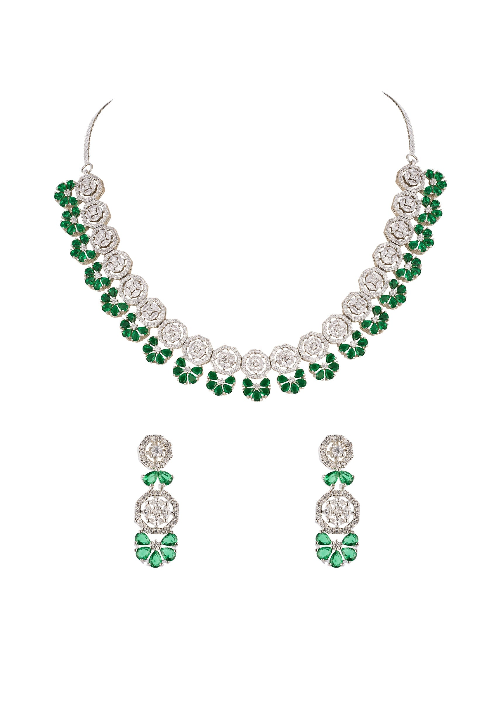 Silver Finish Necklace Set In Mix Metal With Elegant Floral Style And Green Simulated Emerald And Cubic Zirconia Accents