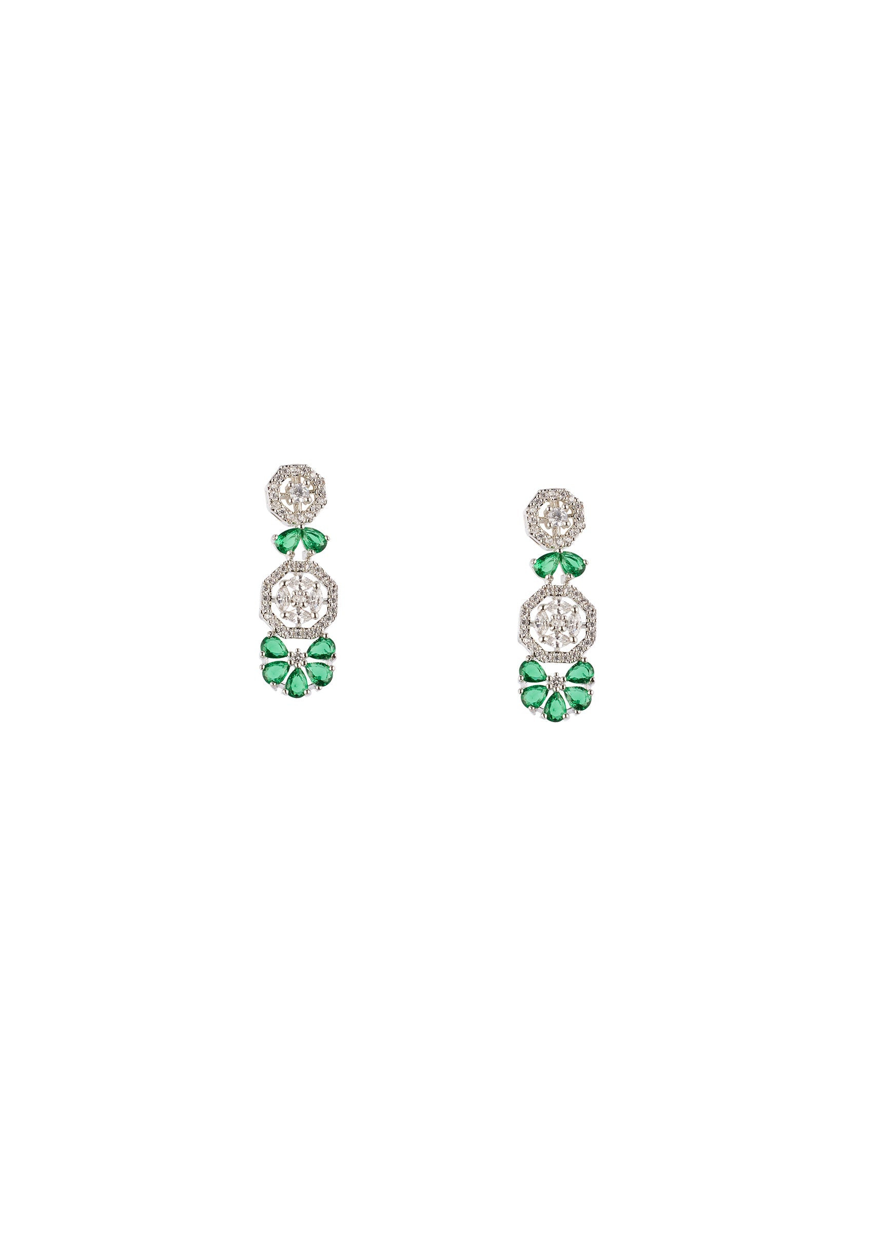 This elegant silver finish necklace set is crafted in mix metal and features a floral inspired design highlighted with green simulated emerald stones and cubic zirconia. The intricate floral detailing... More Product Details