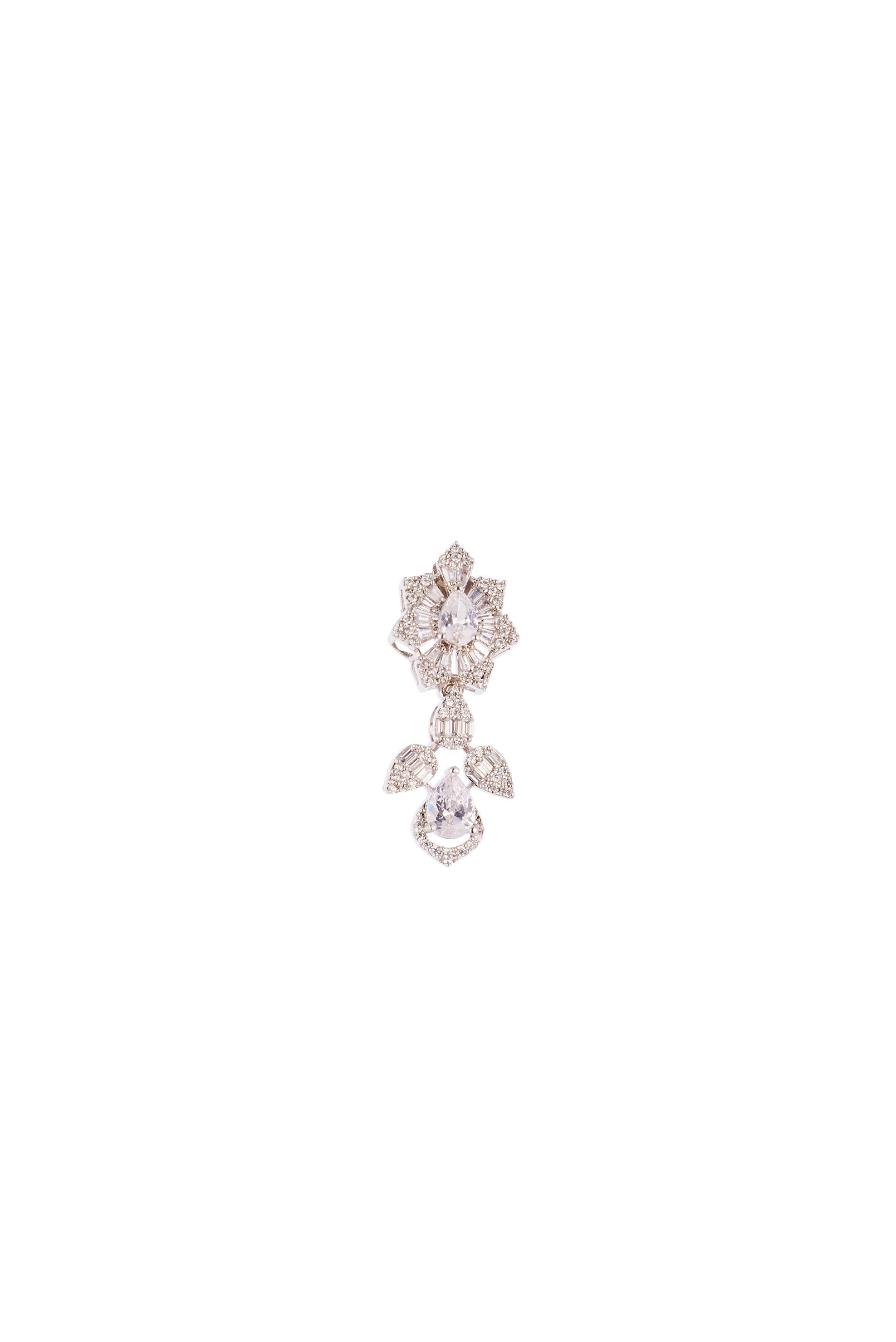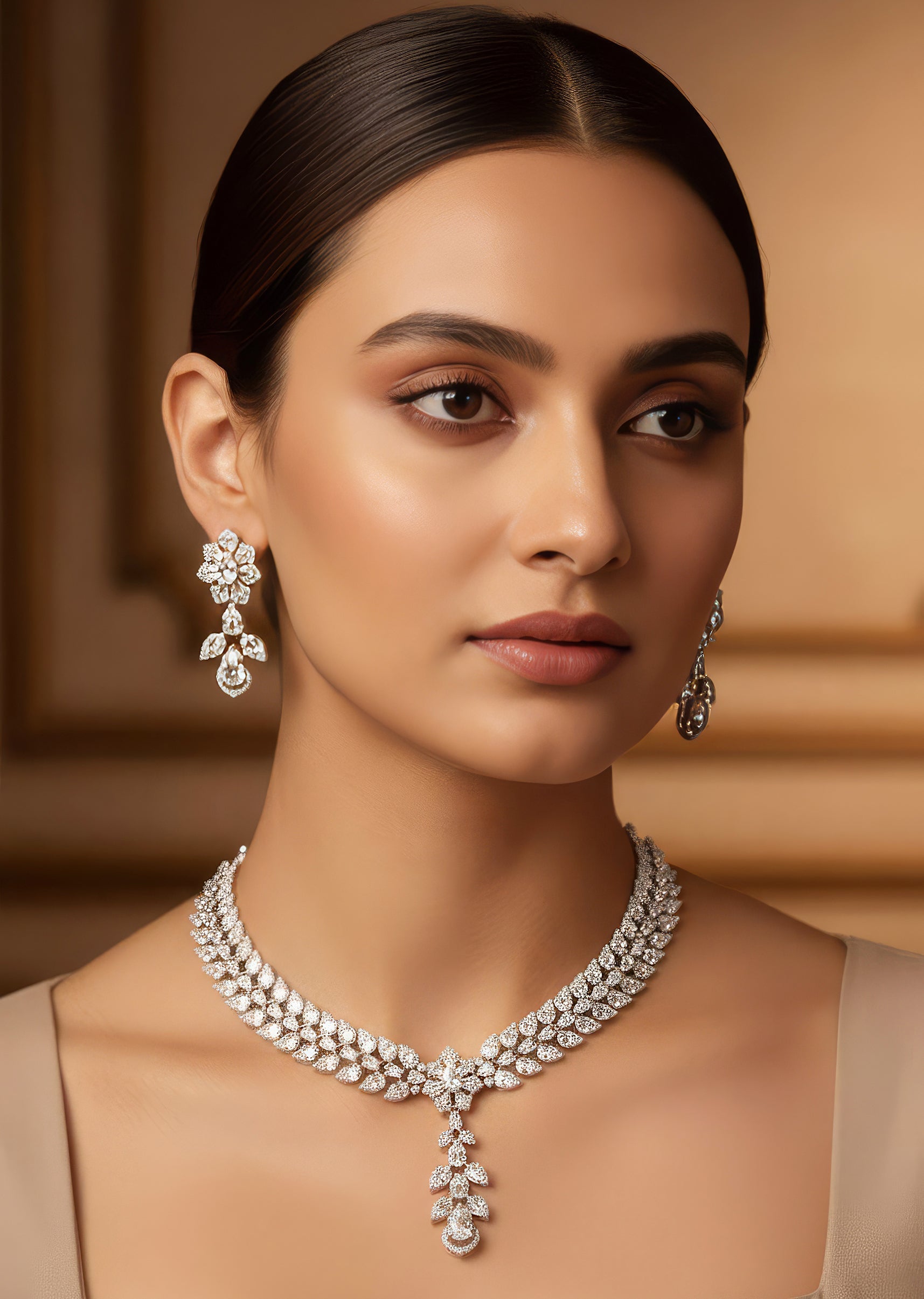A shimmering silver and white necklace set crafted with precision using contemporary zircon setting techniques. This handcrafted Indian jewelry piece offers a refined sparkle, making it a perfect choice for party nights, sangeet functions, and engagement celebrations as a guest to a wedding.