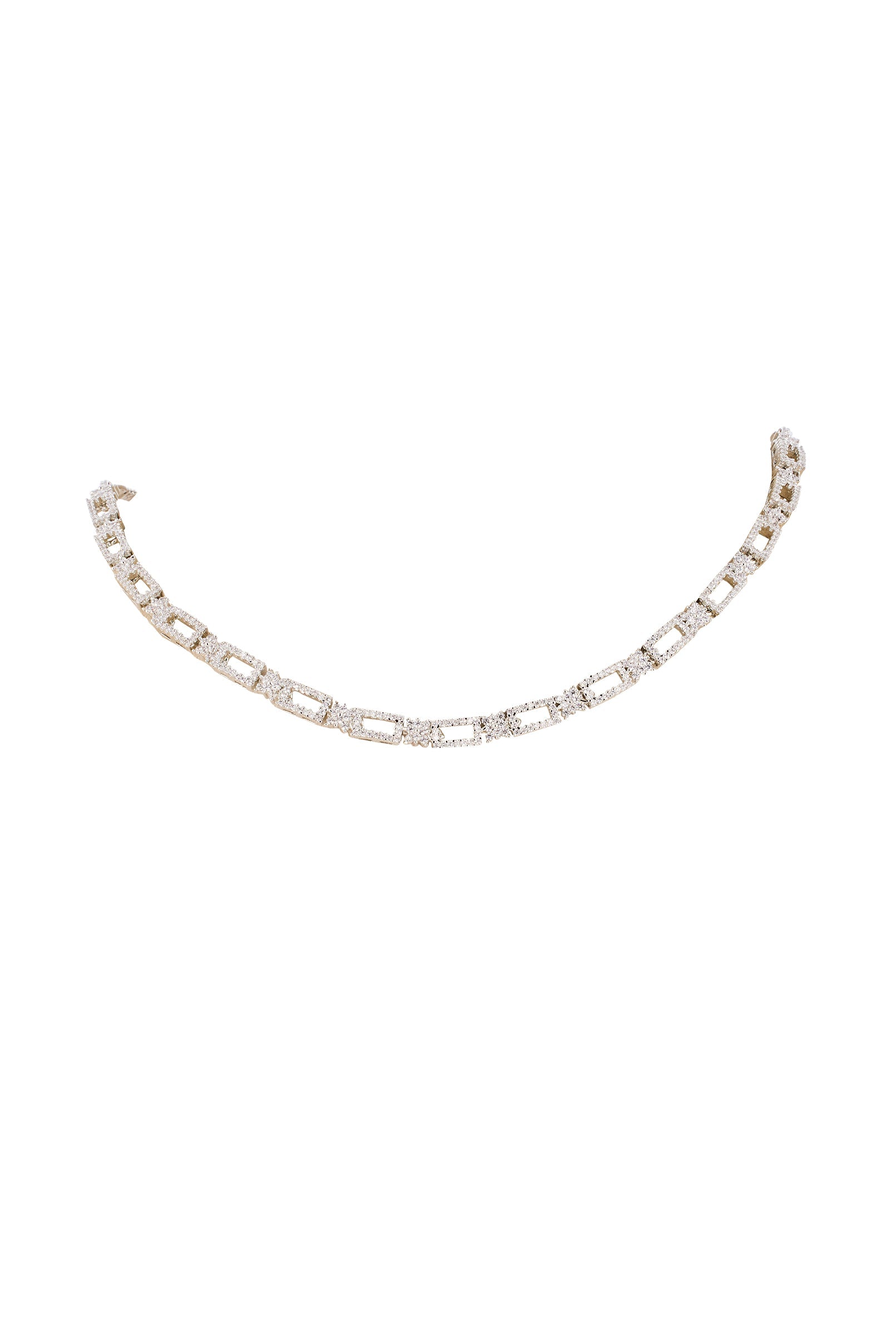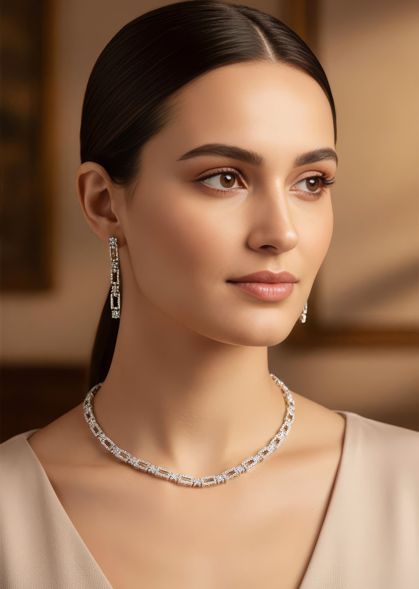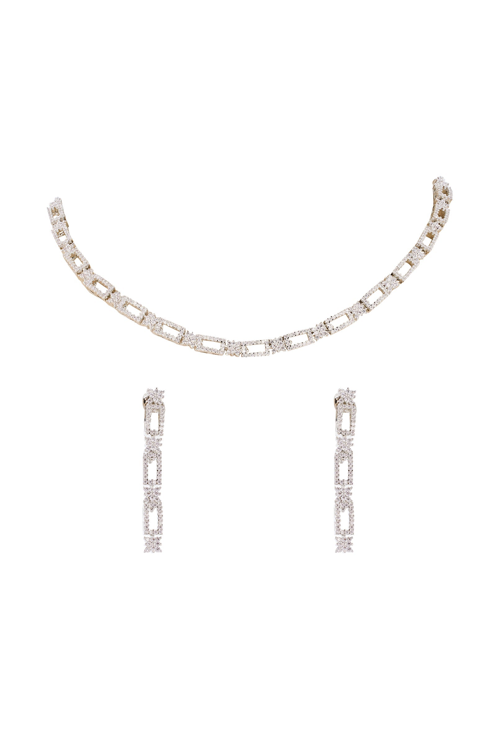 A refined silver and white necklace set adorned with shimmering zircons crafted in a modern contemporary technique. This handcrafted piece brings a polished sparkle that suits reception, cocktail nights, and elegant wedding guest looks. Its clean finish and radiant stones make it a versatile accessory for elevated festive styling.