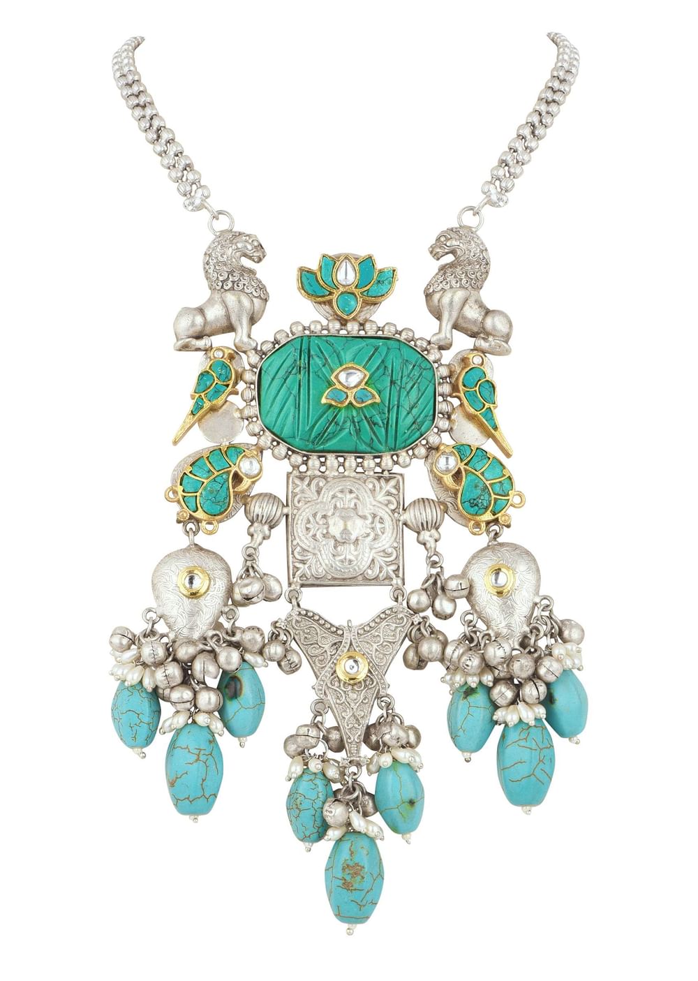 Experience the enchantment of our silver finish oxidised choker and earring set. Infused with mesmerizing blue toned kundan work and beads this versatile ensemble seamlessly blends traditional and contemporary styles.... More Product Details