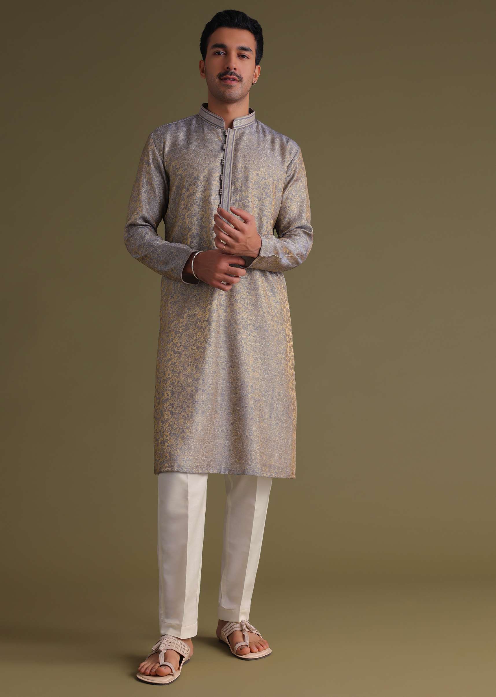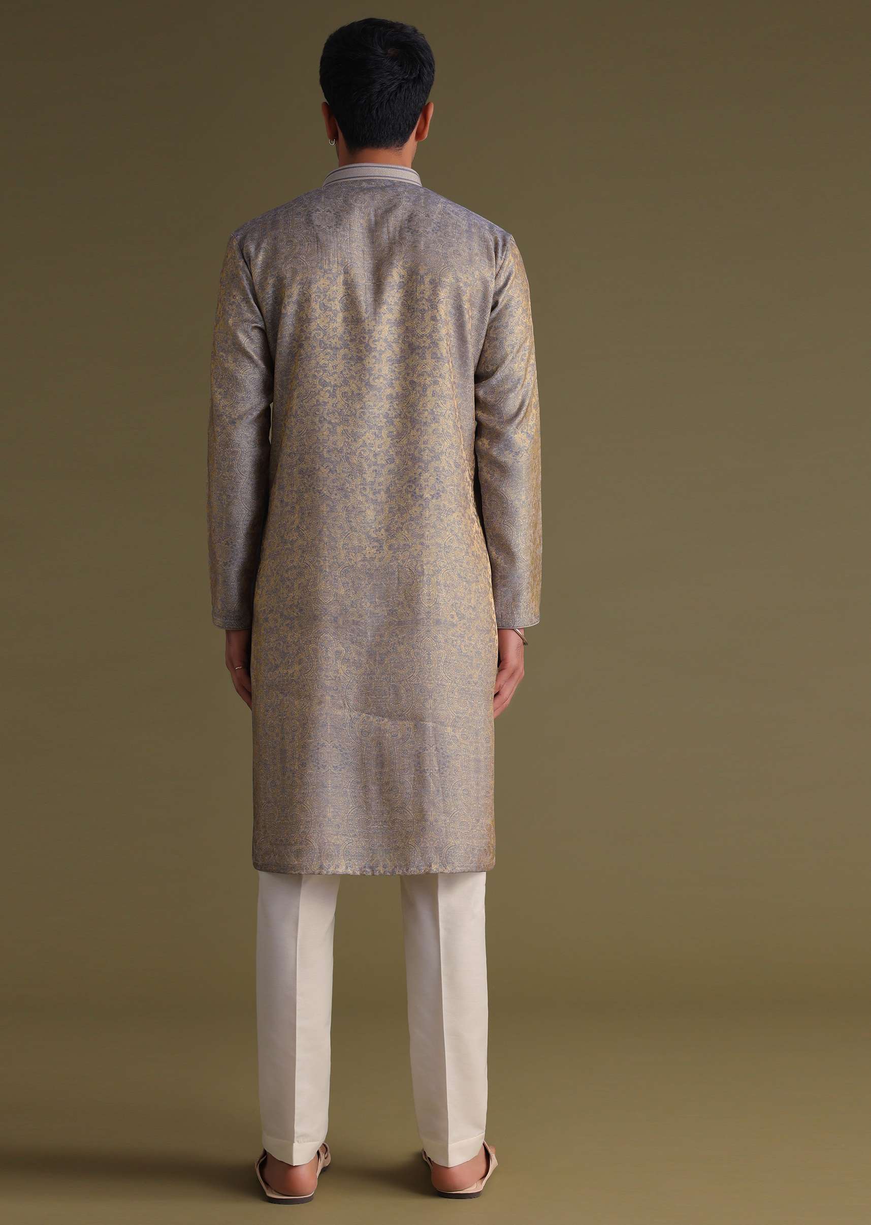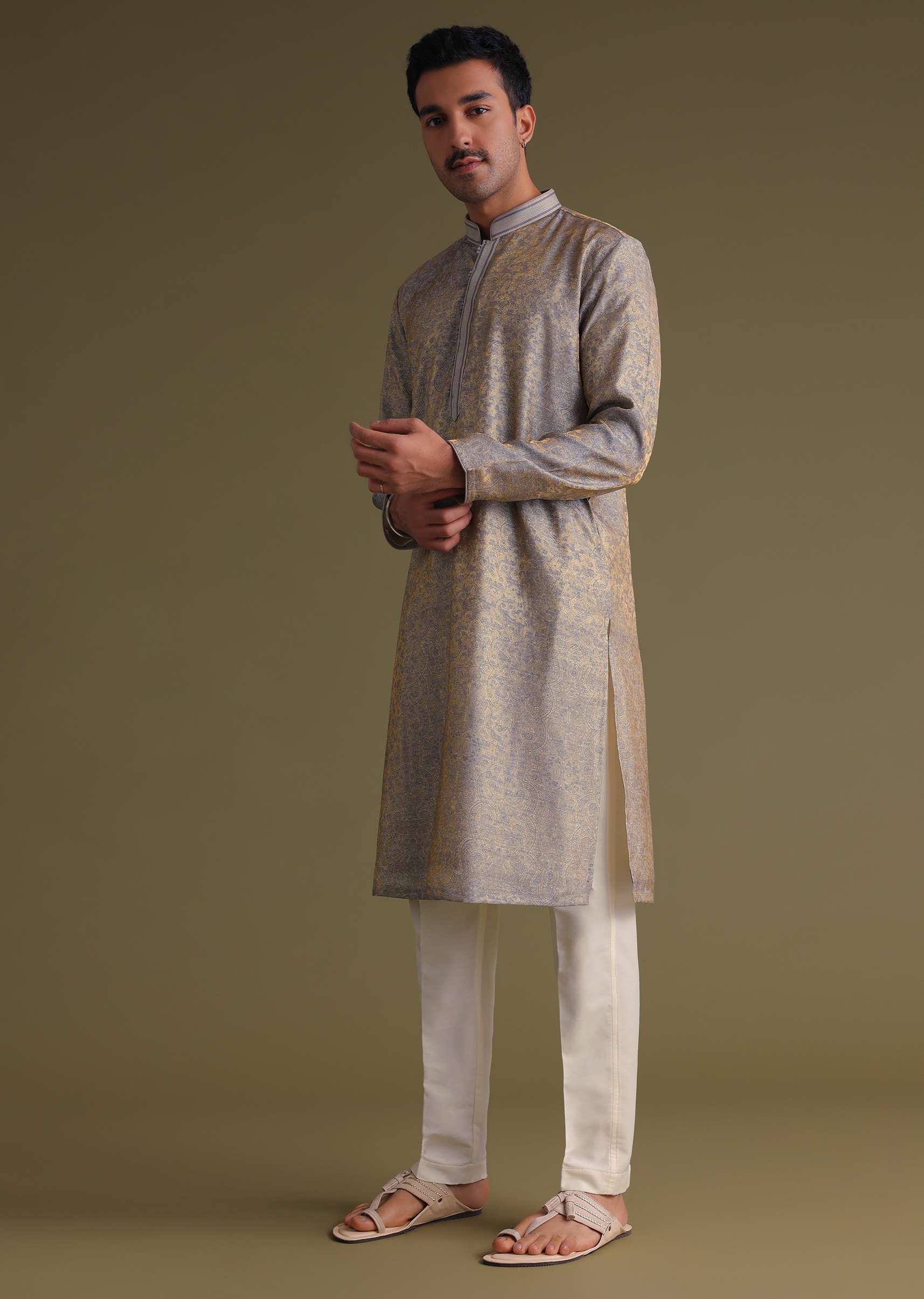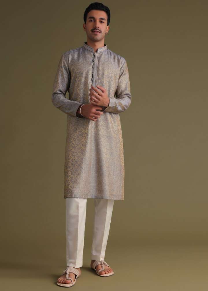 Silver Grey Festive Kurta Set With Golden Floral Print In Jacquard