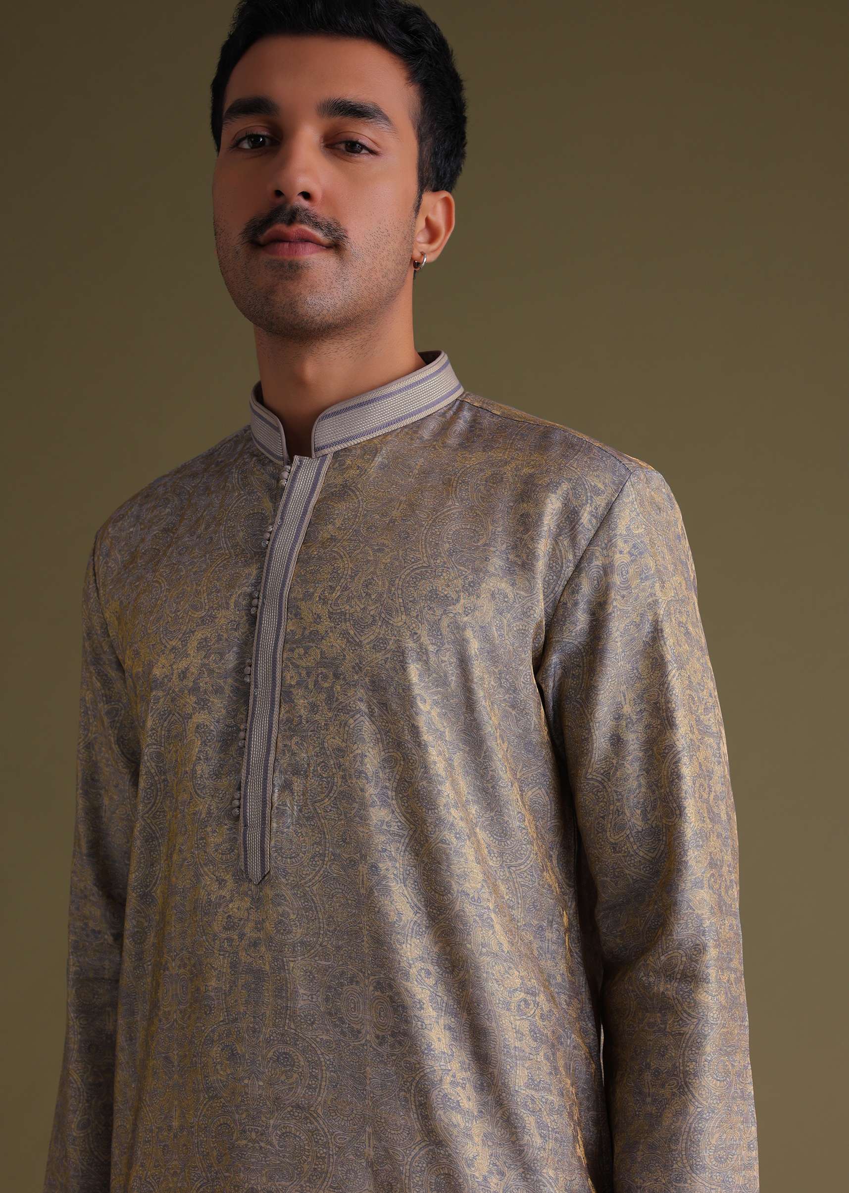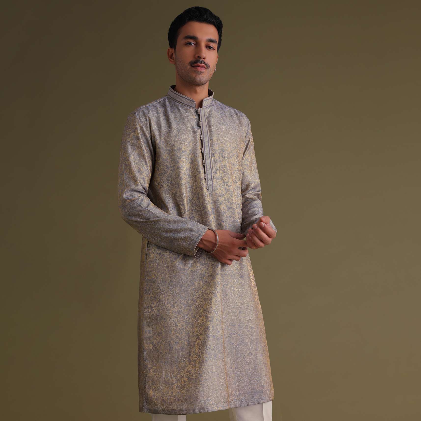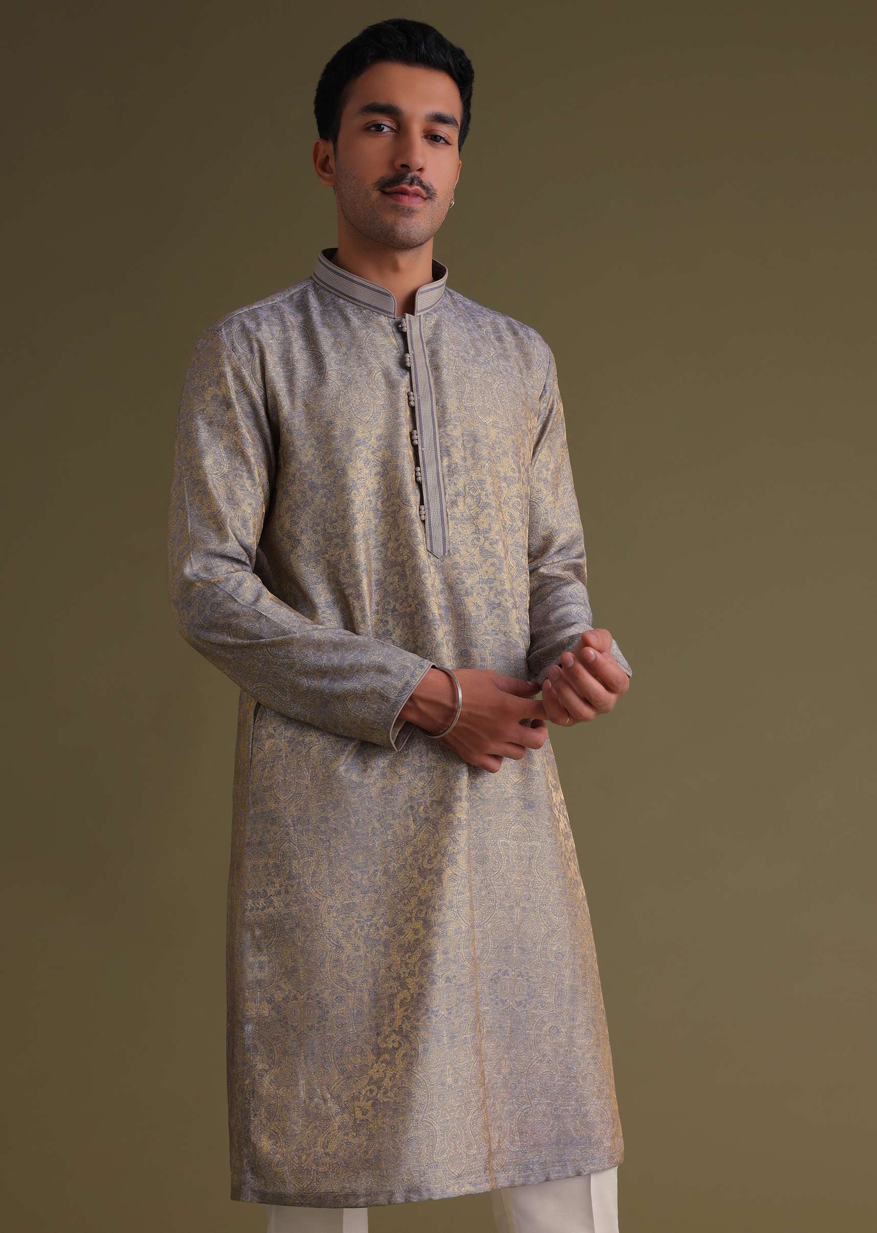 Silver Grey Festive Kurta Set With Golden Floral Print In Jacquard