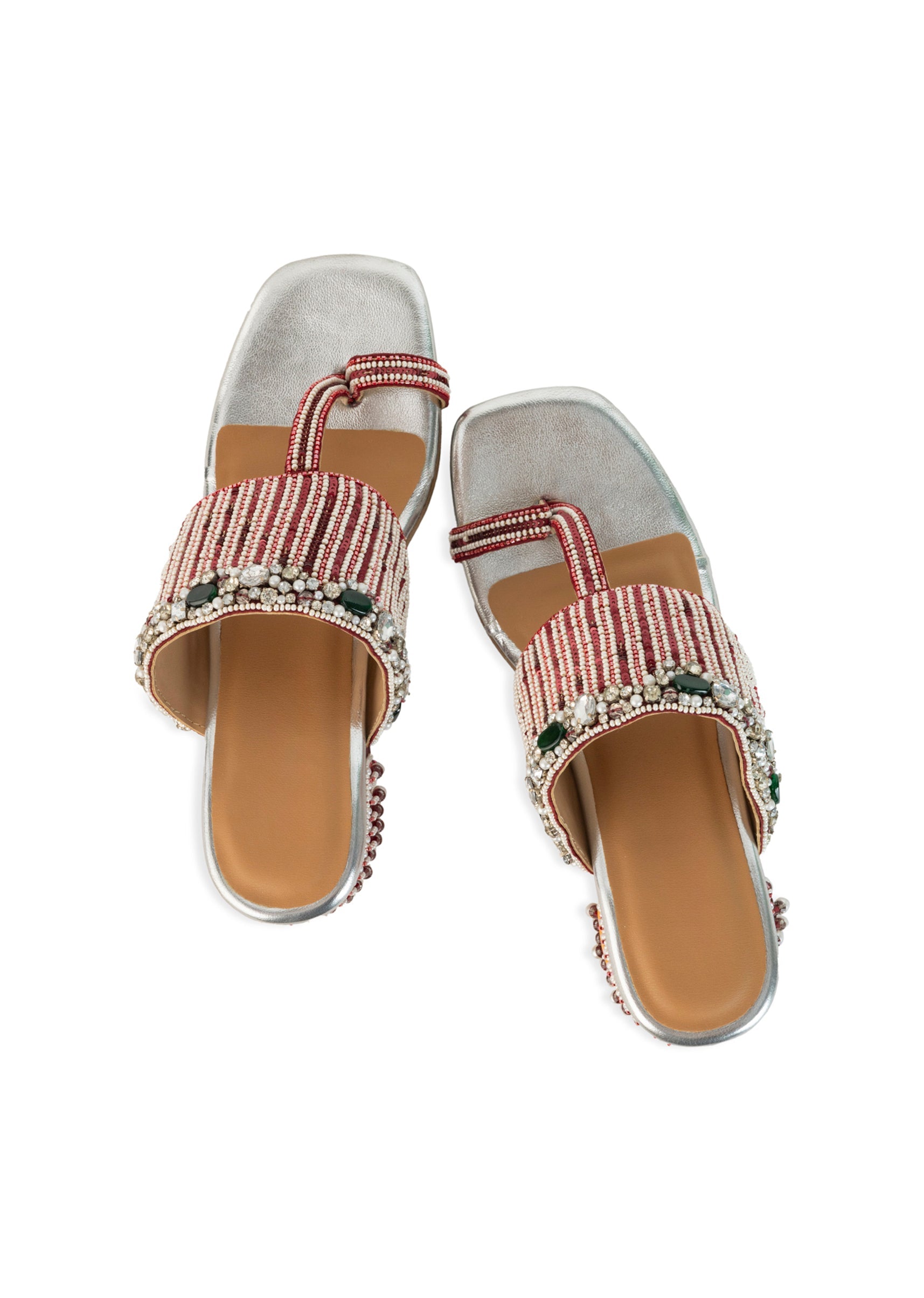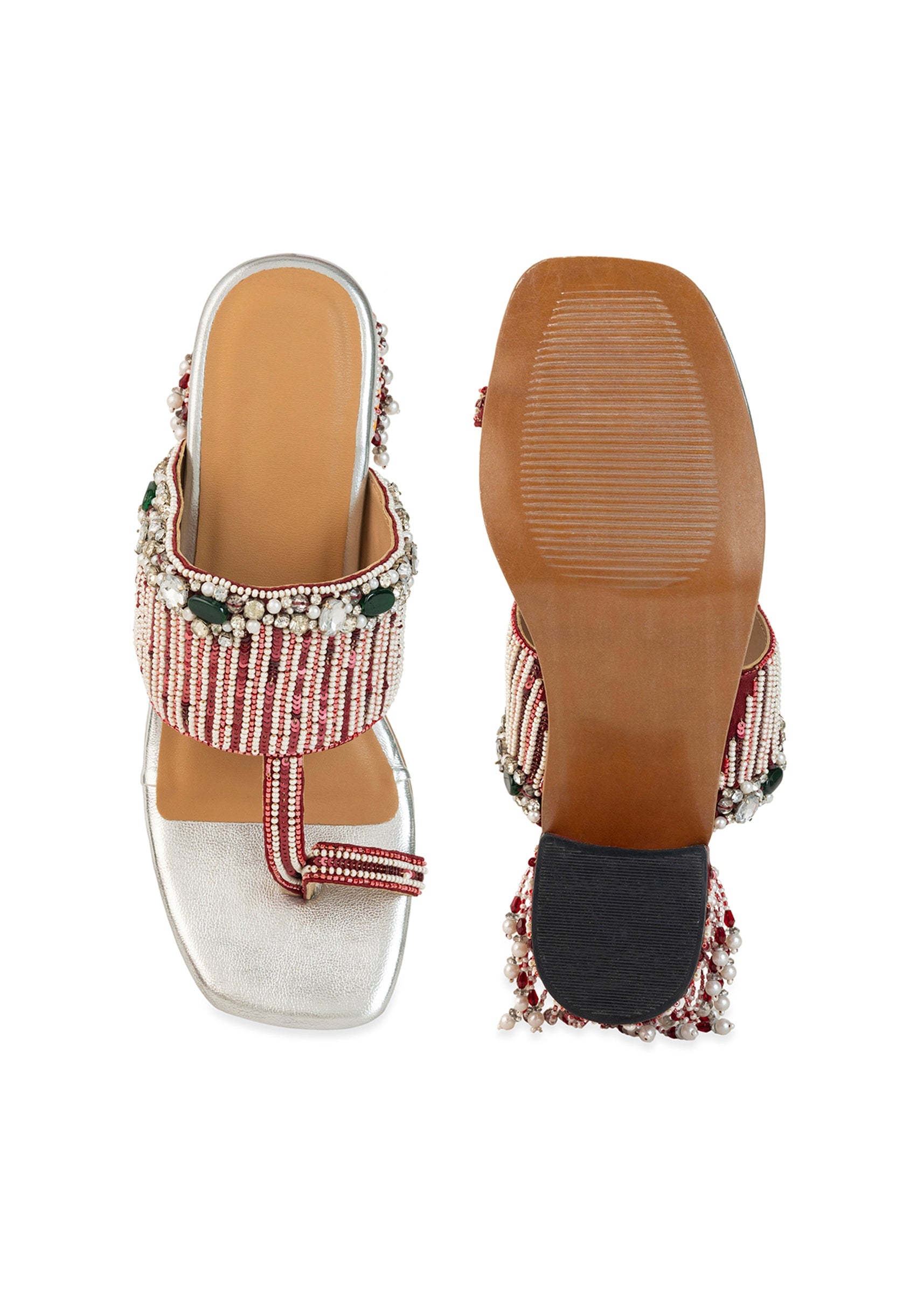 Make every occasion feel special with silver heels that feature deep maroon velvet straps intricately hand embellished with pearls, beads, and emerald green stones. Set on smooth faux leather, they blend rich texture with an elegant festive sparkle. The detailed moti and embroidery work adds a regal touch perfect for weddings, receptions, and evening celebrations. Designed to shine with every step, they bring a bold luxurious charm to your look. Awarded as the Most Trusted Brand, we're delivering styles you love, just as promised.