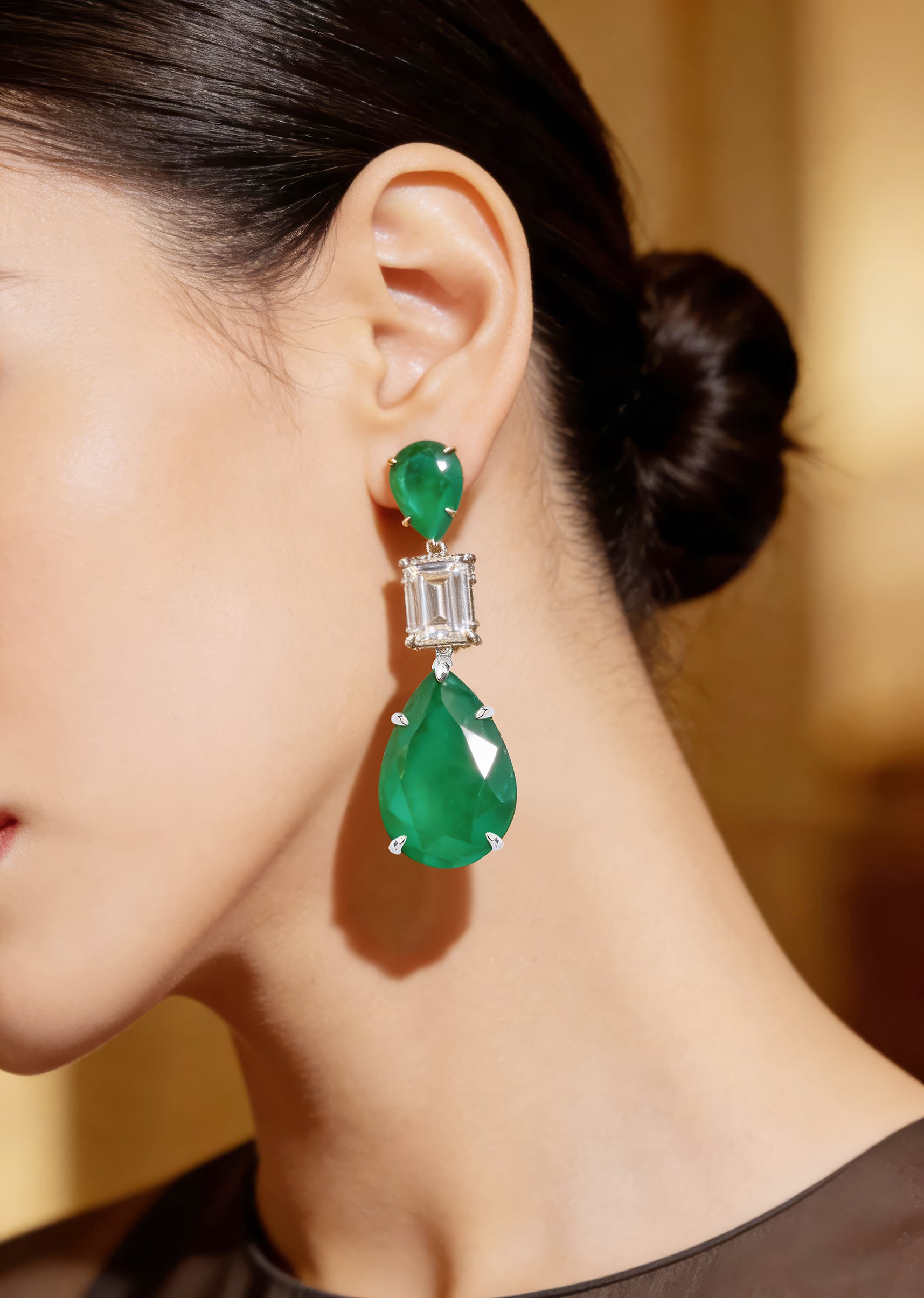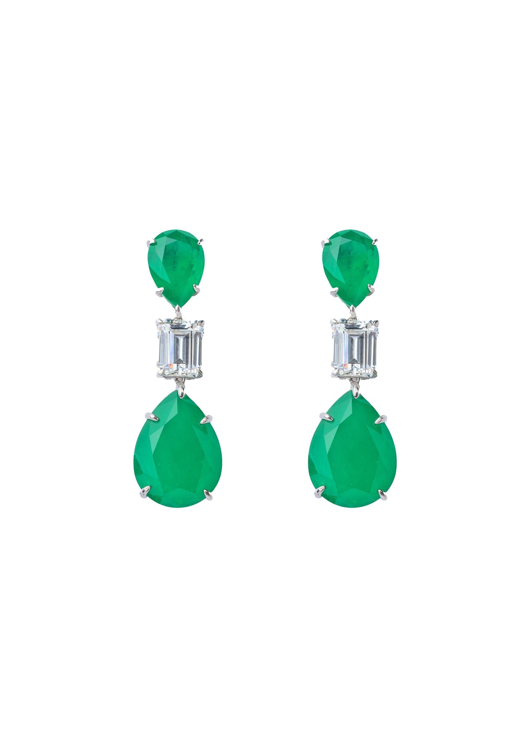 Sophisticated drop earrings featuring pear-shaped green stones and baguette-cut clear crystals in a silver-tone setting. Elegant and timeless, perfect for evening wear or special occasions. Product dimensions may vary slightly.... More Product Details