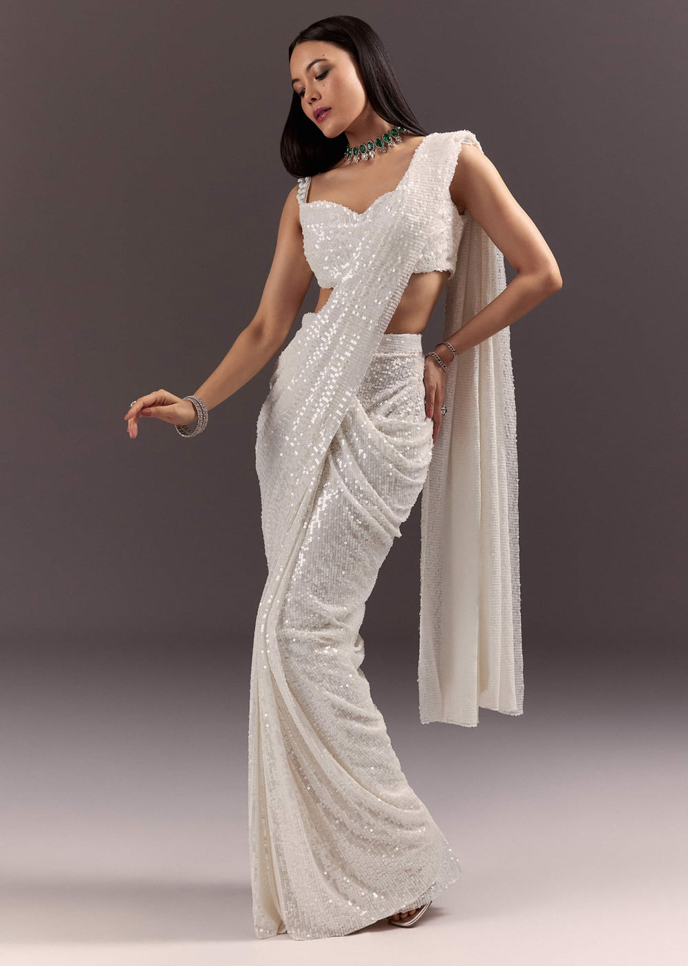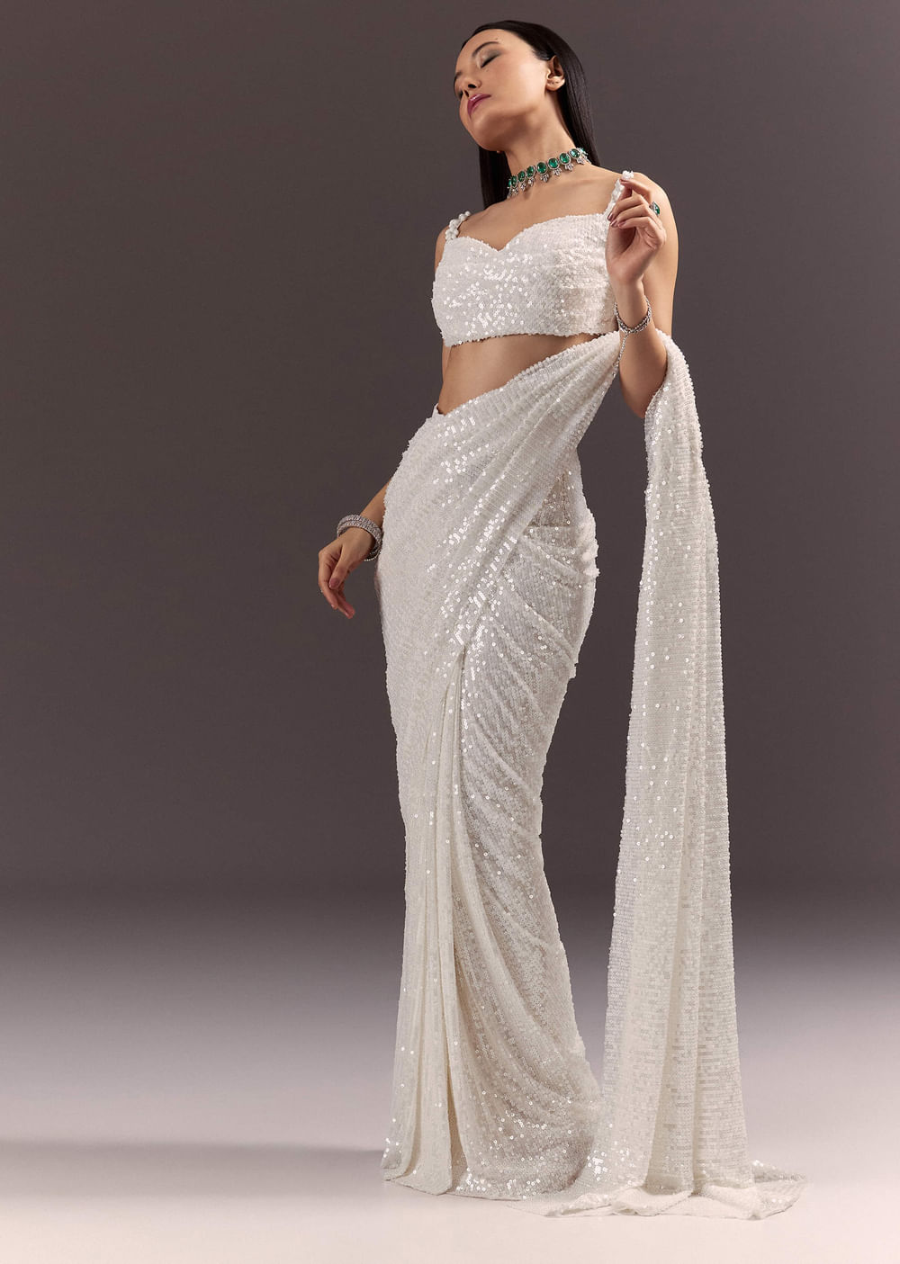 This silver ensemble glows with cut dana embroidery and timeless poise. The blouse’s rounded neckline adds charm to the fluid silhouette. Graceful and gleaming, ideal for starlit weddings and parties.... More Product Details