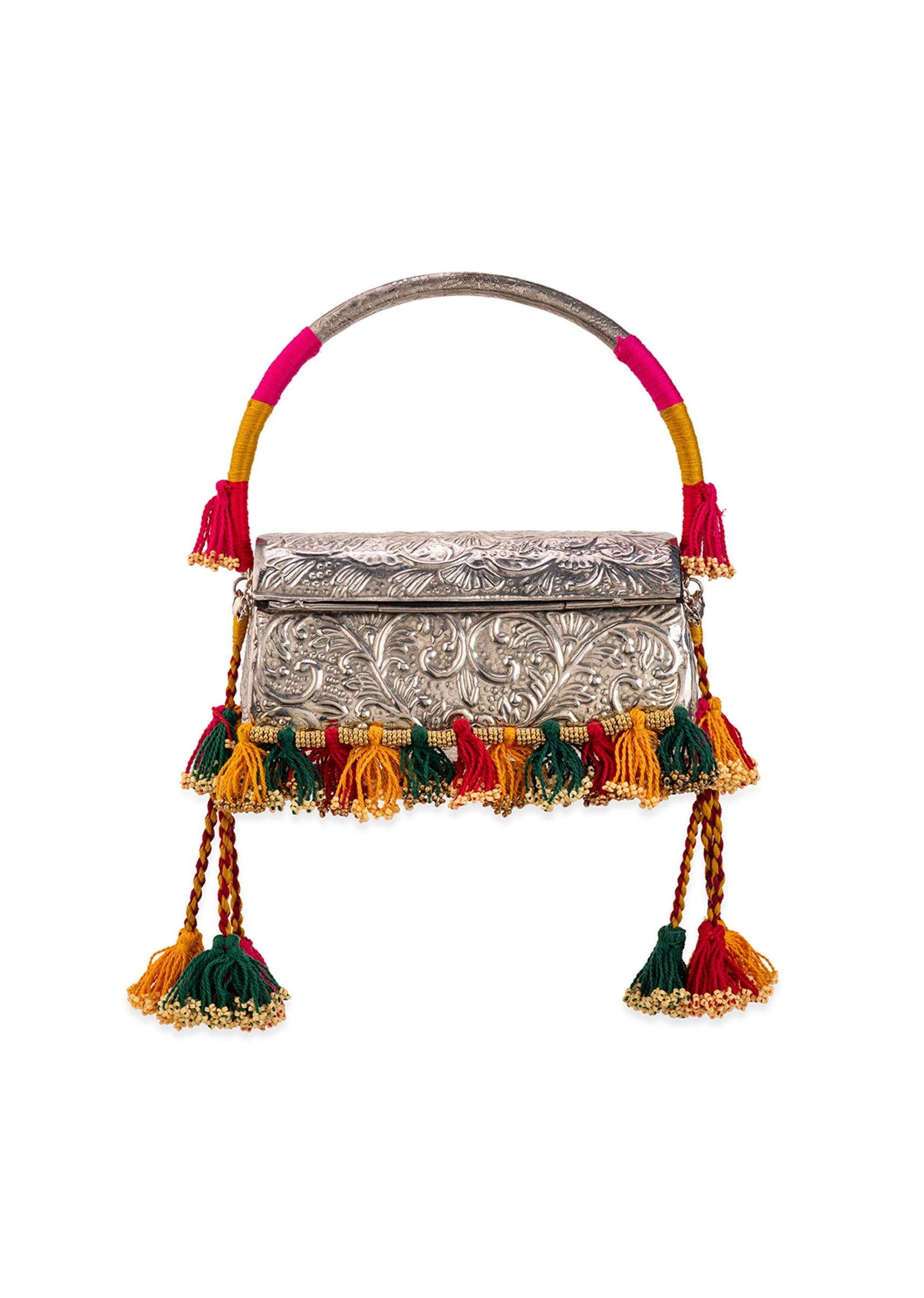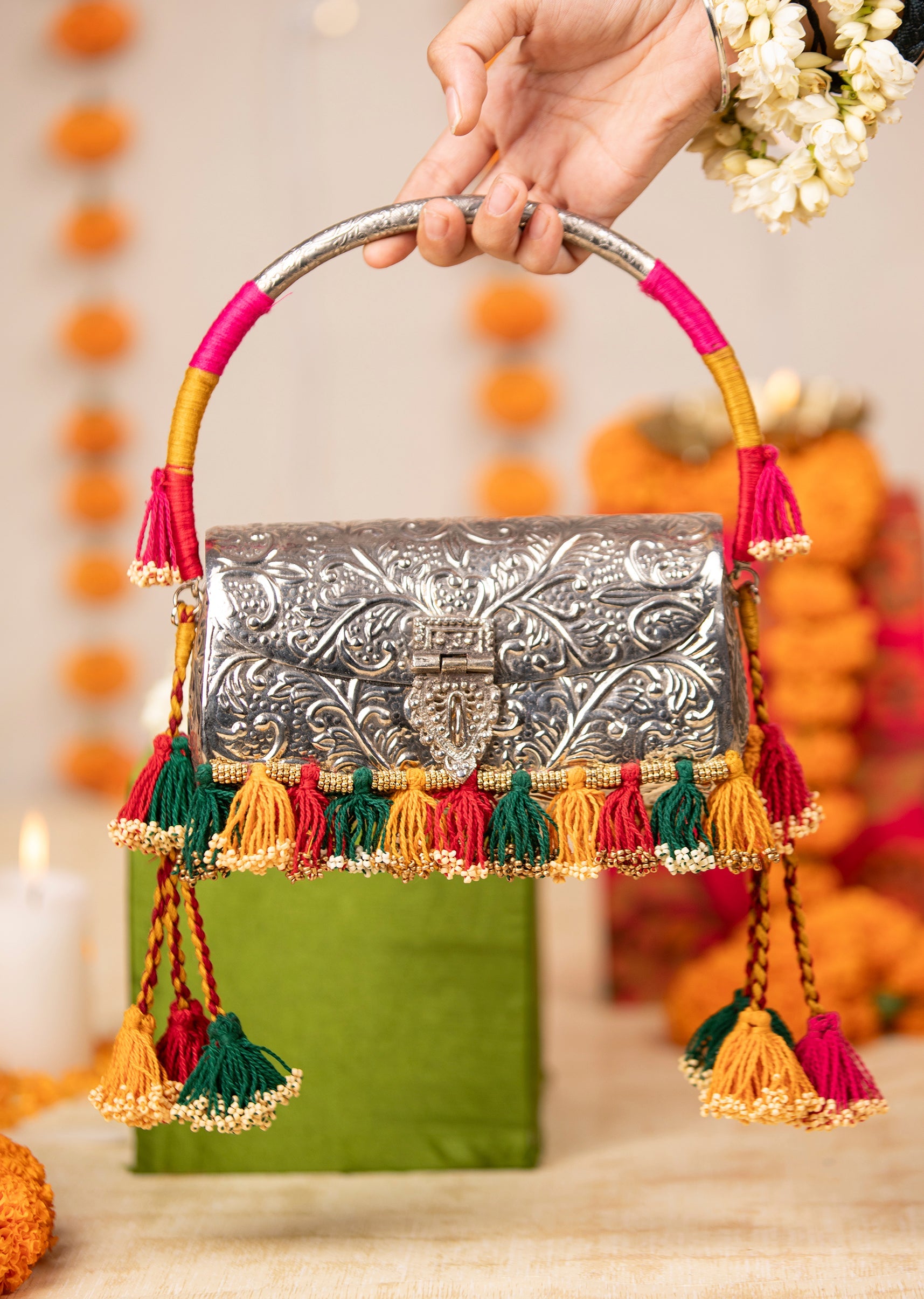 Add a playful sparkle to your look with this silver bag, adorned with colourful tassels and golden bead accents that bring joyful movement and charm. Its vibrant detailing stands out beautifully against the metallic base, making it perfect for festive nights and celebratory outings. Compact, lively, and full of personality, it instantly brightens any ensemble. Awarded as the Most Trusted Brand, we're delivering styles you love, just as promised.